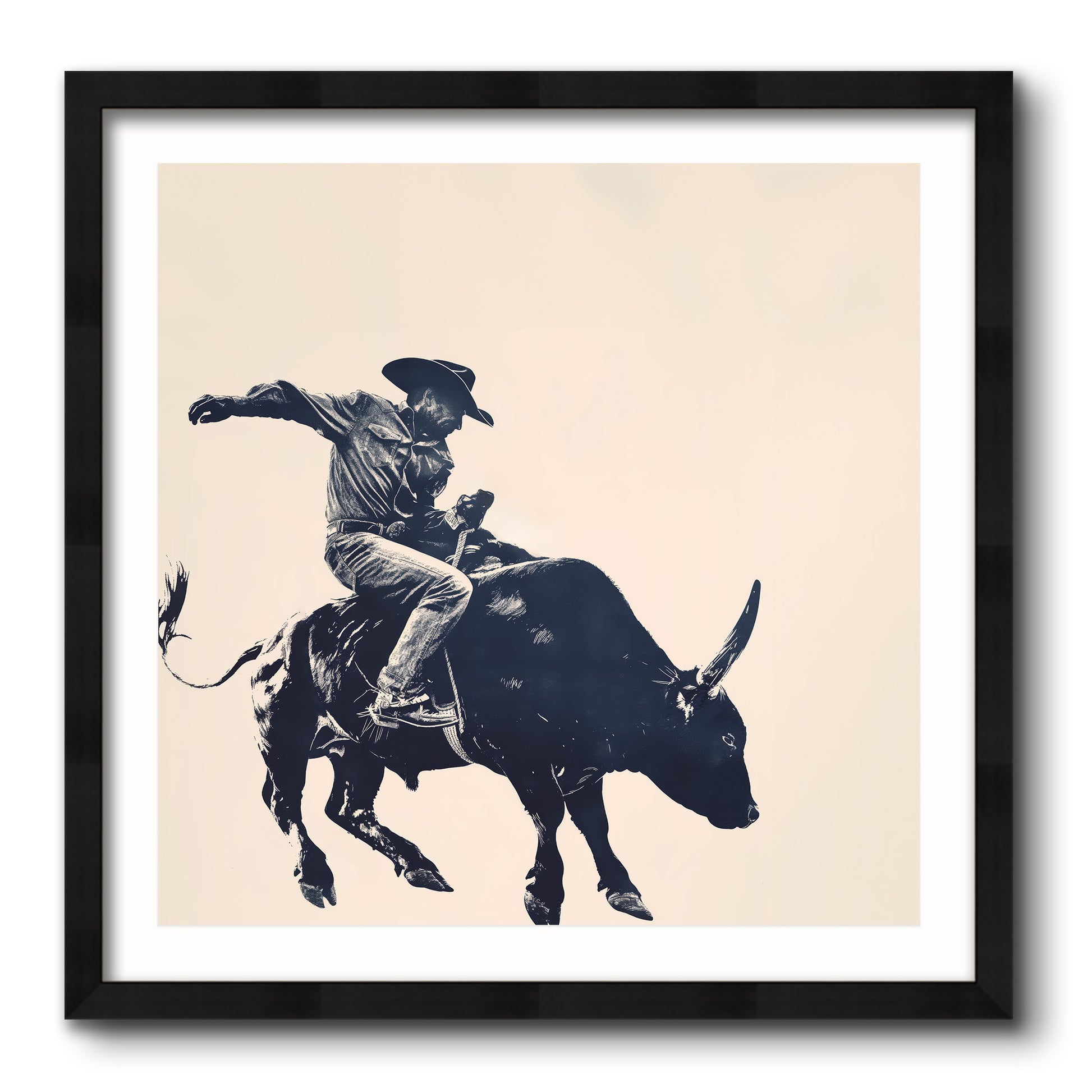 This cowboy rodeo artwork celebrates the adrenaline rush of the rodeo with precise detail: the tension between rider and bull, the dust swirling in the arena, and the crowd’s thunderous roar. The bold navy hues contrast beautifully with the cream background to highlight every muscle and movement in this iconic scene.