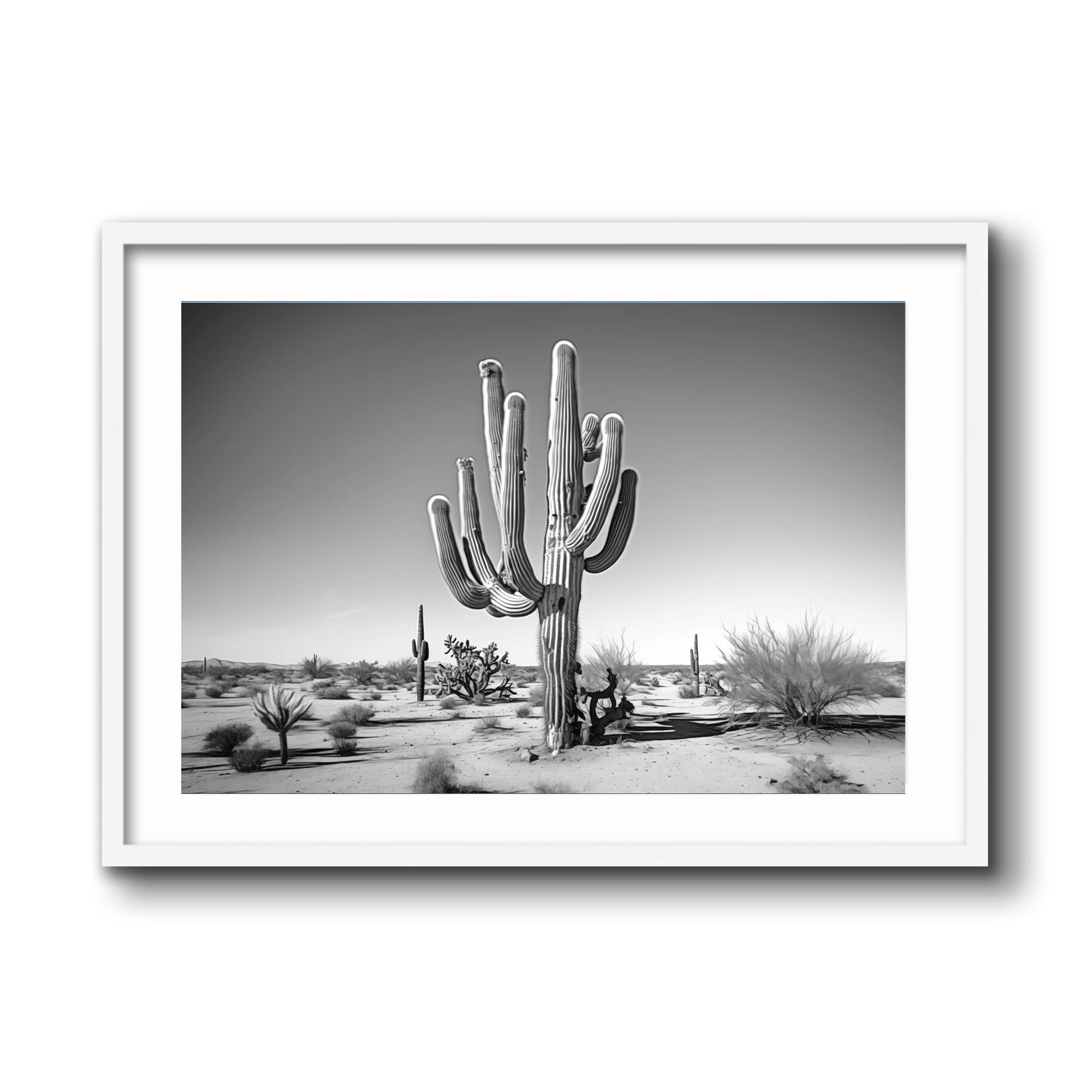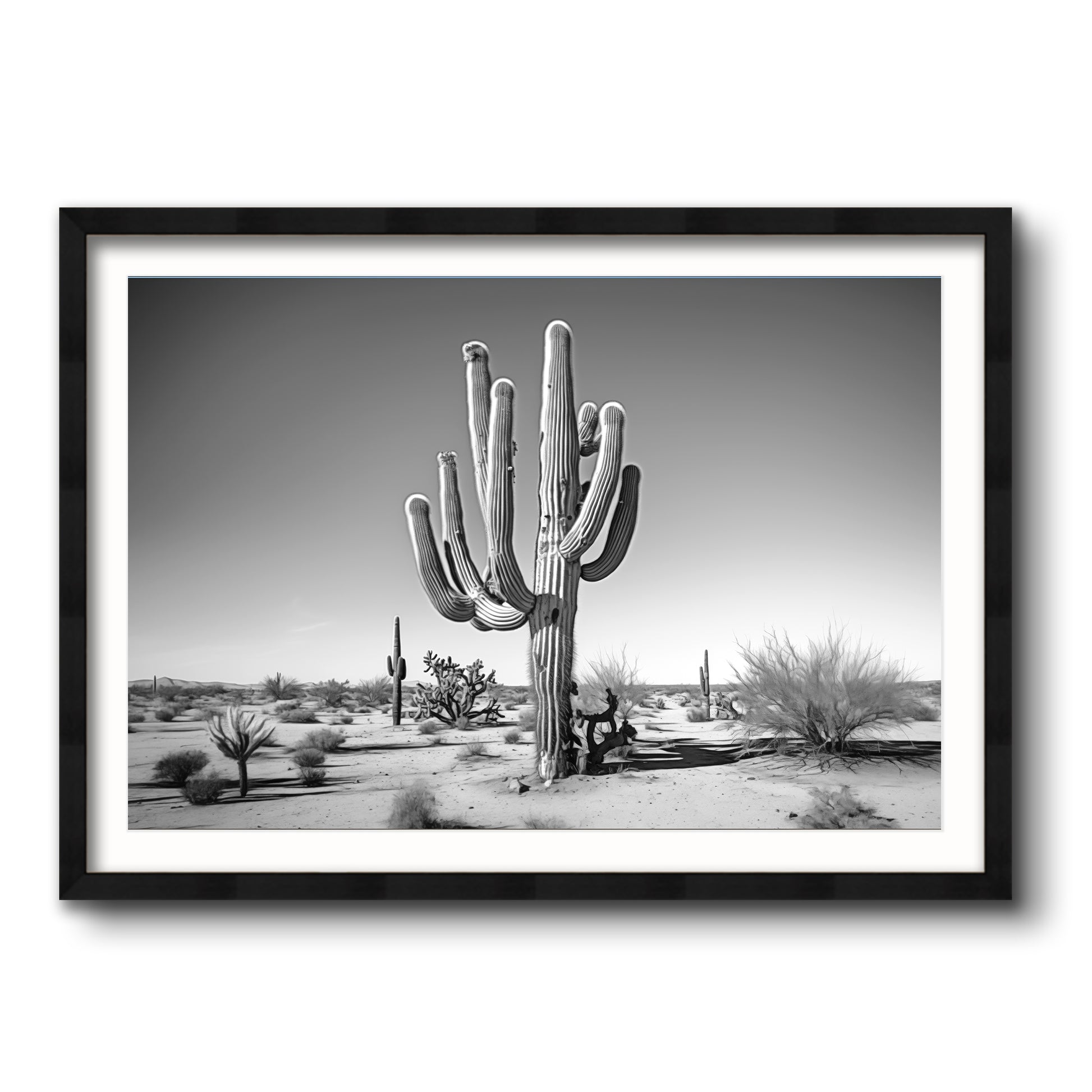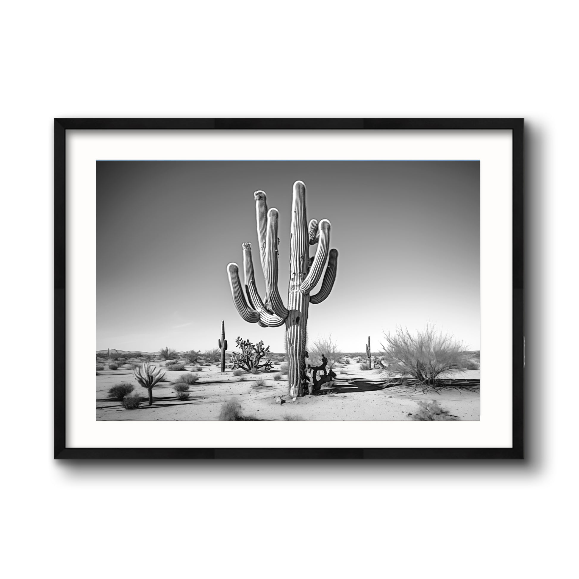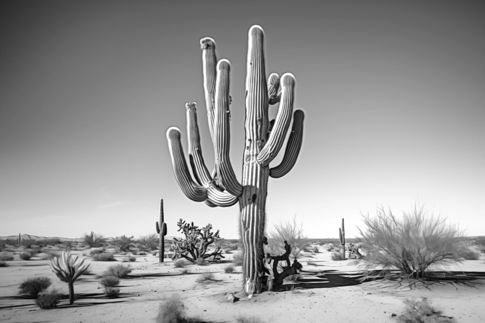 Black & White Photograph of a saguaro cactus in the Arizona desert.