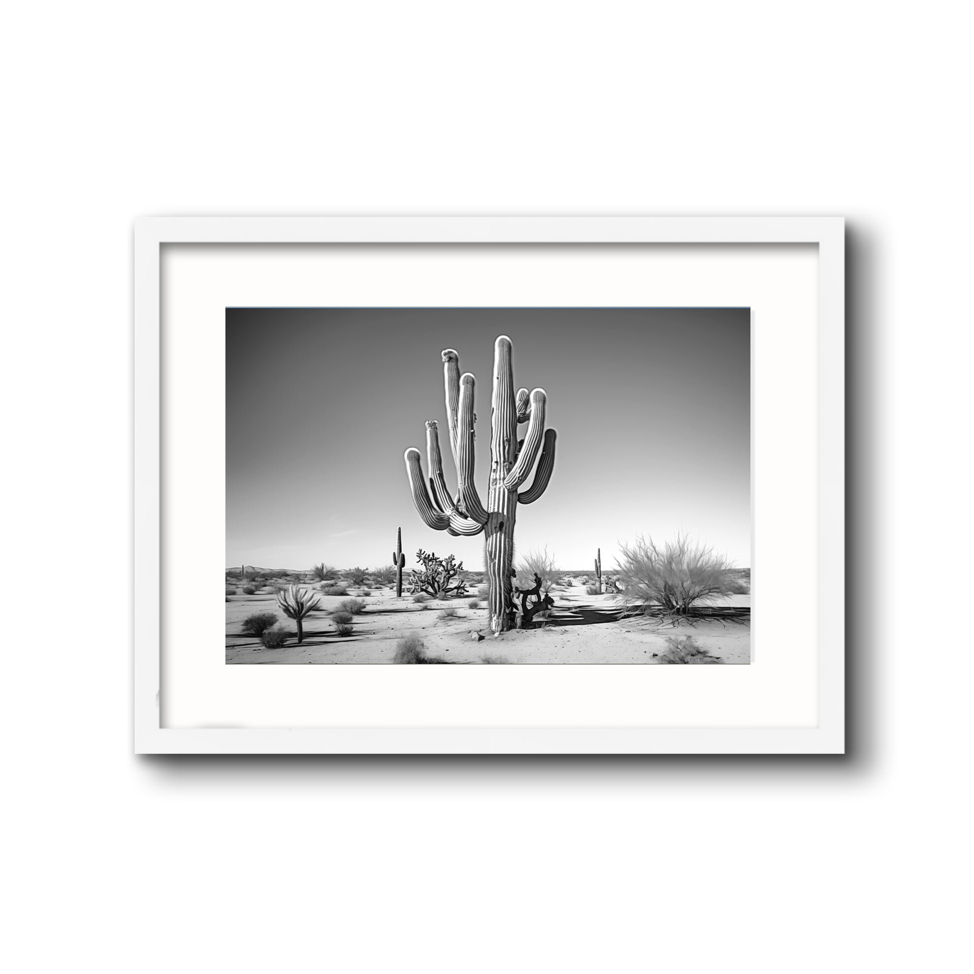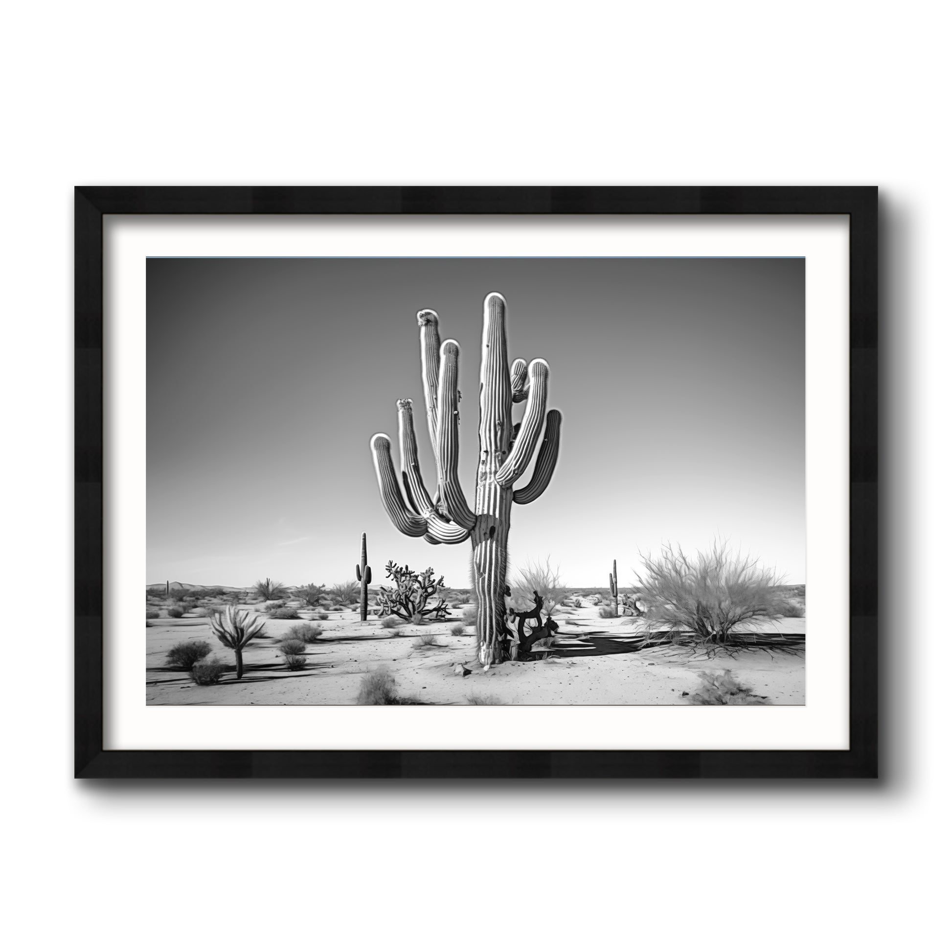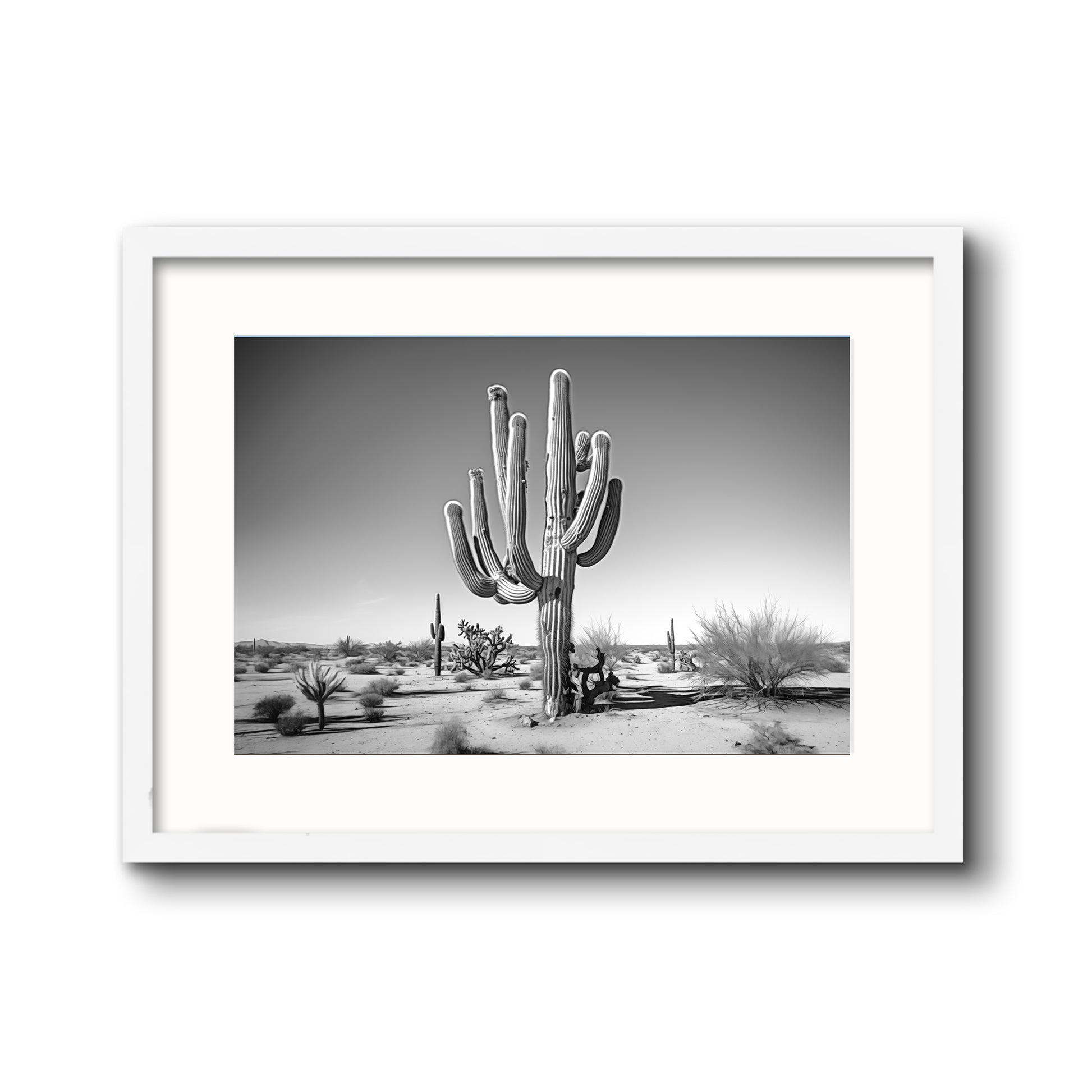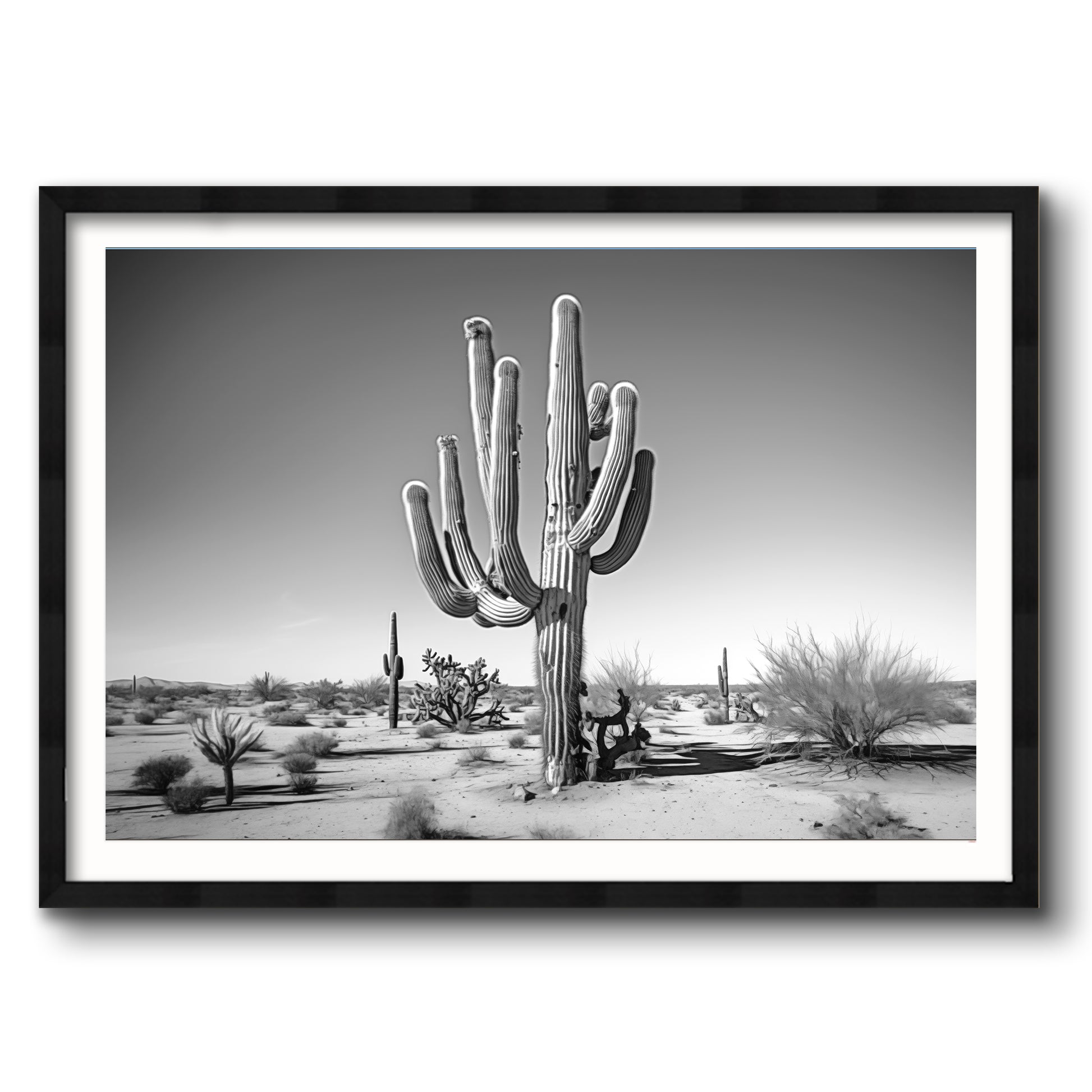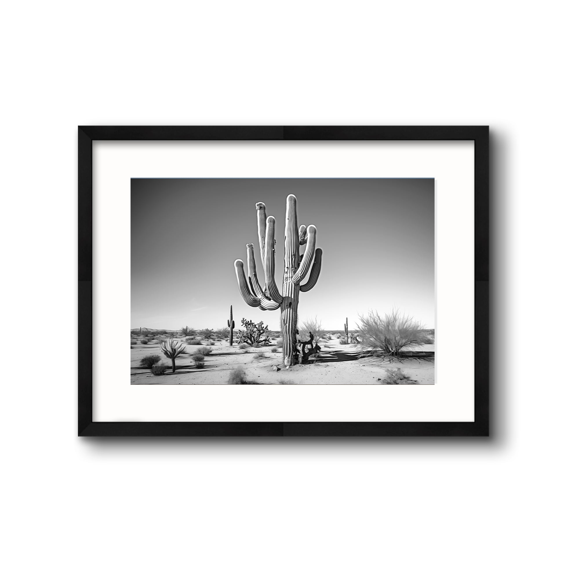 Black & White Photograph of a saguaro cactus in the Arizona desert.
