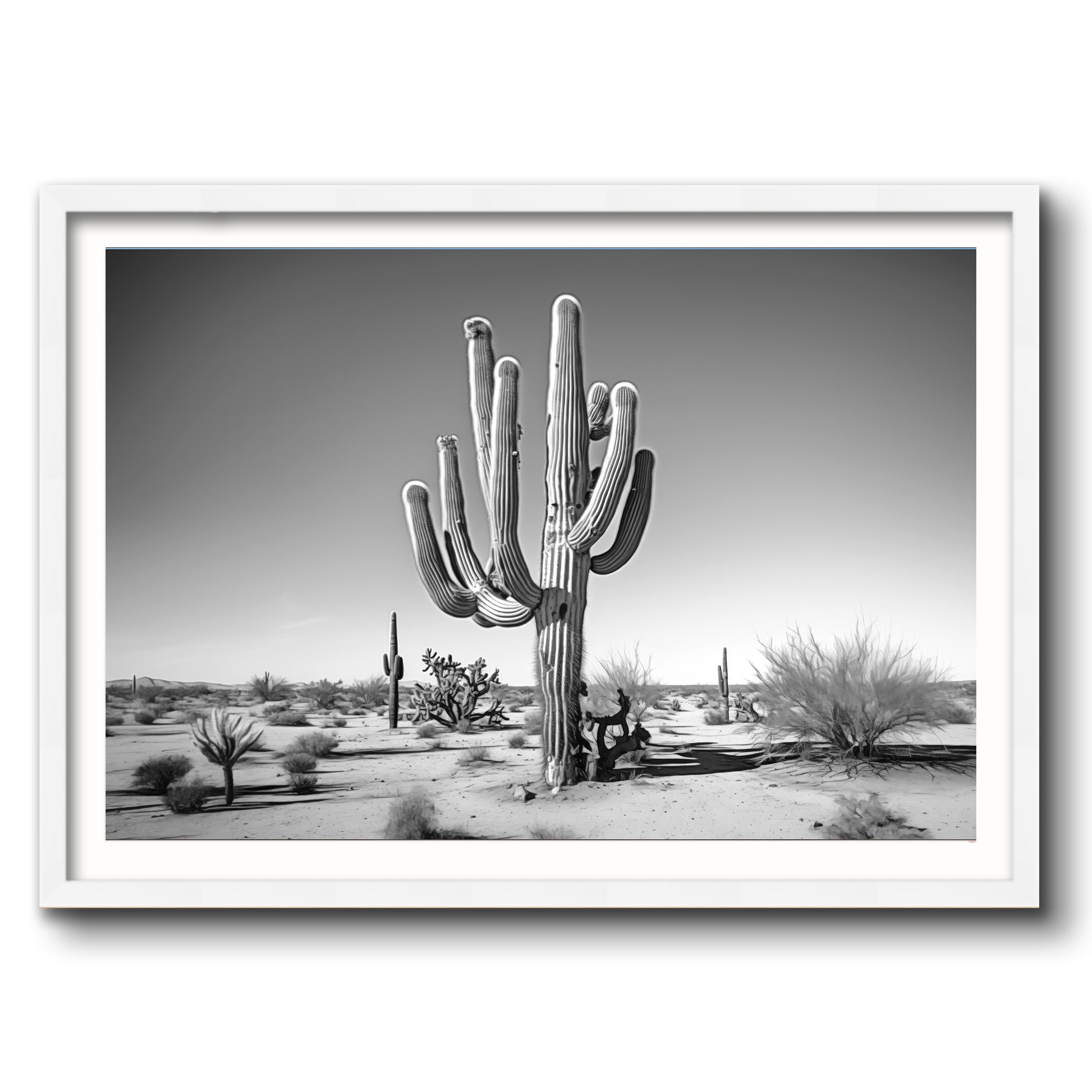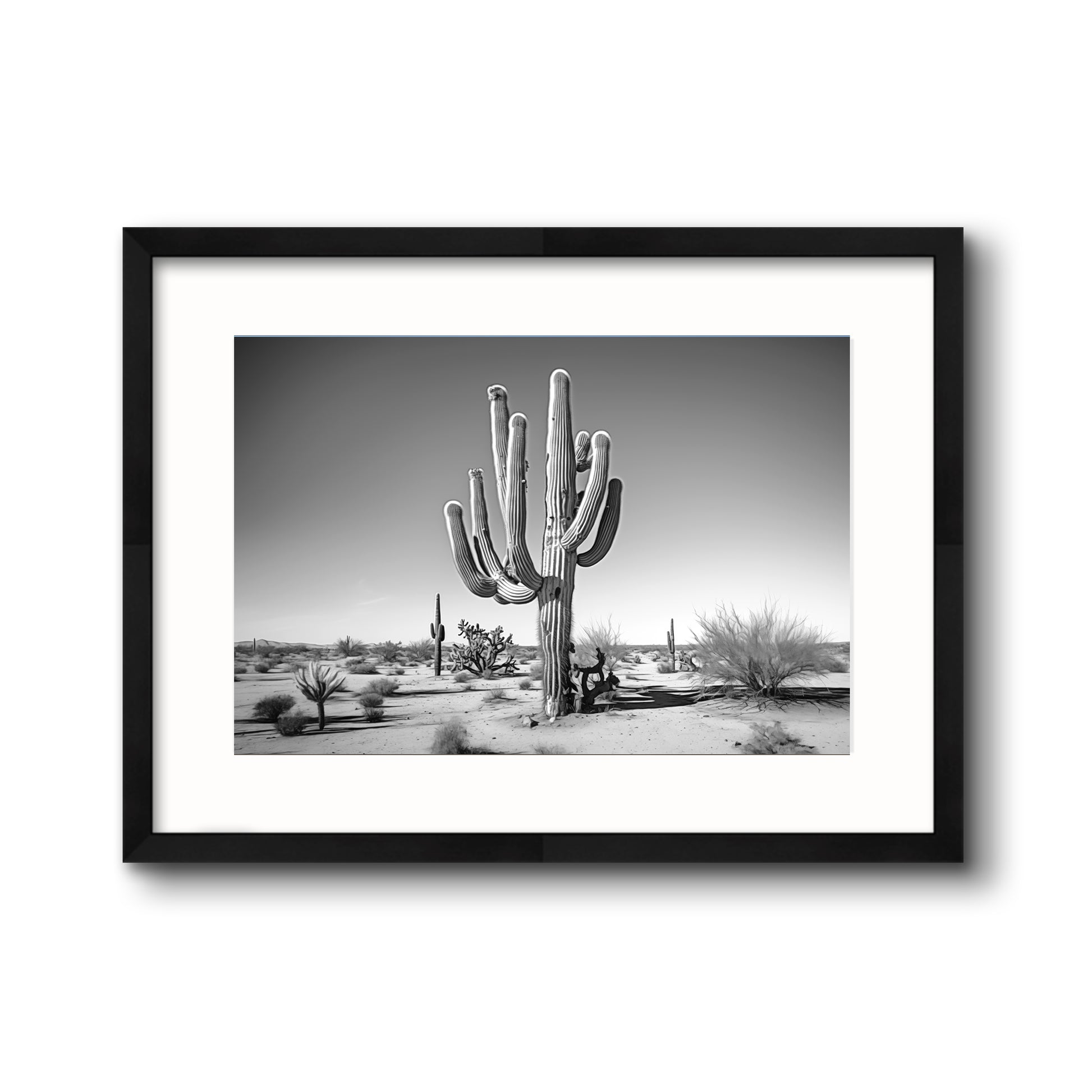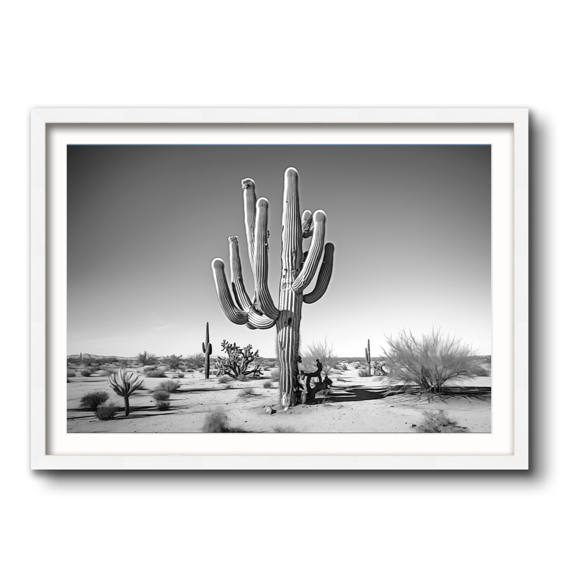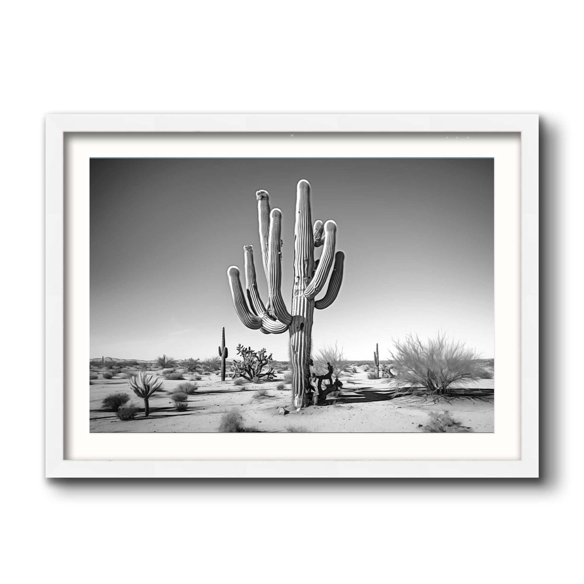 Black & White Photograph of a saguaro cactus in the Arizona desert.