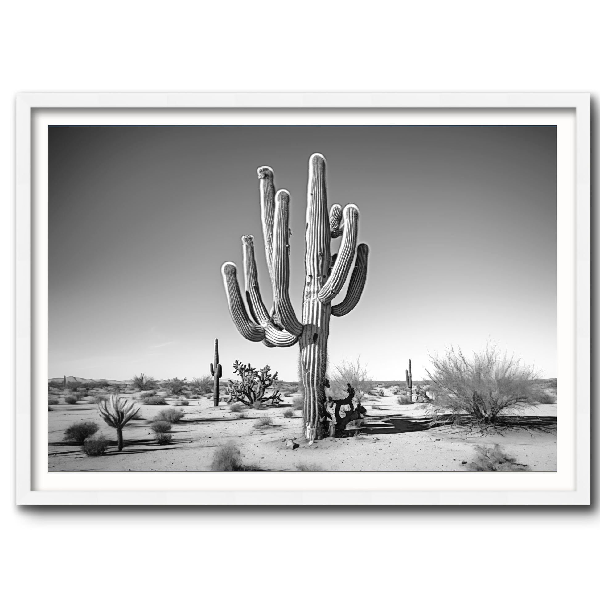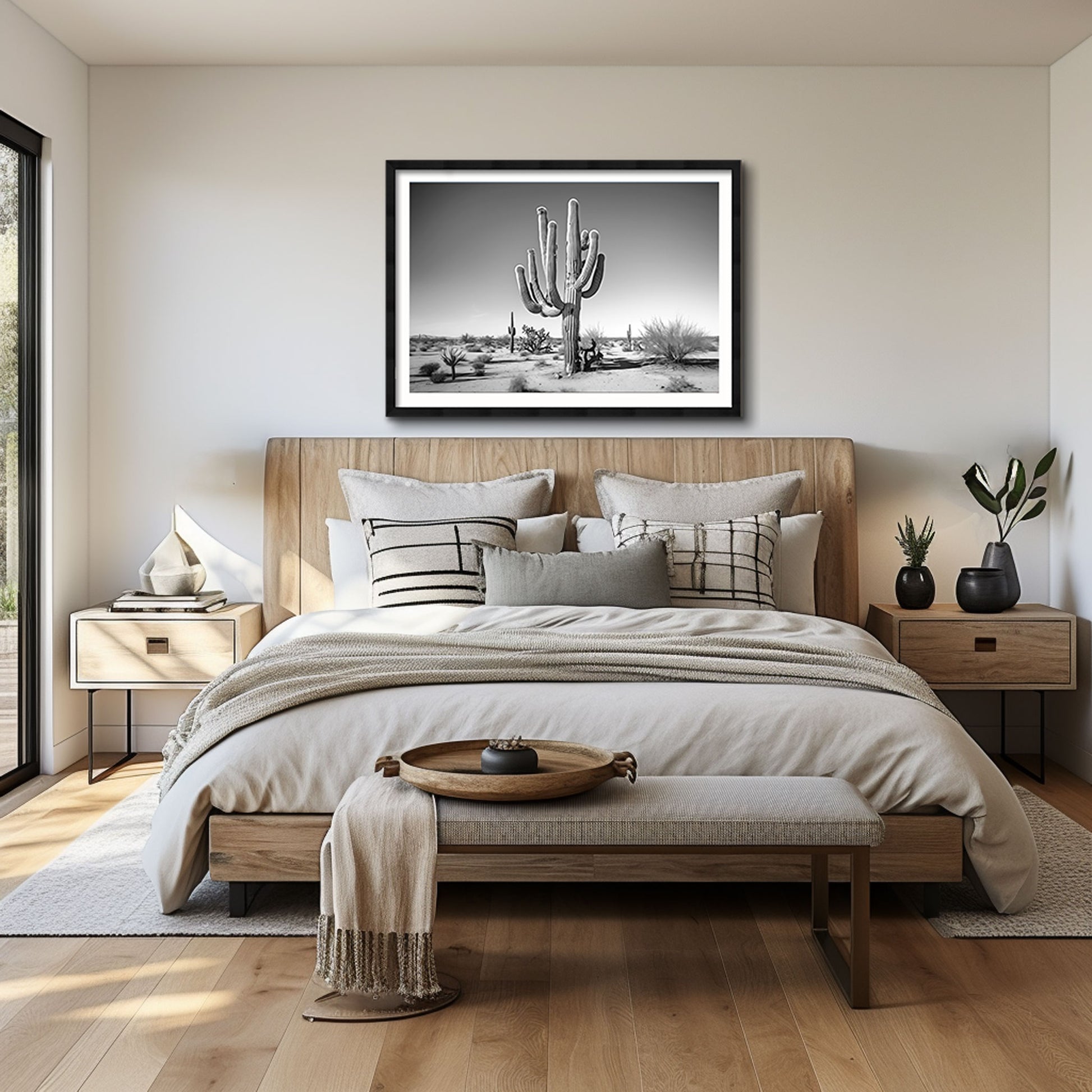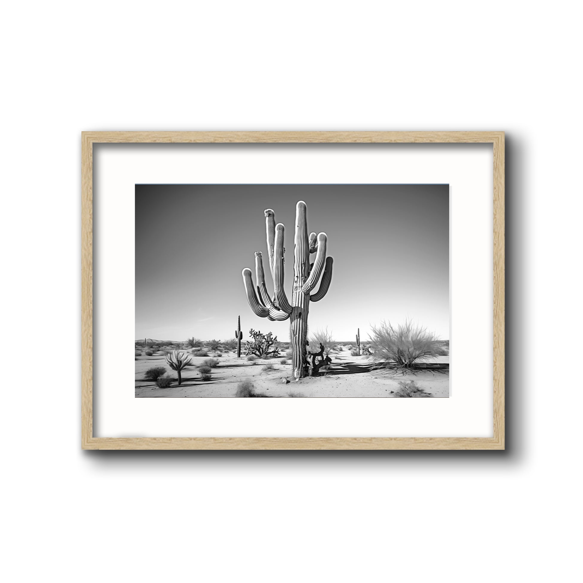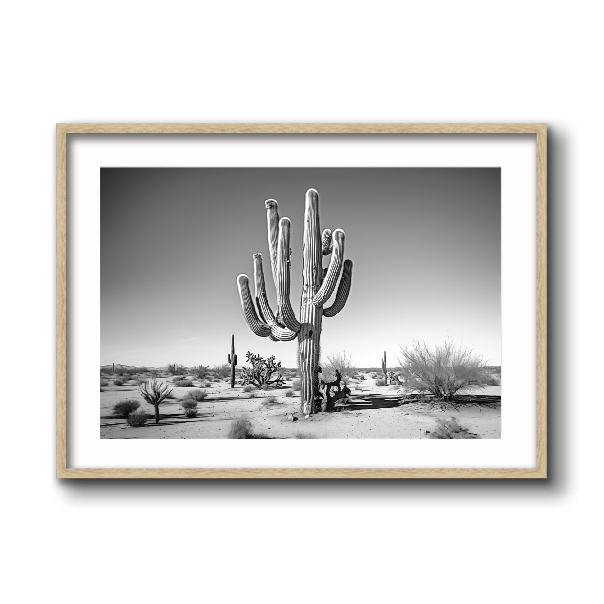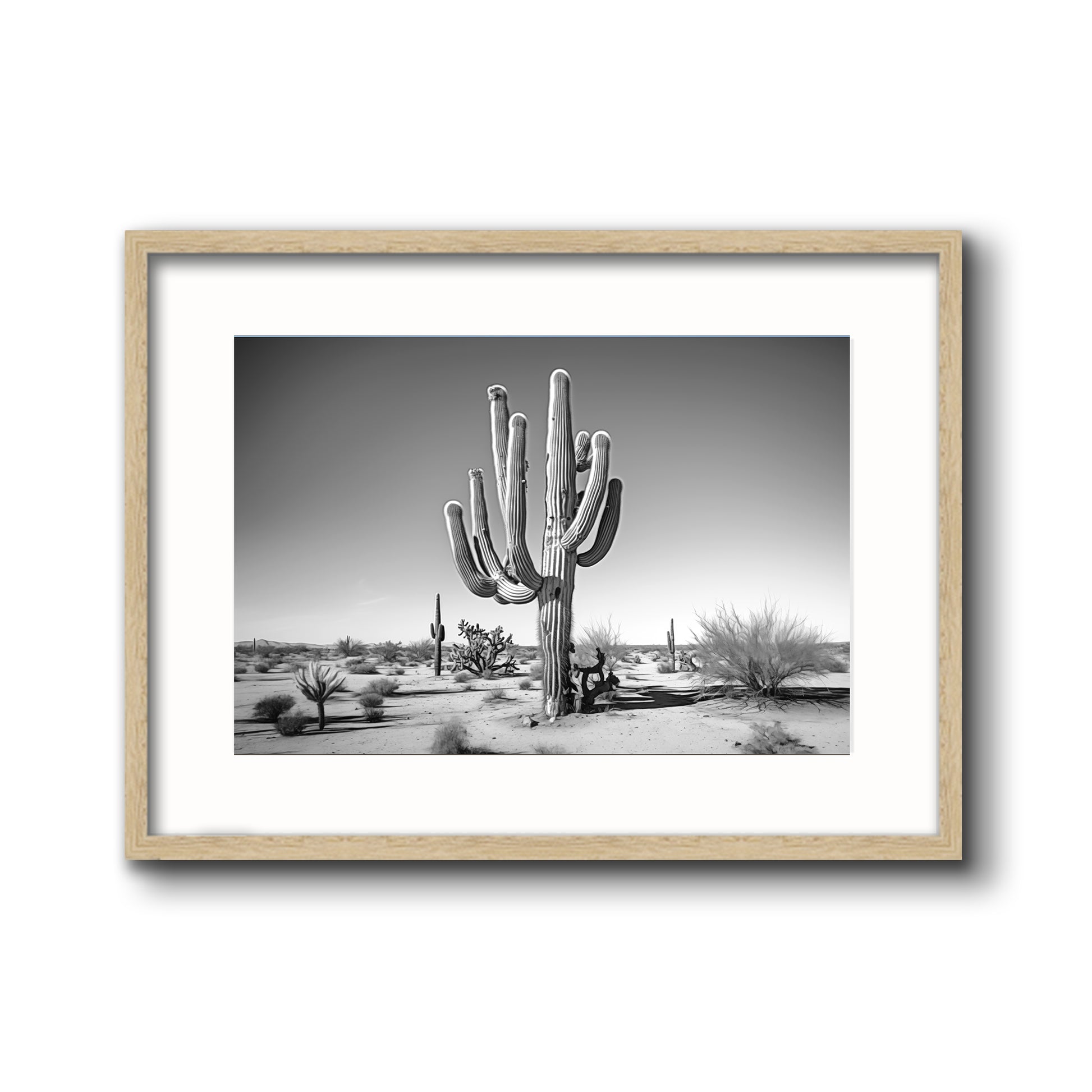 Black & White Photograph of a saguaro cactus in the Arizona desert.