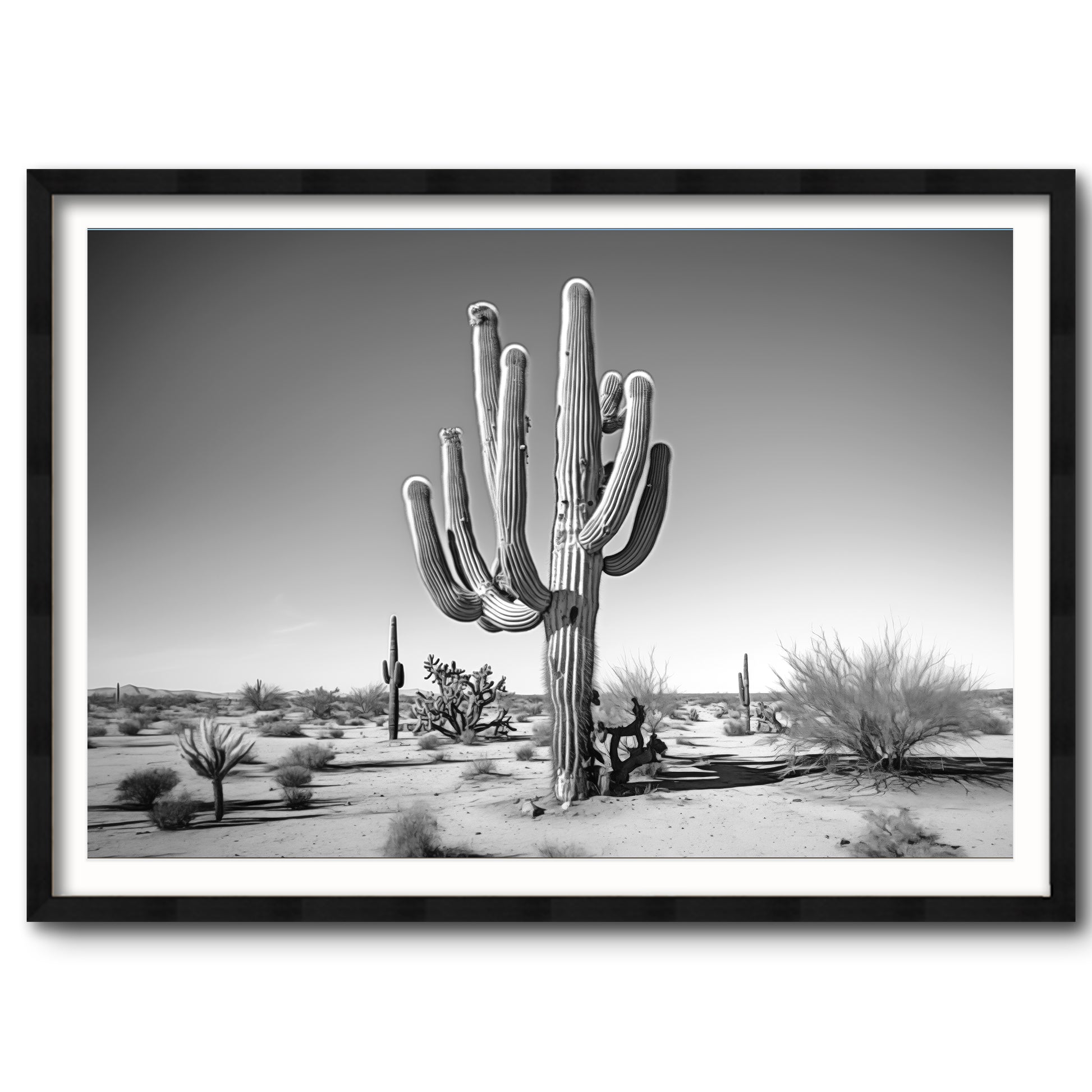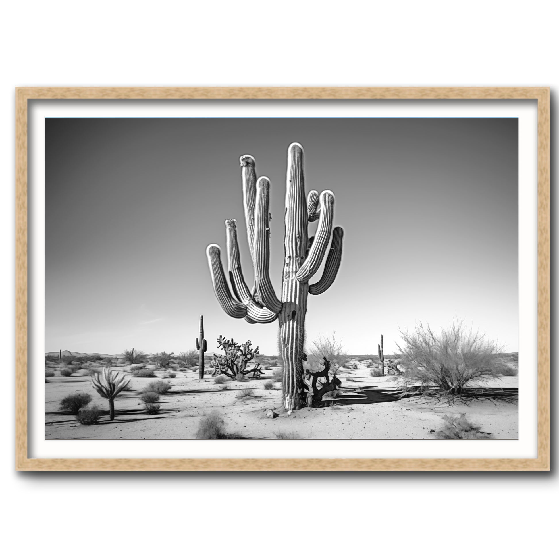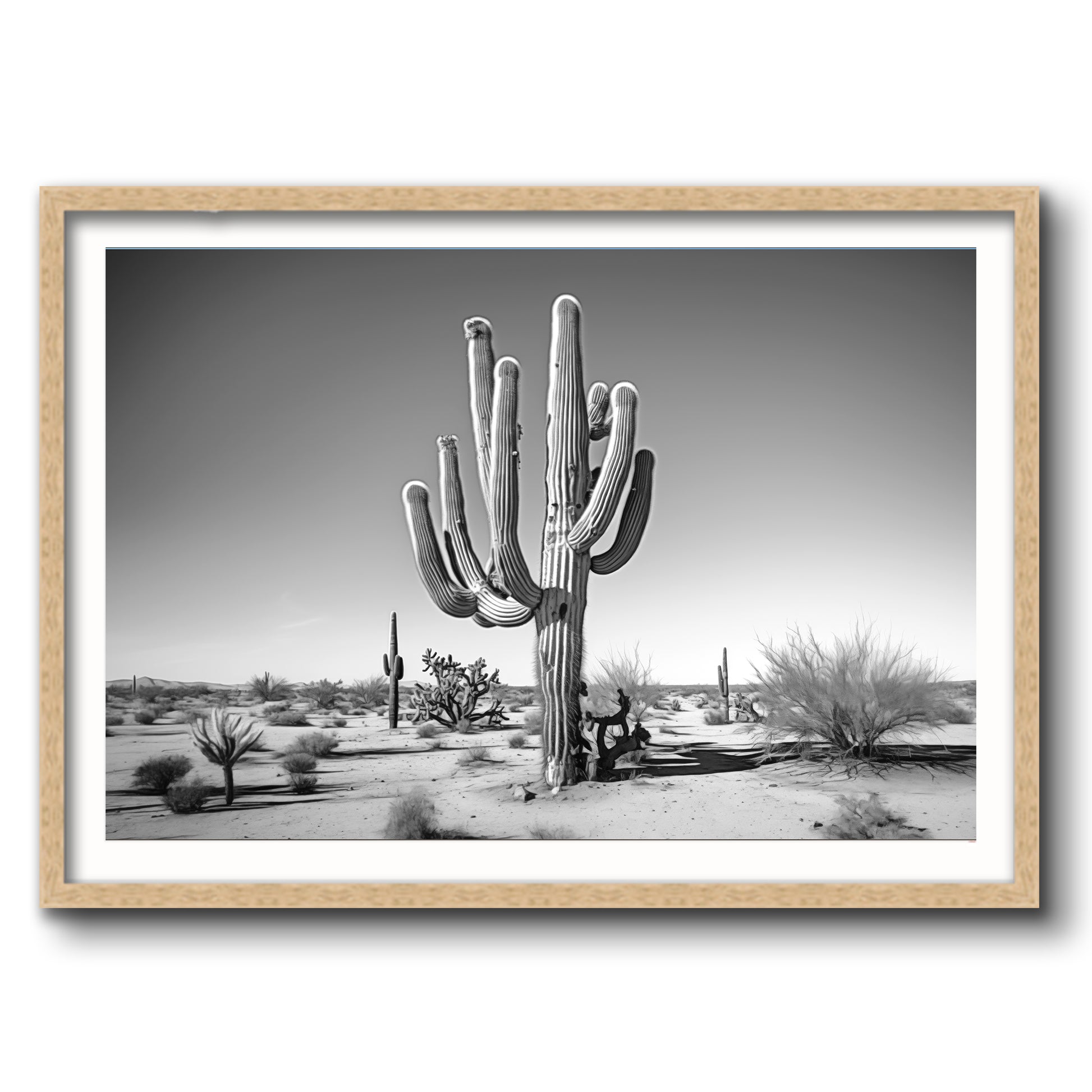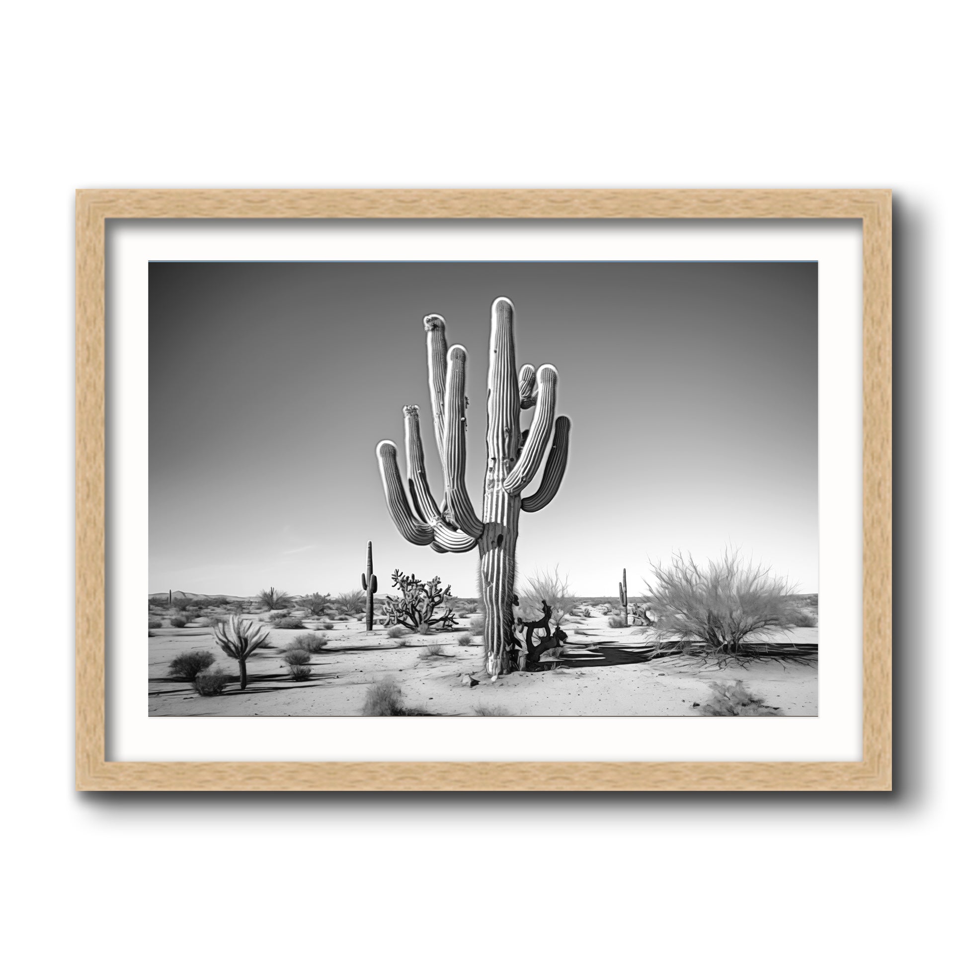 Black & White Photograph of a saguaro cactus in the Arizona desert.