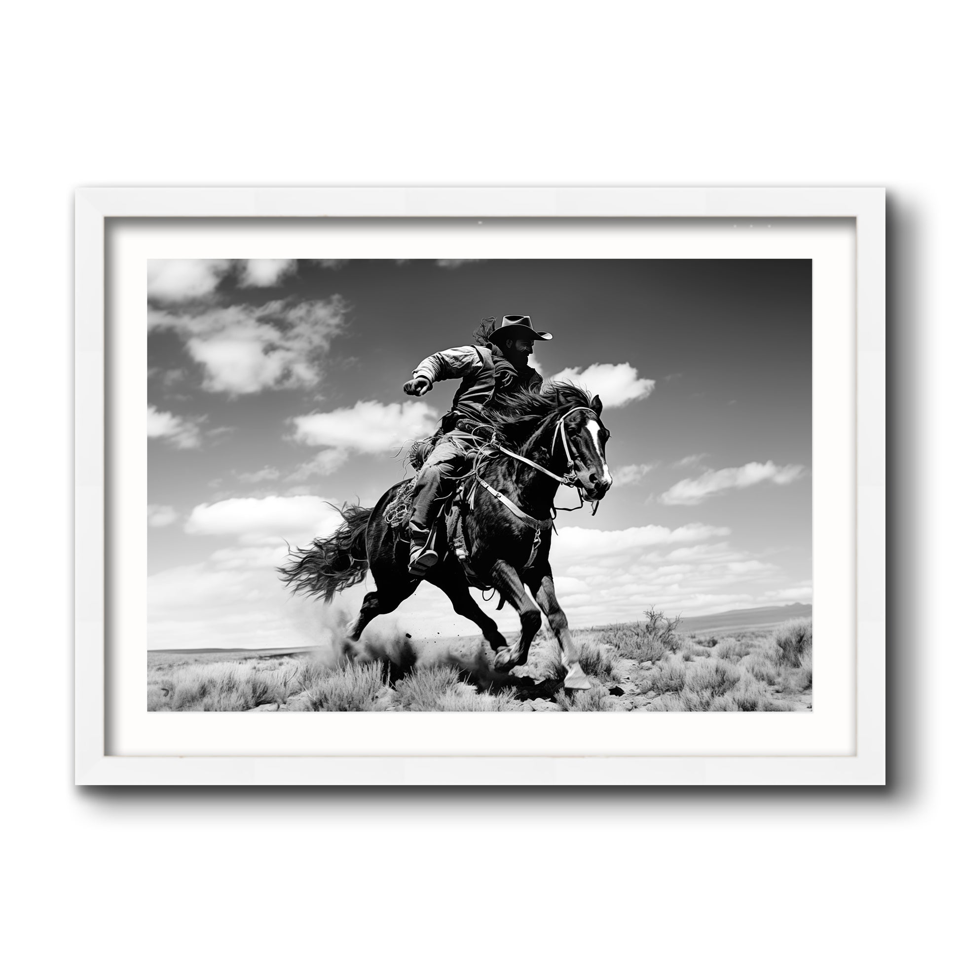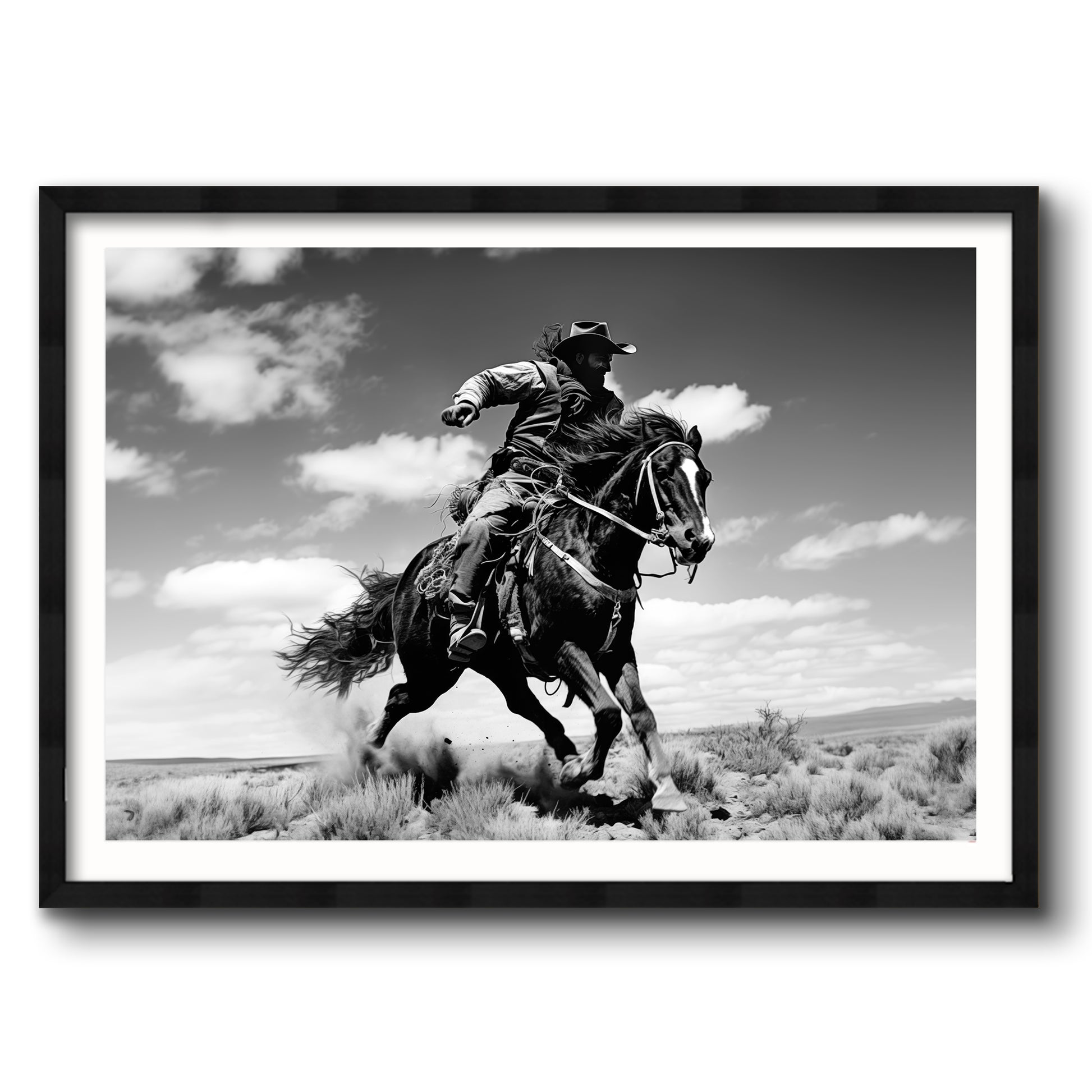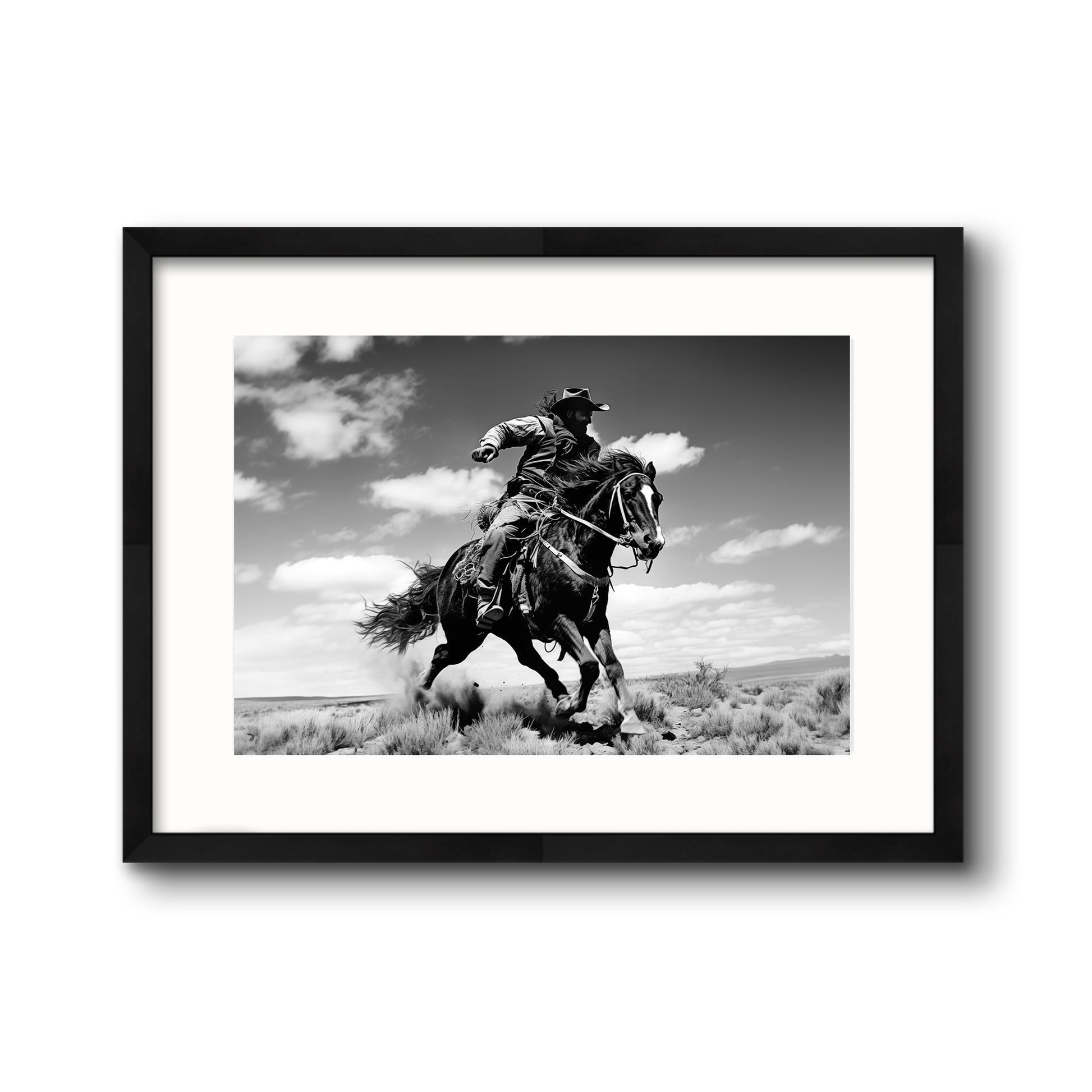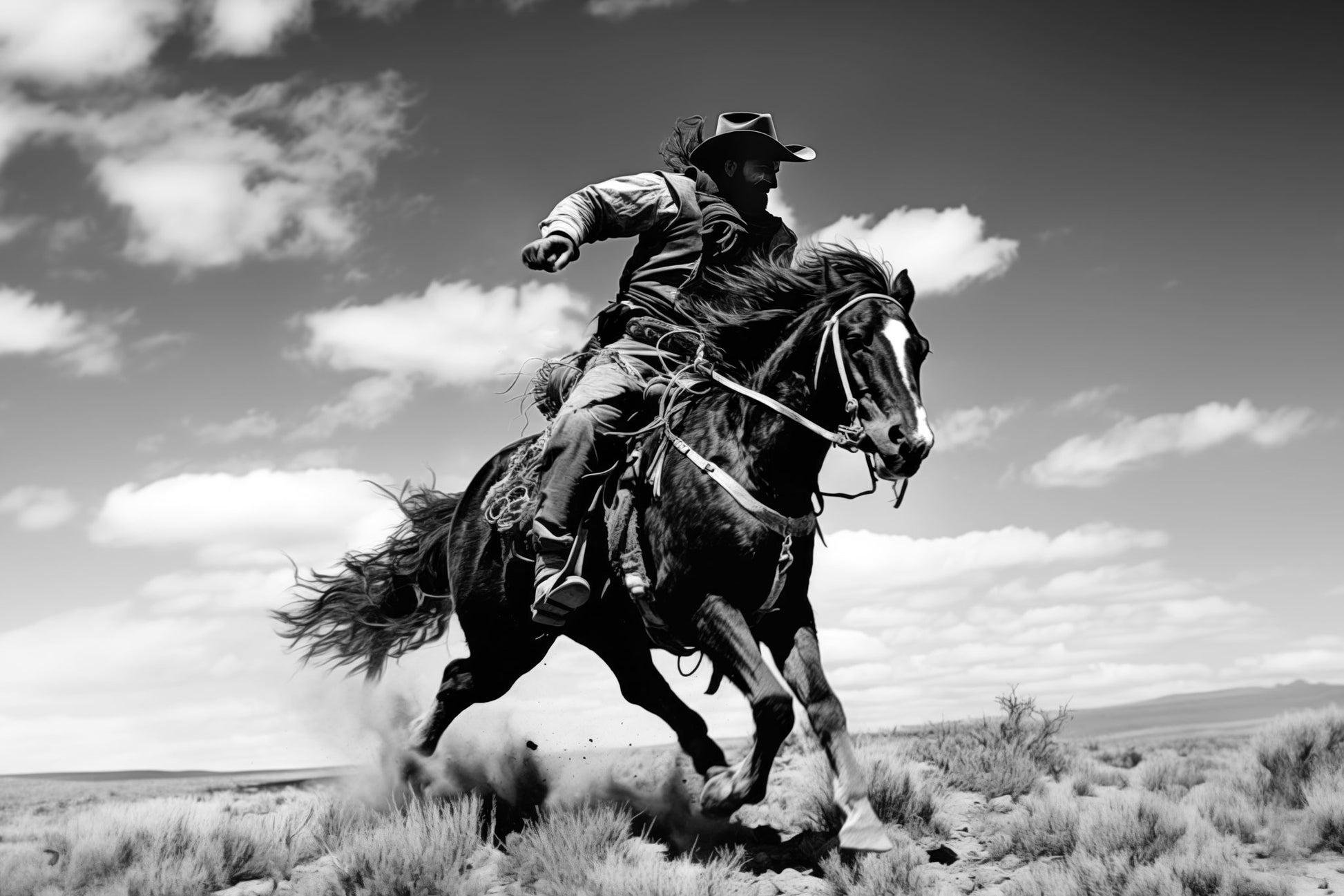 In the heart of Montana, where the mountains touch the sky, A wild cowboy rides, under the western sun's fierce eye. On a bucking bronco, with mane like wildfire ablaze, He tames the untamed, as in those rugged, old wild-west days.