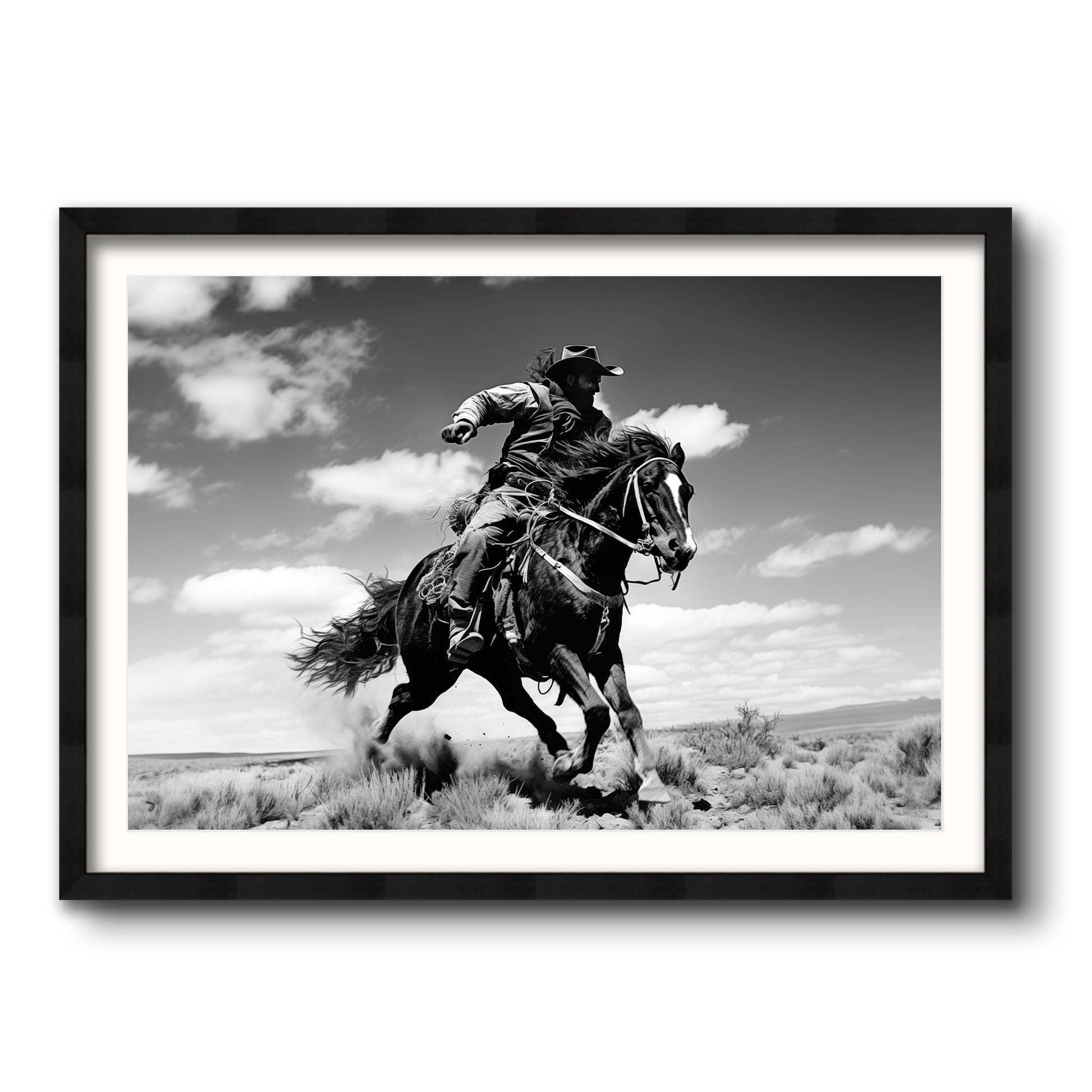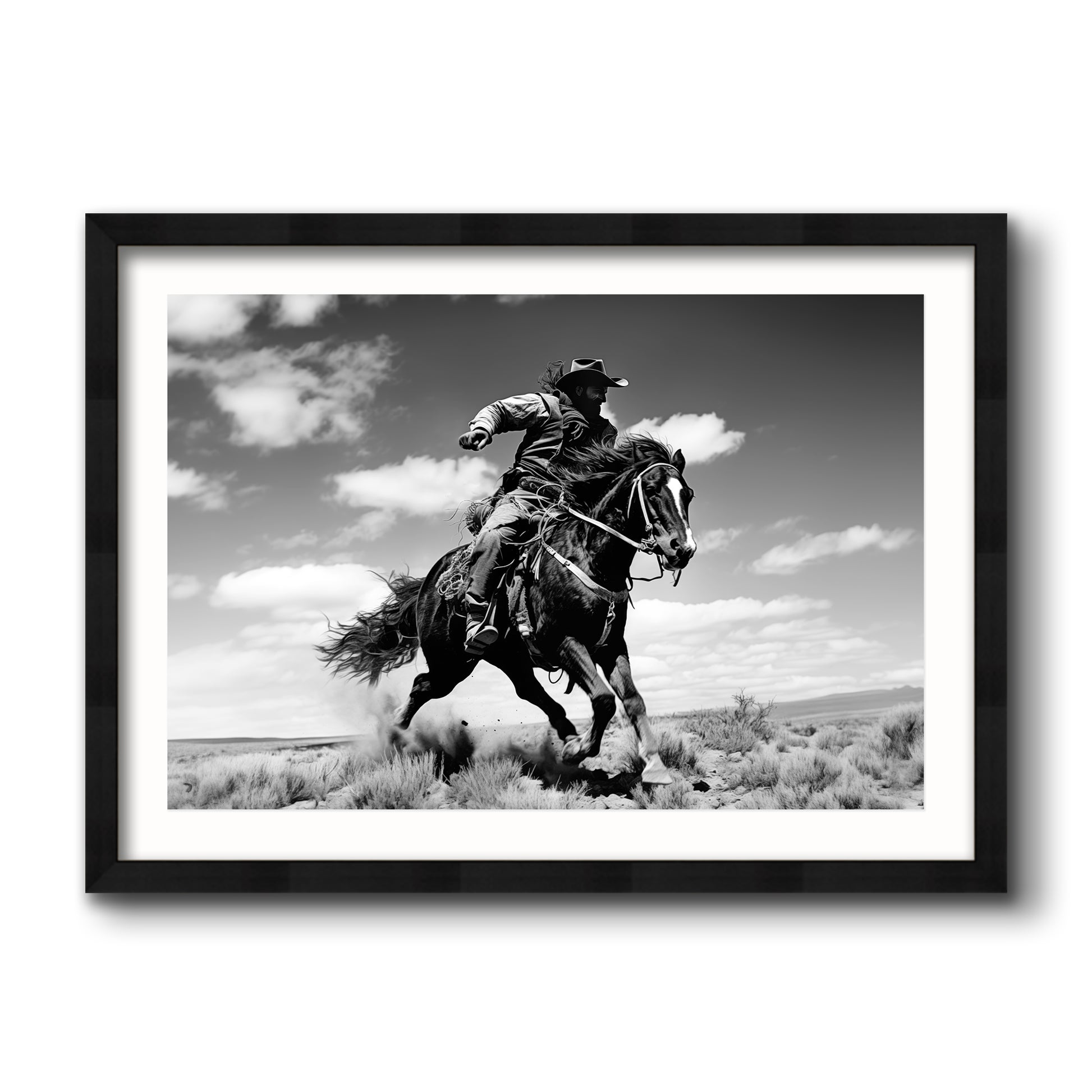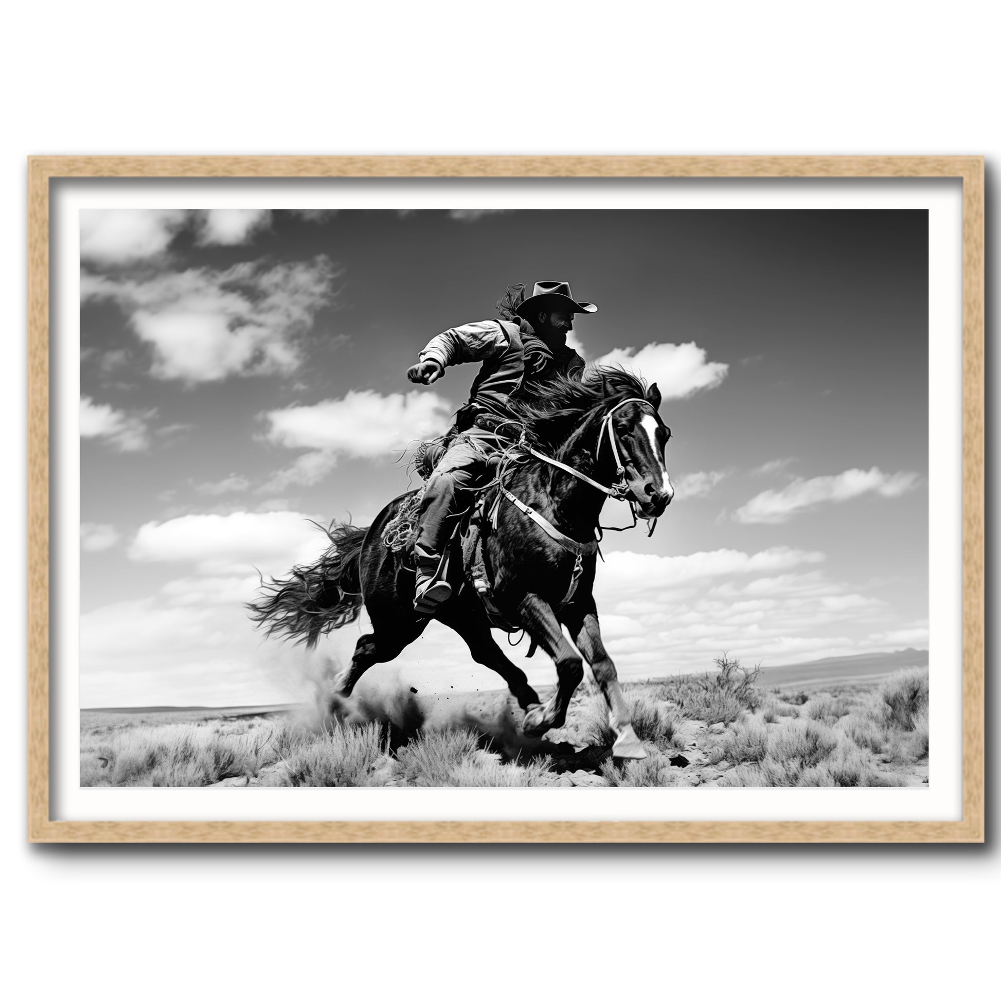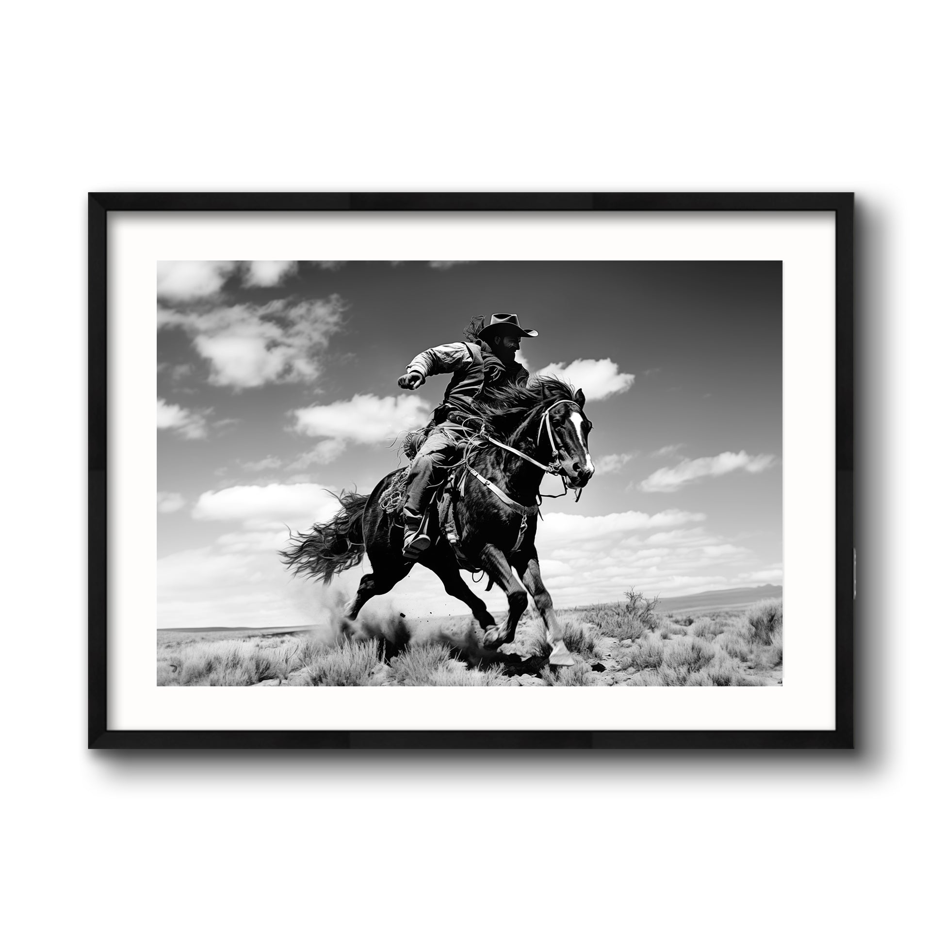 In the heart of Montana, where the mountains touch the sky, A wild cowboy rides, under the western sun's fierce eye. On a bucking bronco, with mane like wildfire ablaze, He tames the untamed, as in those rugged, old wild-west days.