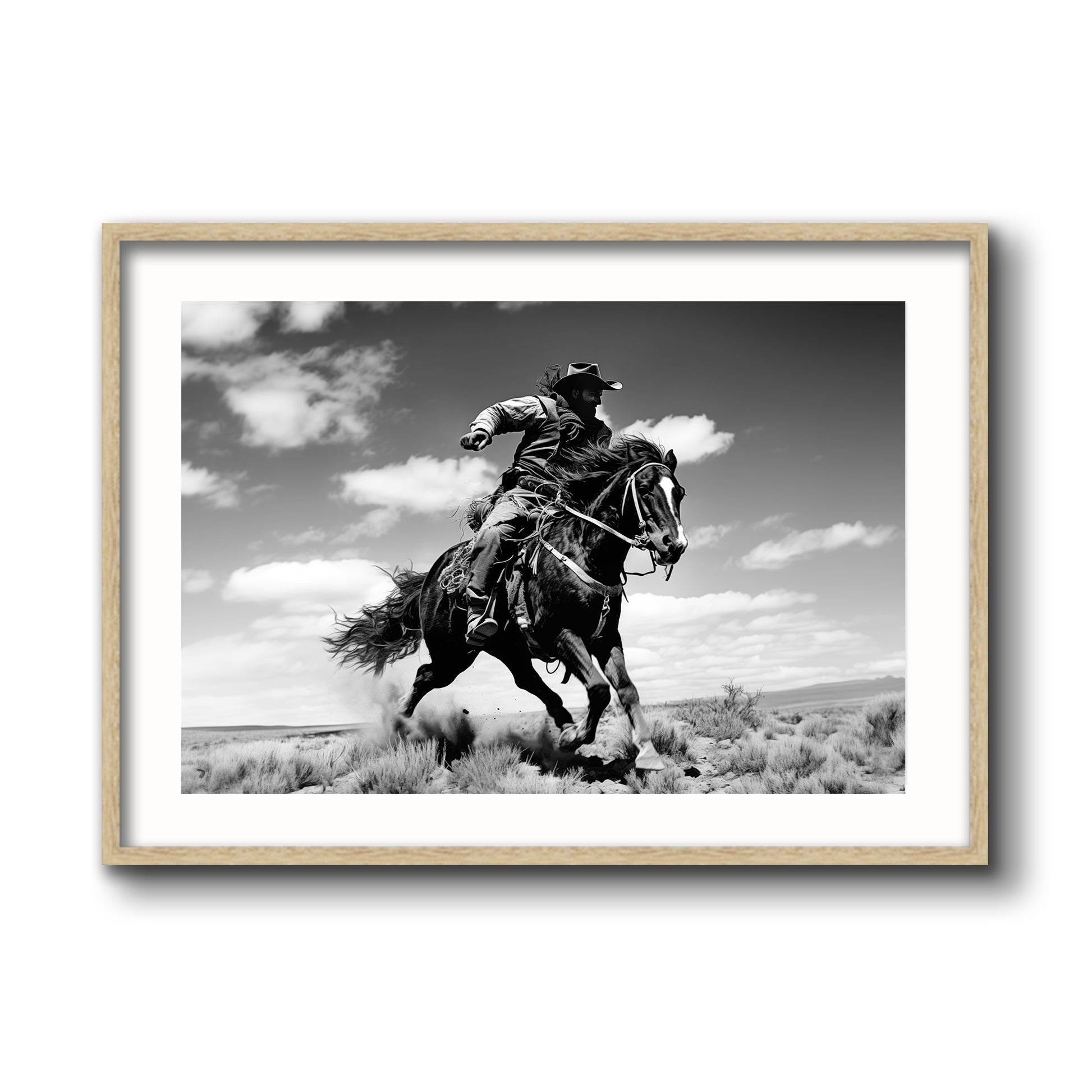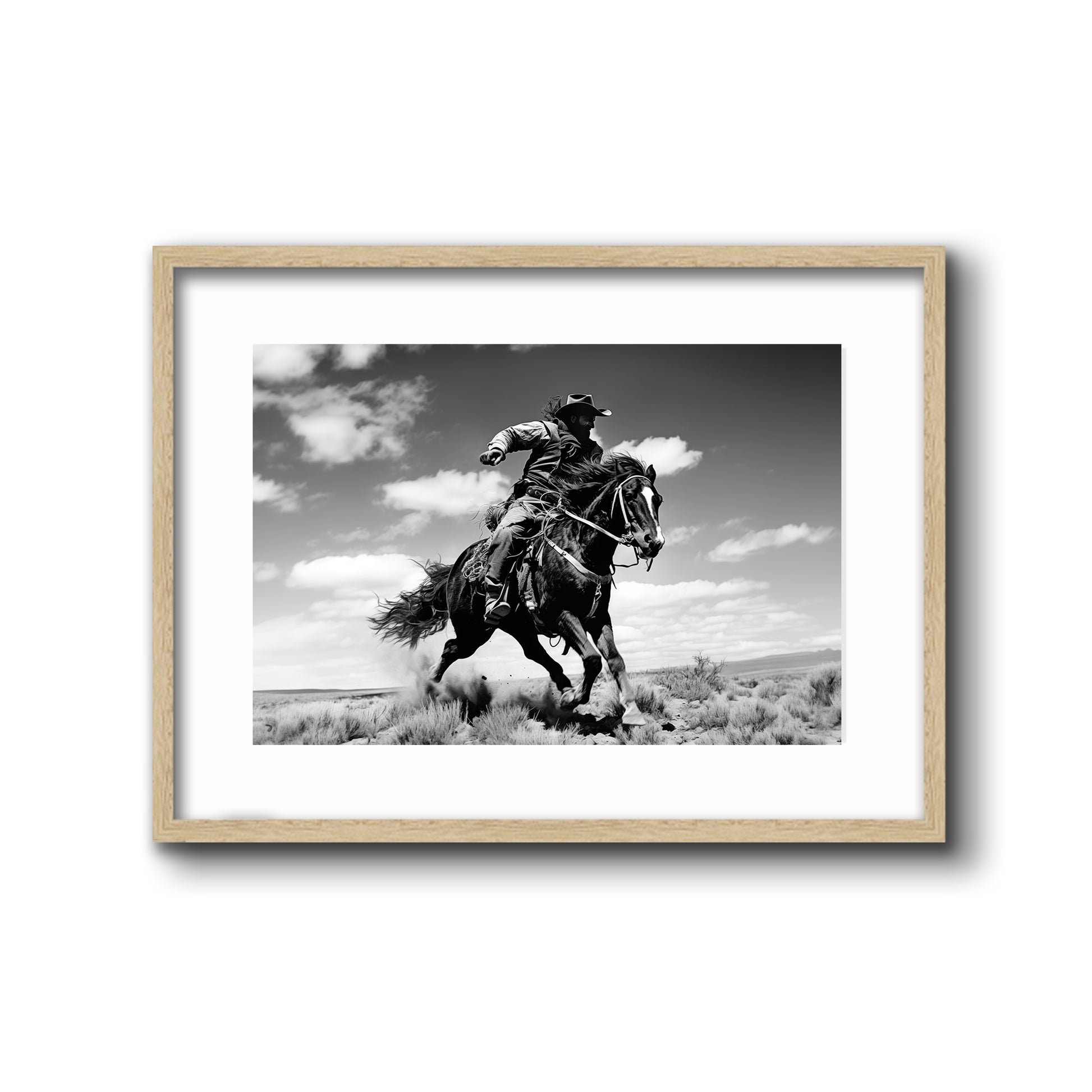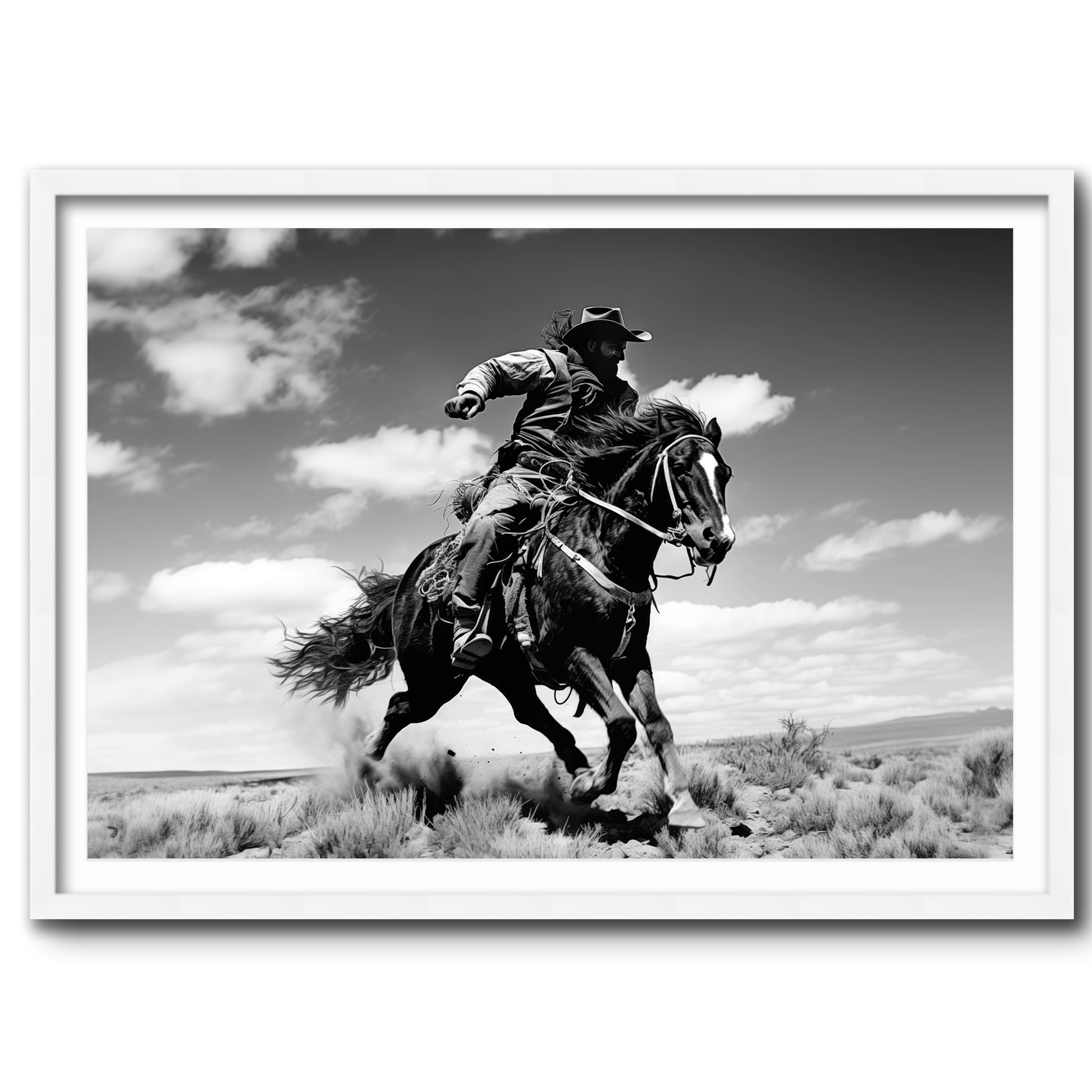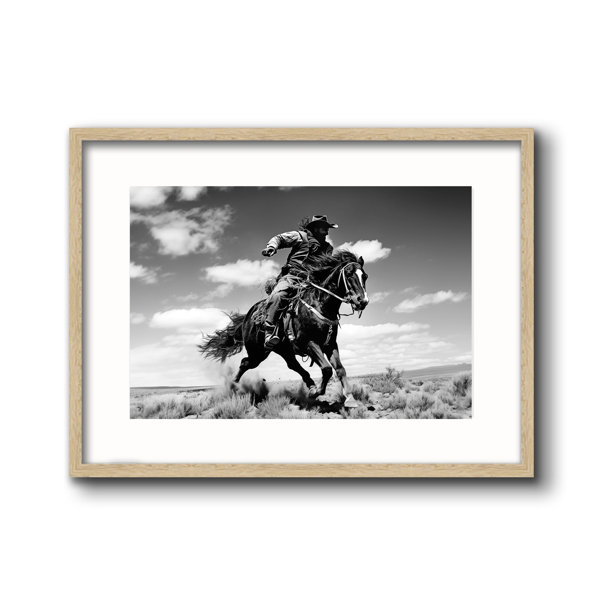 In the heart of Montana, where the mountains touch the sky, A wild cowboy rides, under the western sun's fierce eye. On a bucking bronco, with mane like wildfire ablaze, He tames the untamed, as in those rugged, old wild-west days.