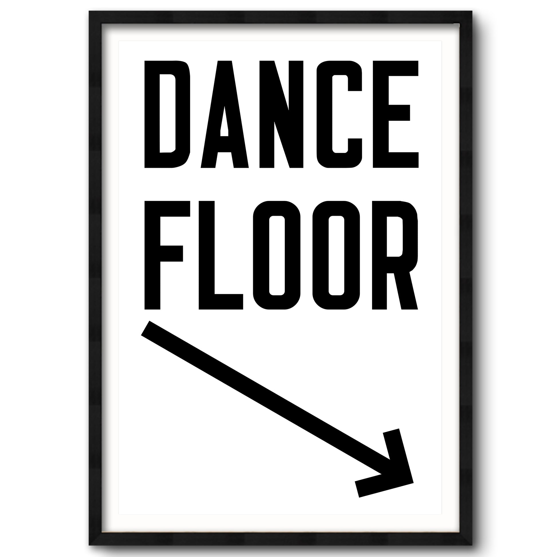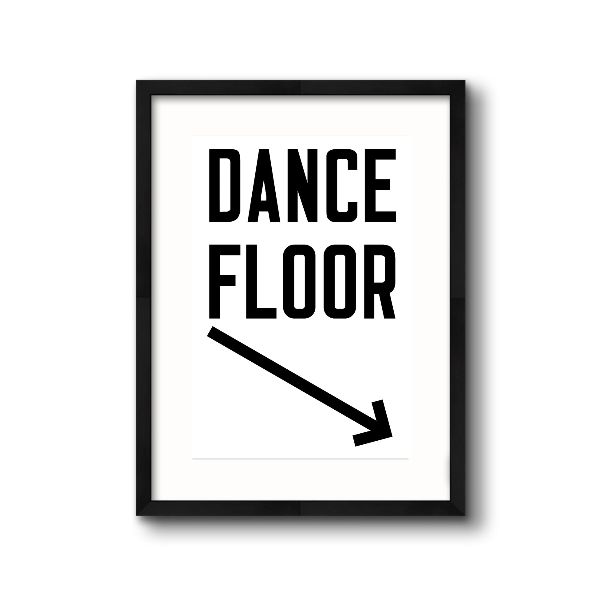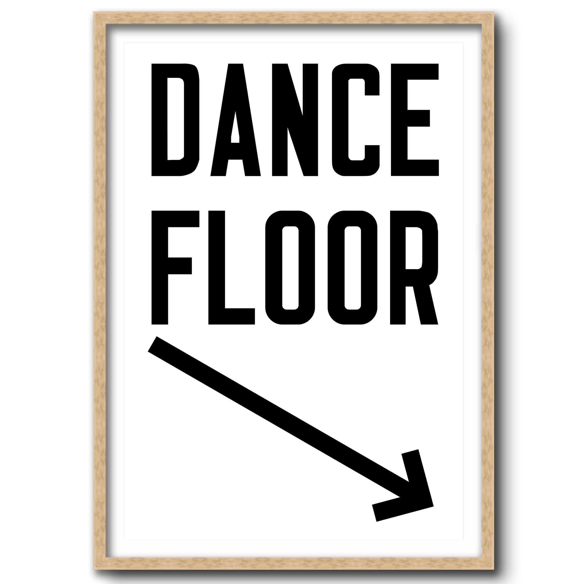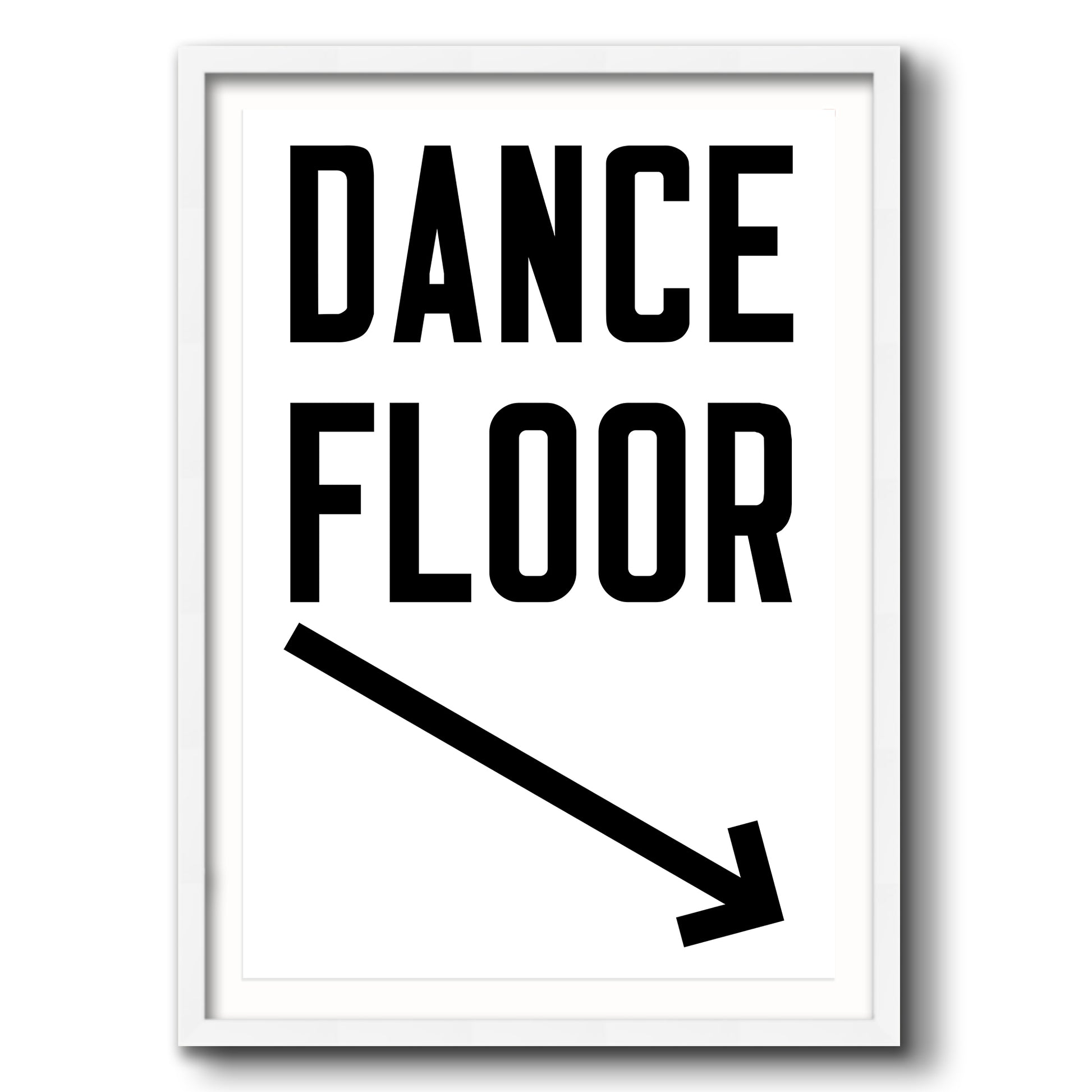 Dance Floor sign print with diagonal arrow pointing down and to the right. Liven up your boring walls and encourage good vibes with this fun & playful typography art.