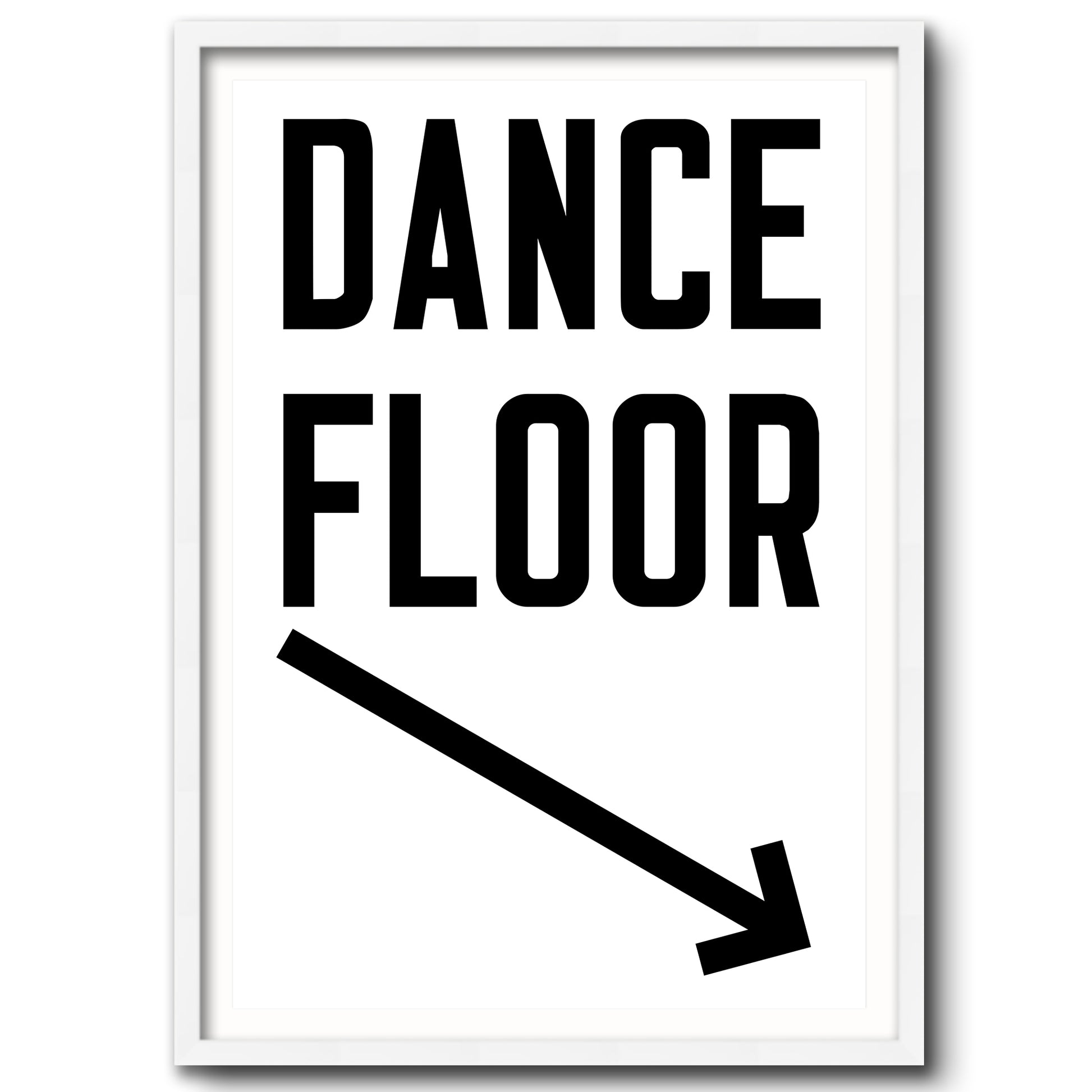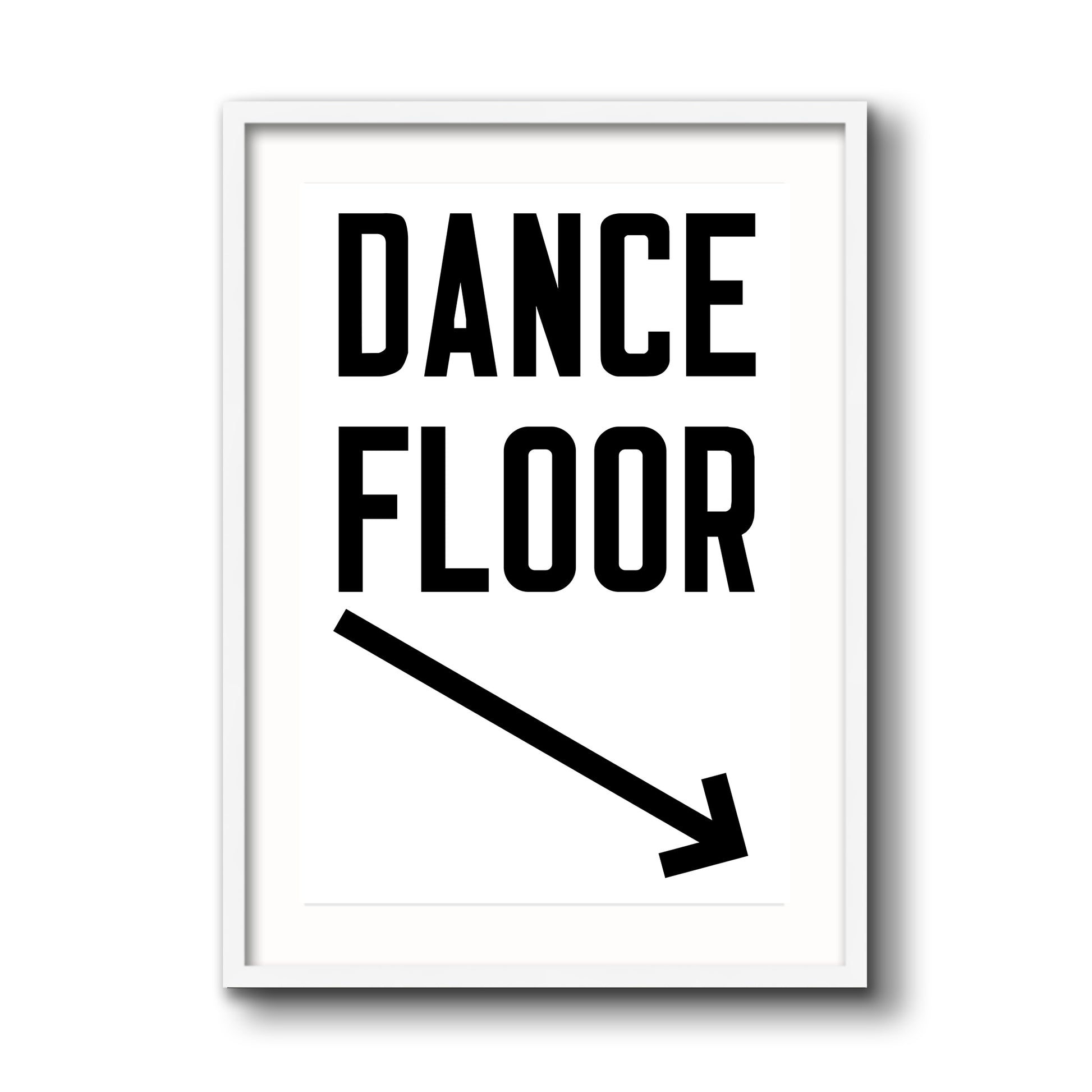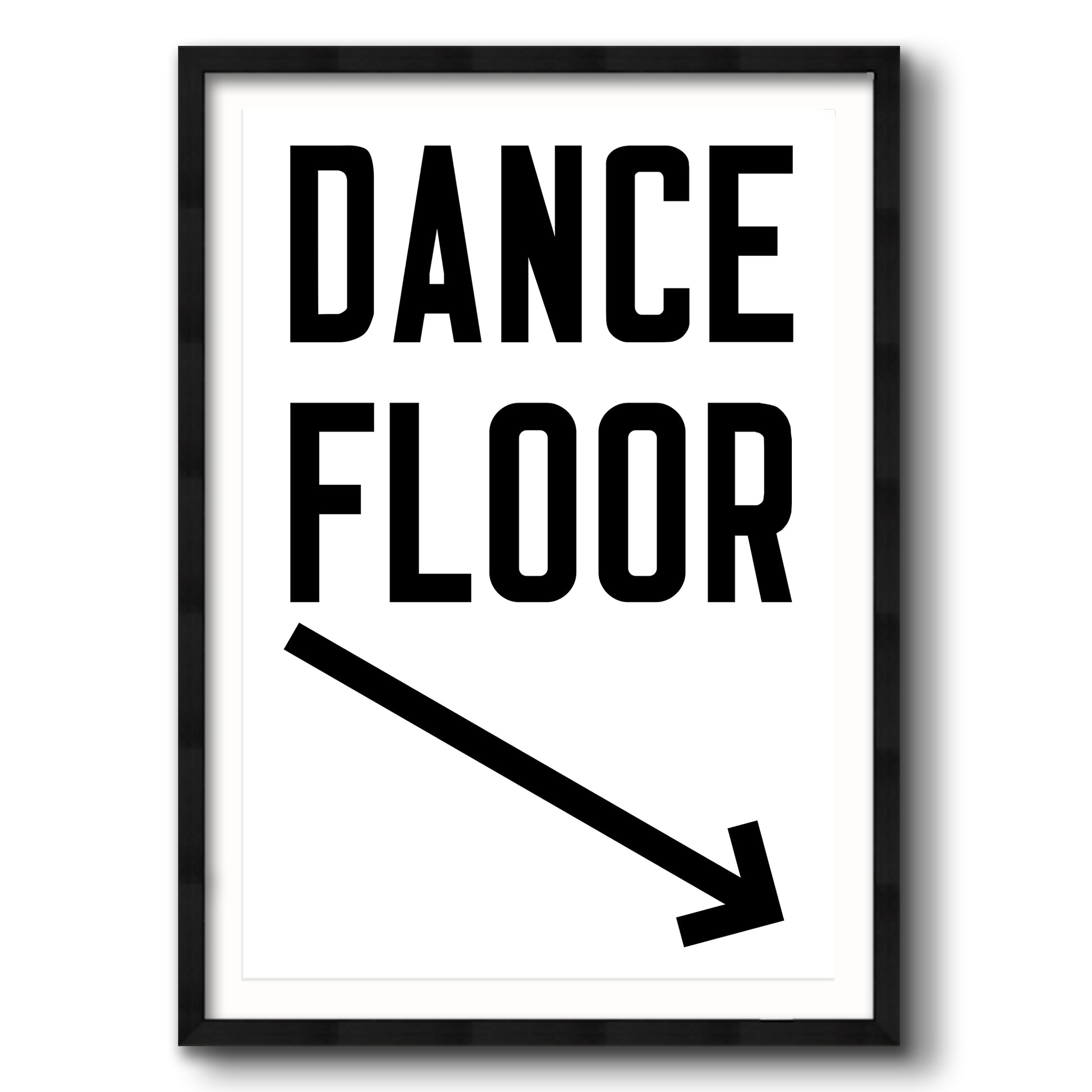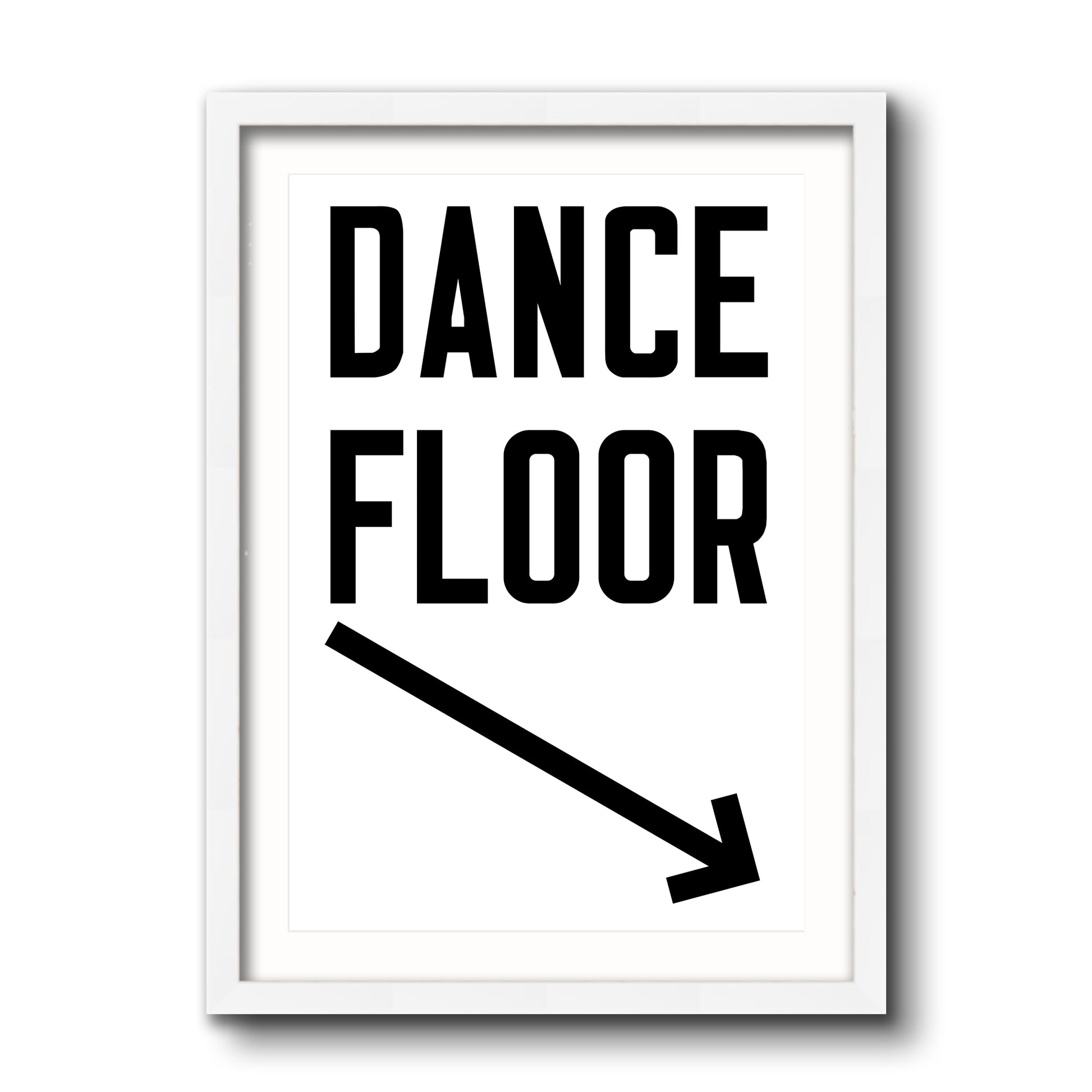 Dance Floor sign print with diagonal arrow pointing down and to the right. Liven up your boring walls and encourage good vibes with this fun & playful typography art.