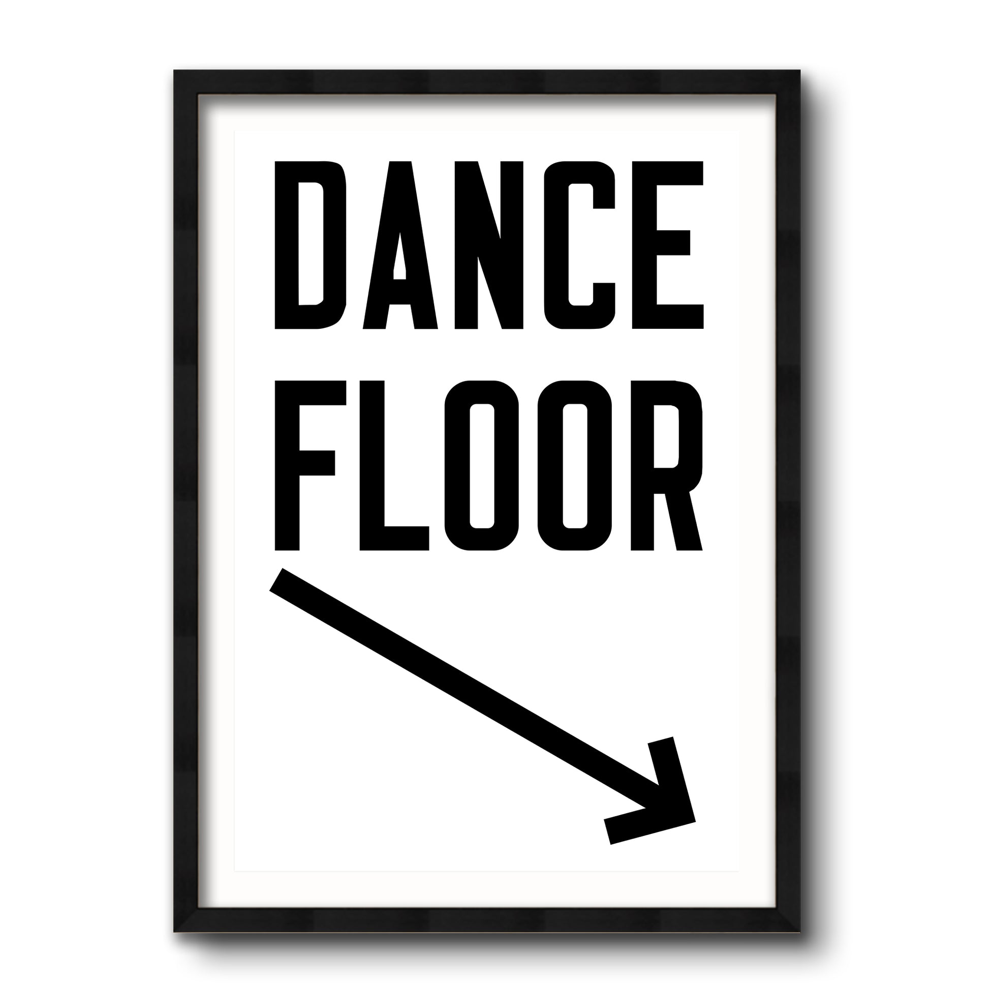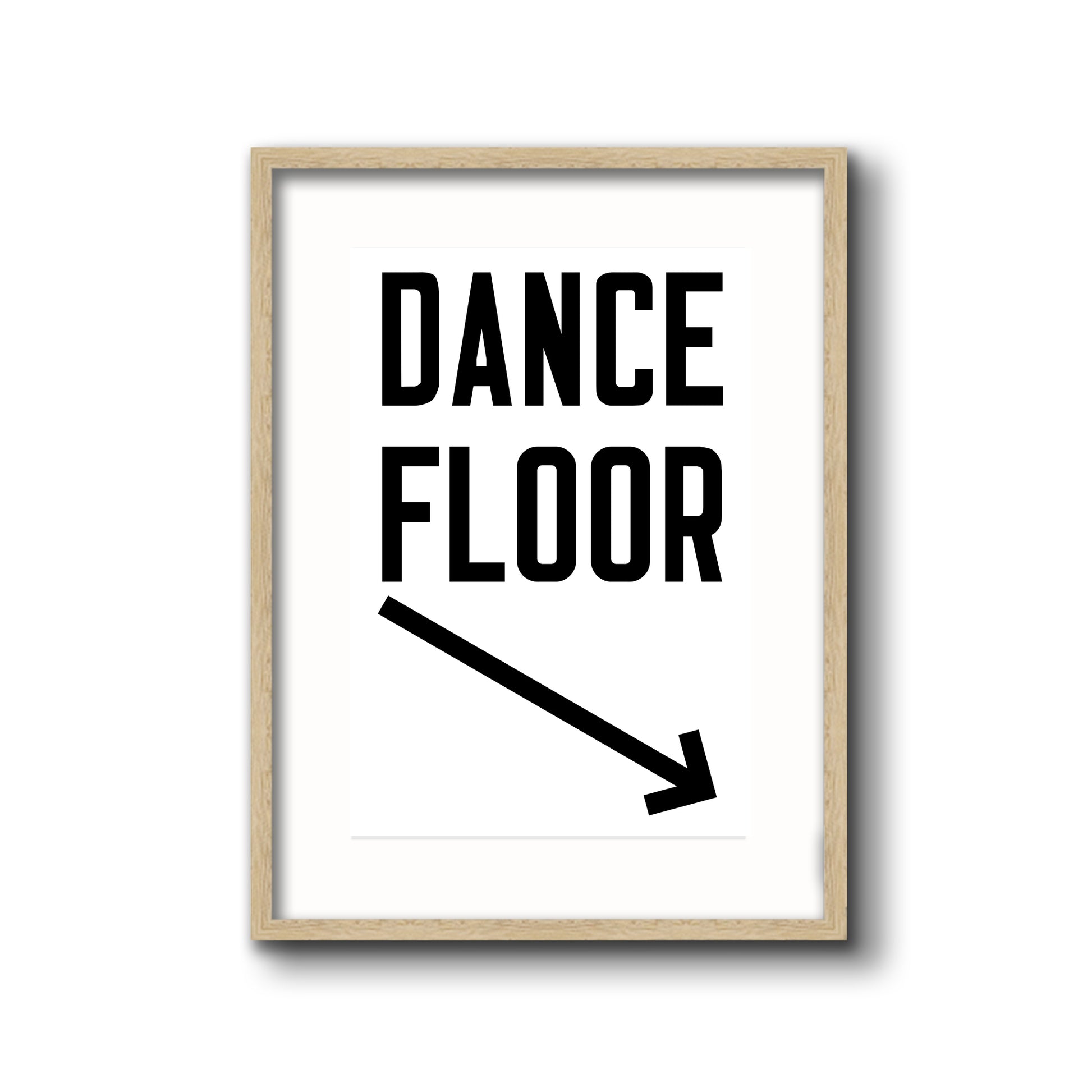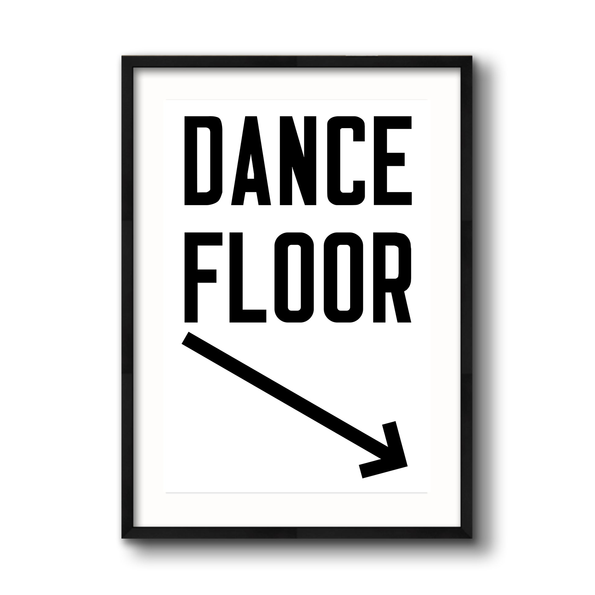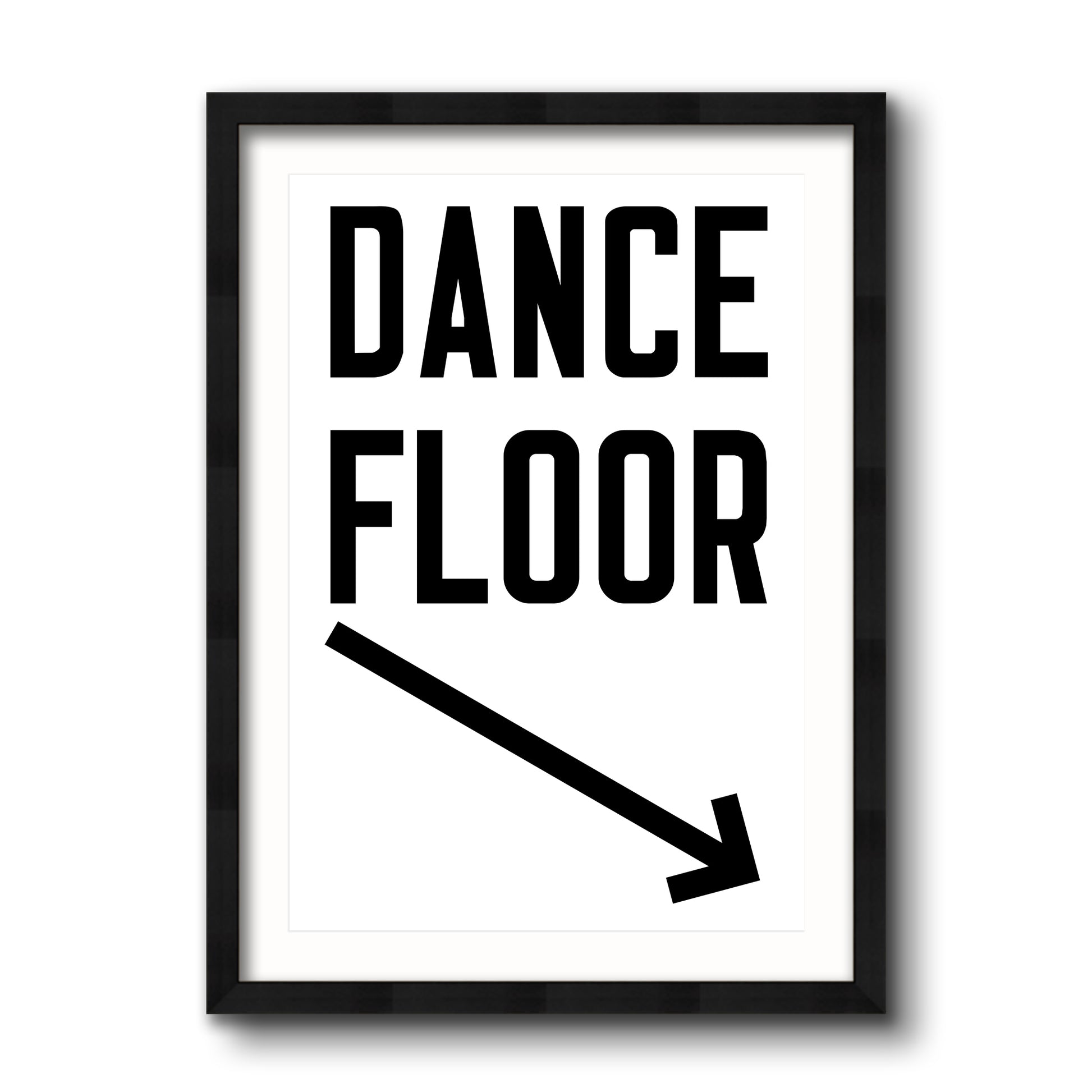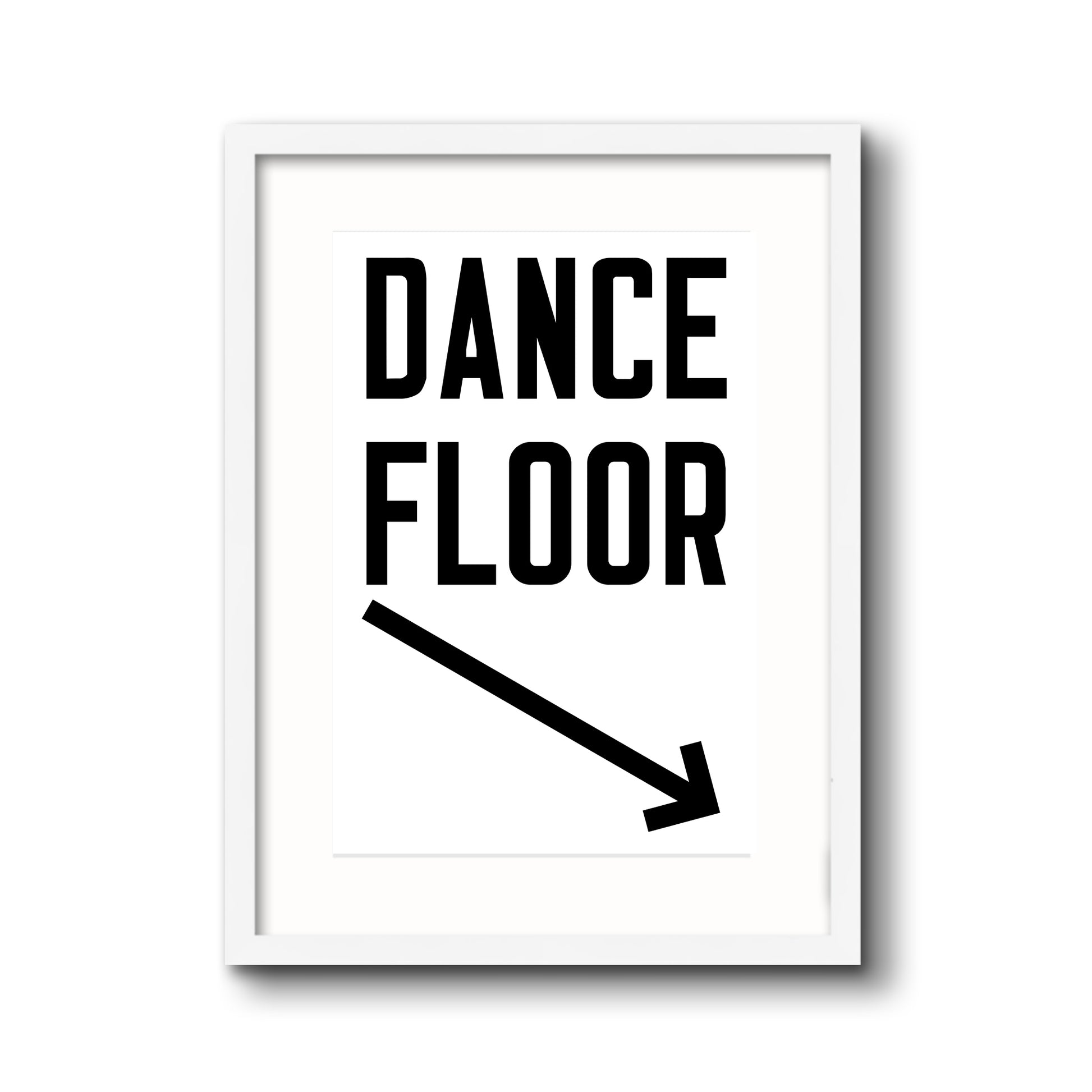 Dance Floor sign print with diagonal arrow pointing down and to the right. Liven up your boring walls and encourage good vibes with this fun & playful typography art.