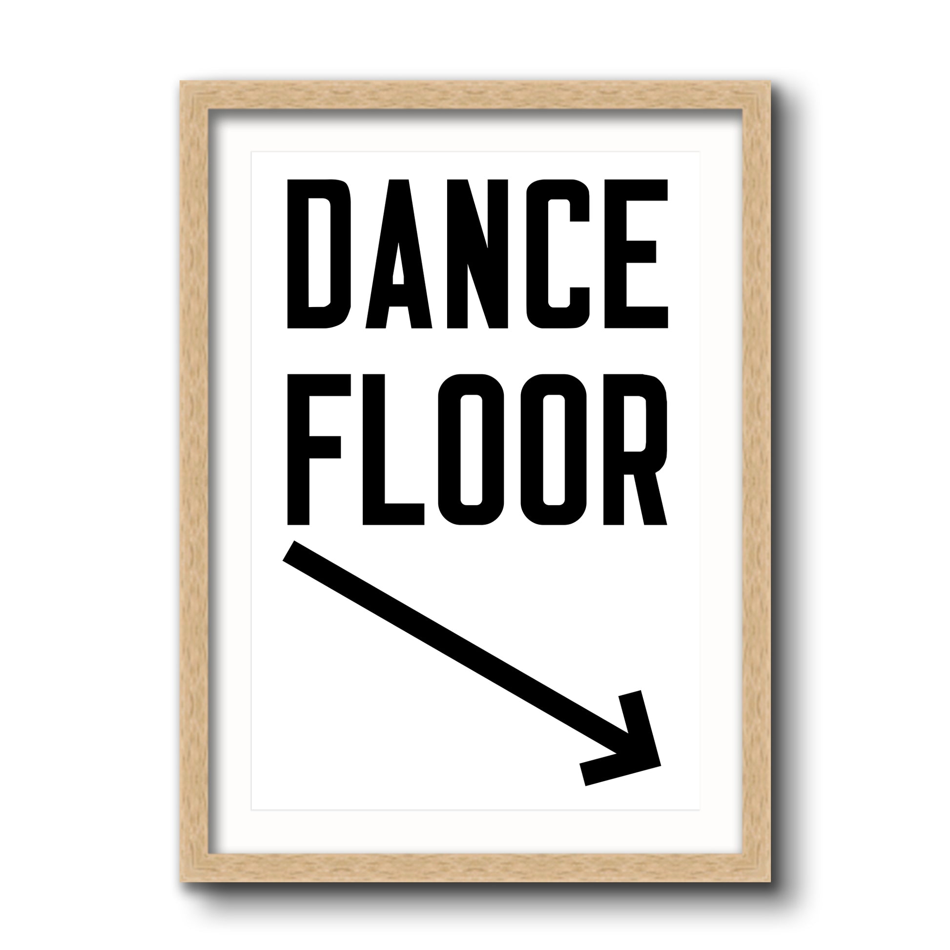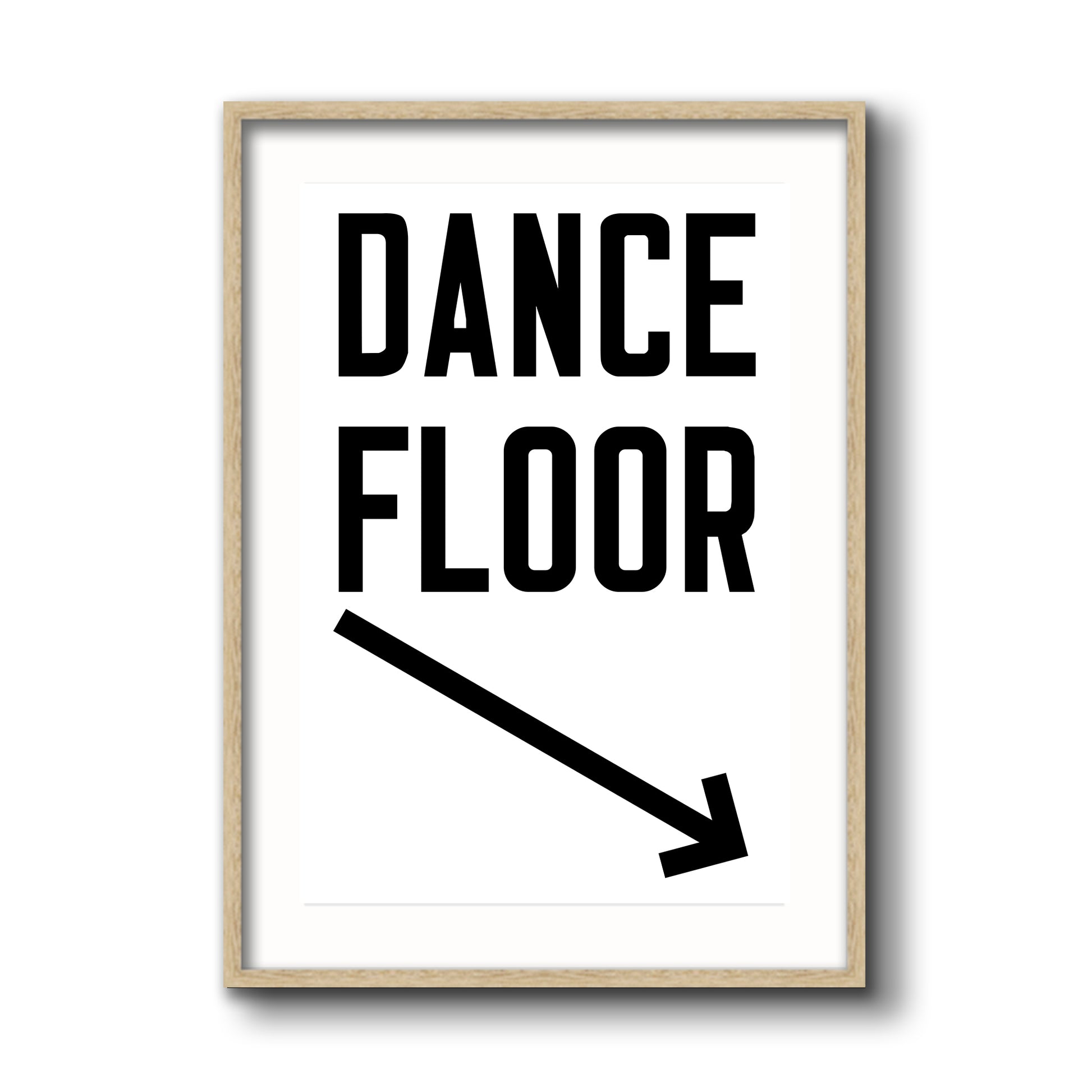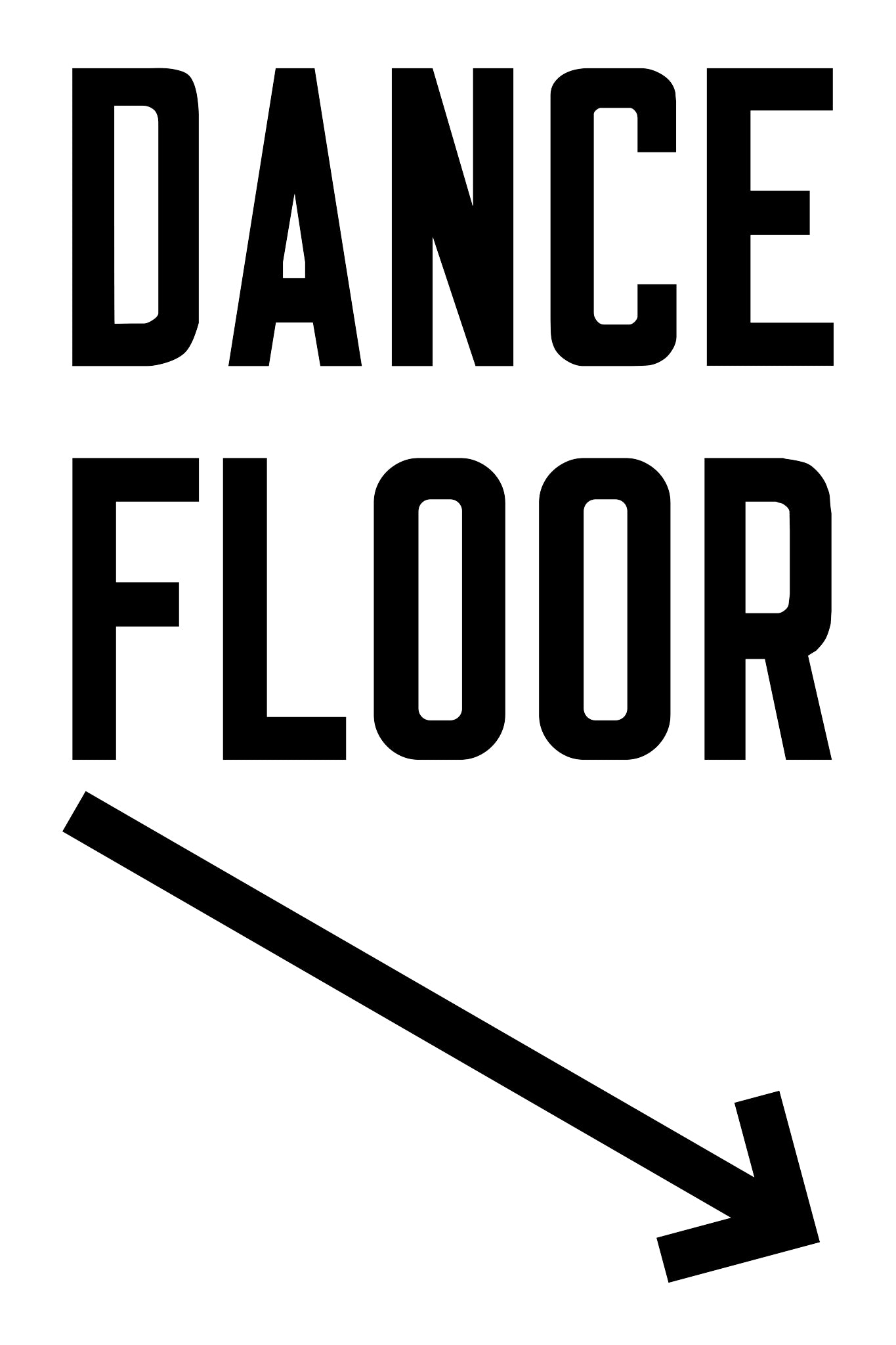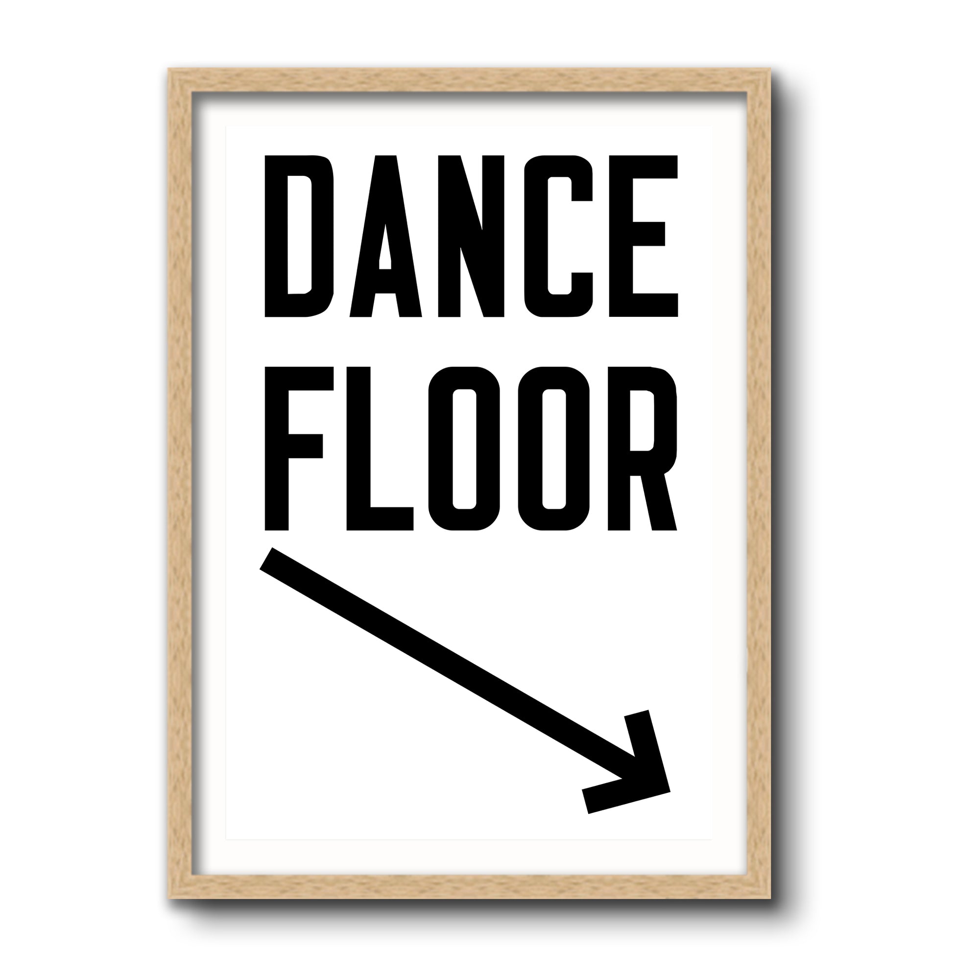 Dance Floor sign print with diagonal arrow pointing down and to the right. Liven up your boring walls and encourage good vibes with this fun & playful typography art.