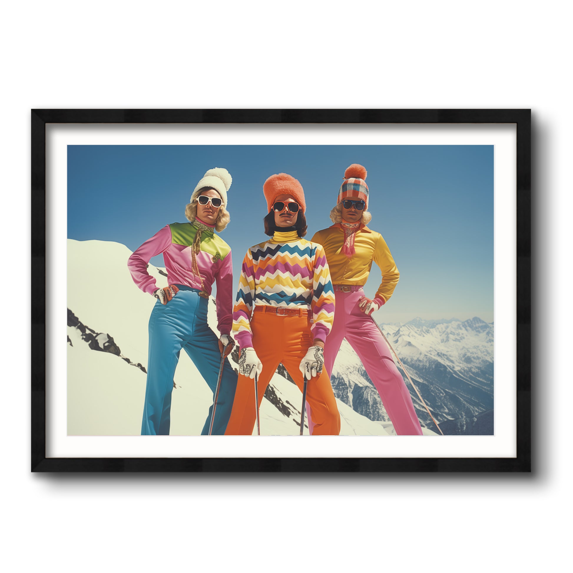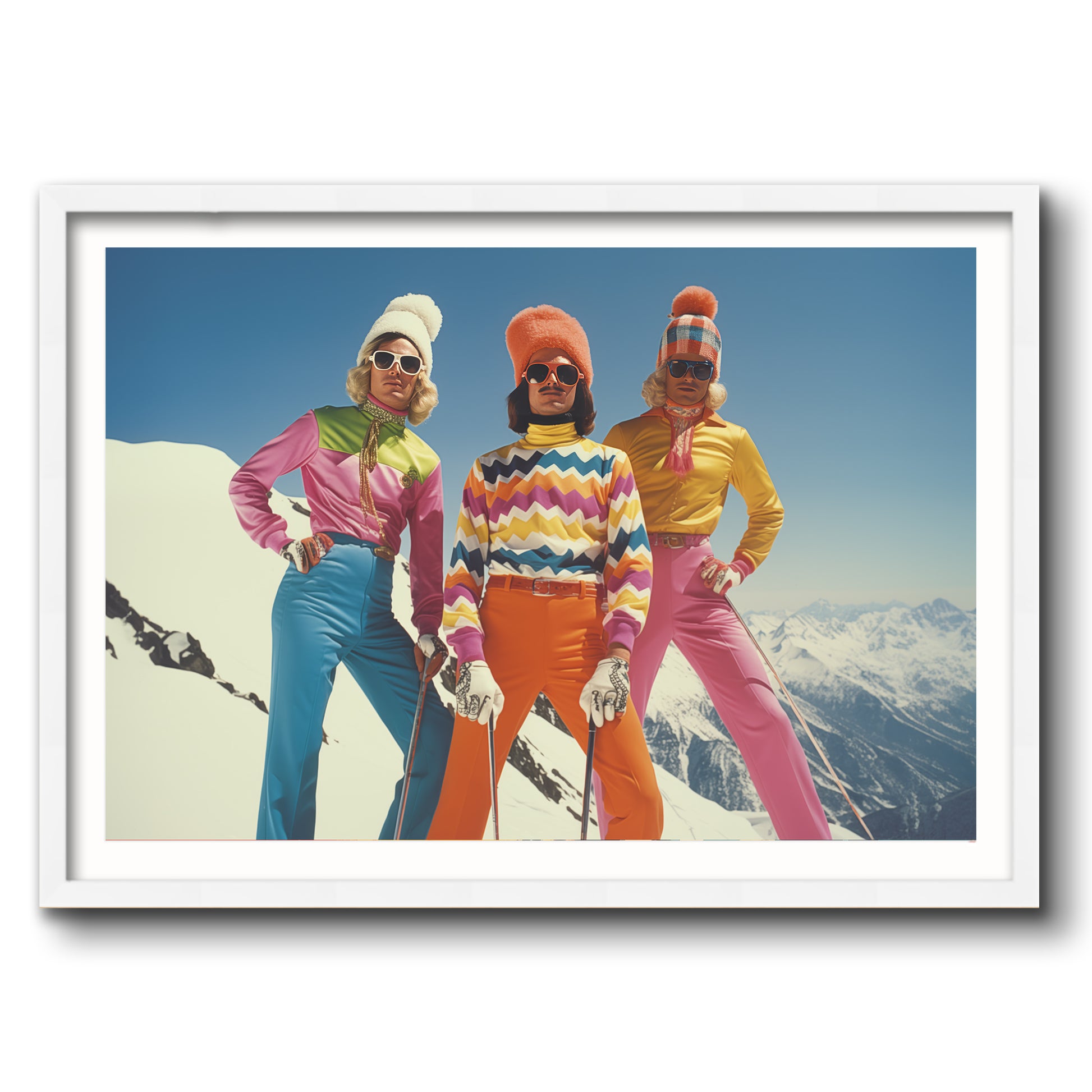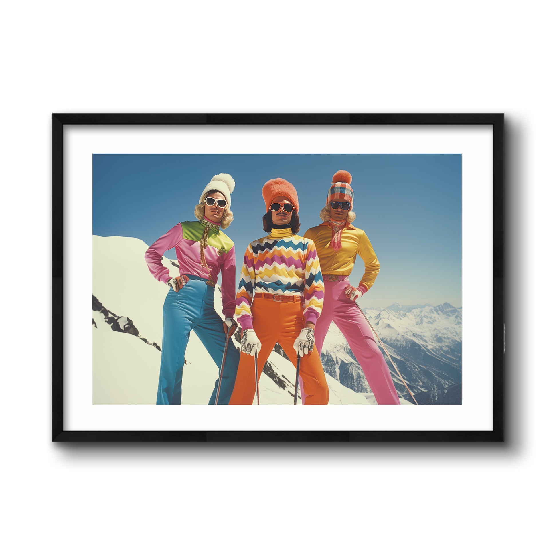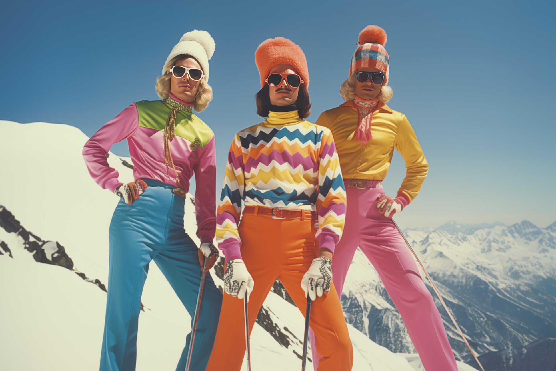 Raise a toast to those glamorous days gone by. In the days of disco and 'Here Comes the Sun' on the radio, three stylish daredevils glide down the slopes, in a rhythmic Bee Gees flow. Skiing in Jackson Hole, in the '70s, pure gold...