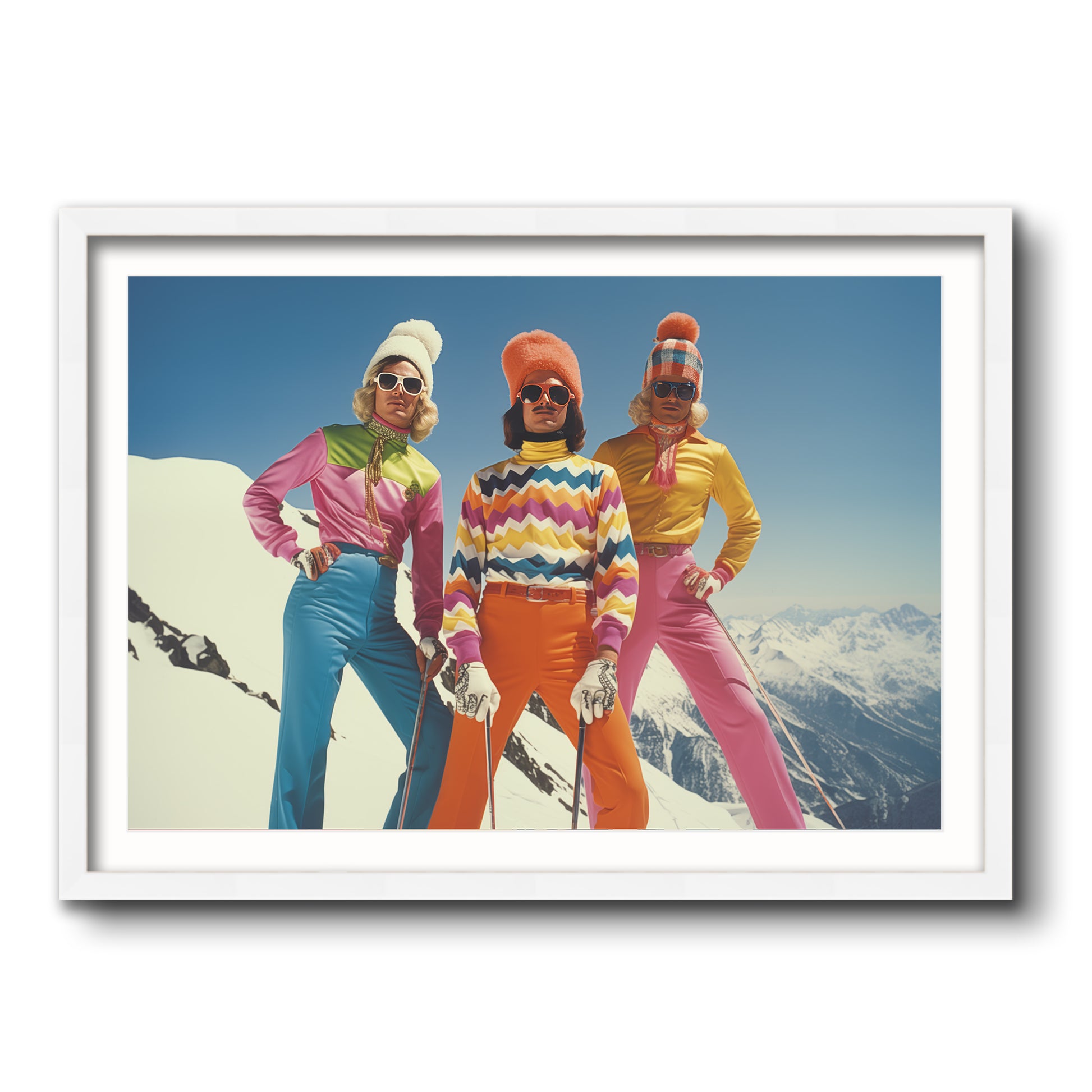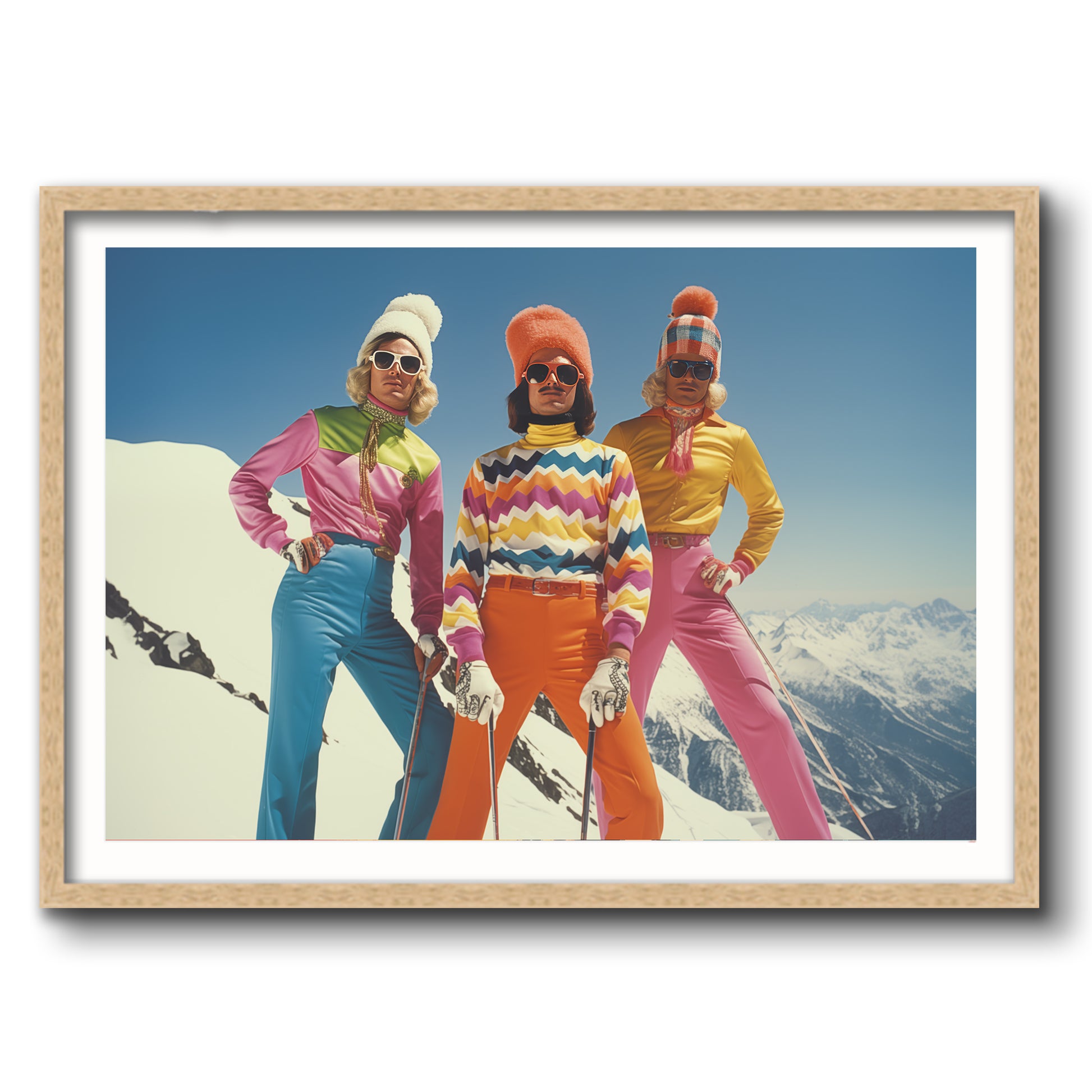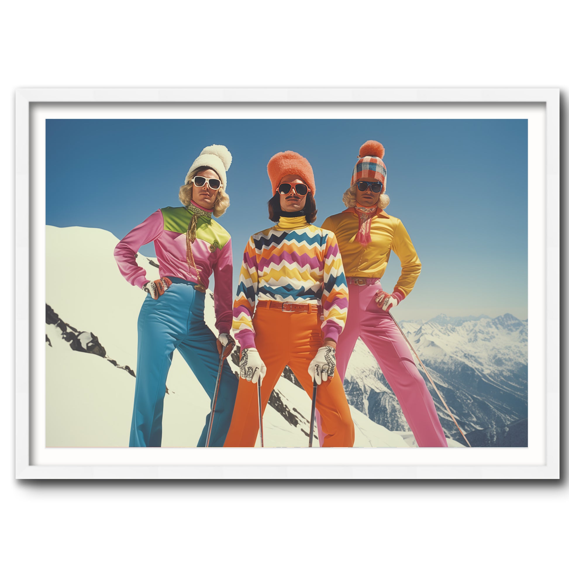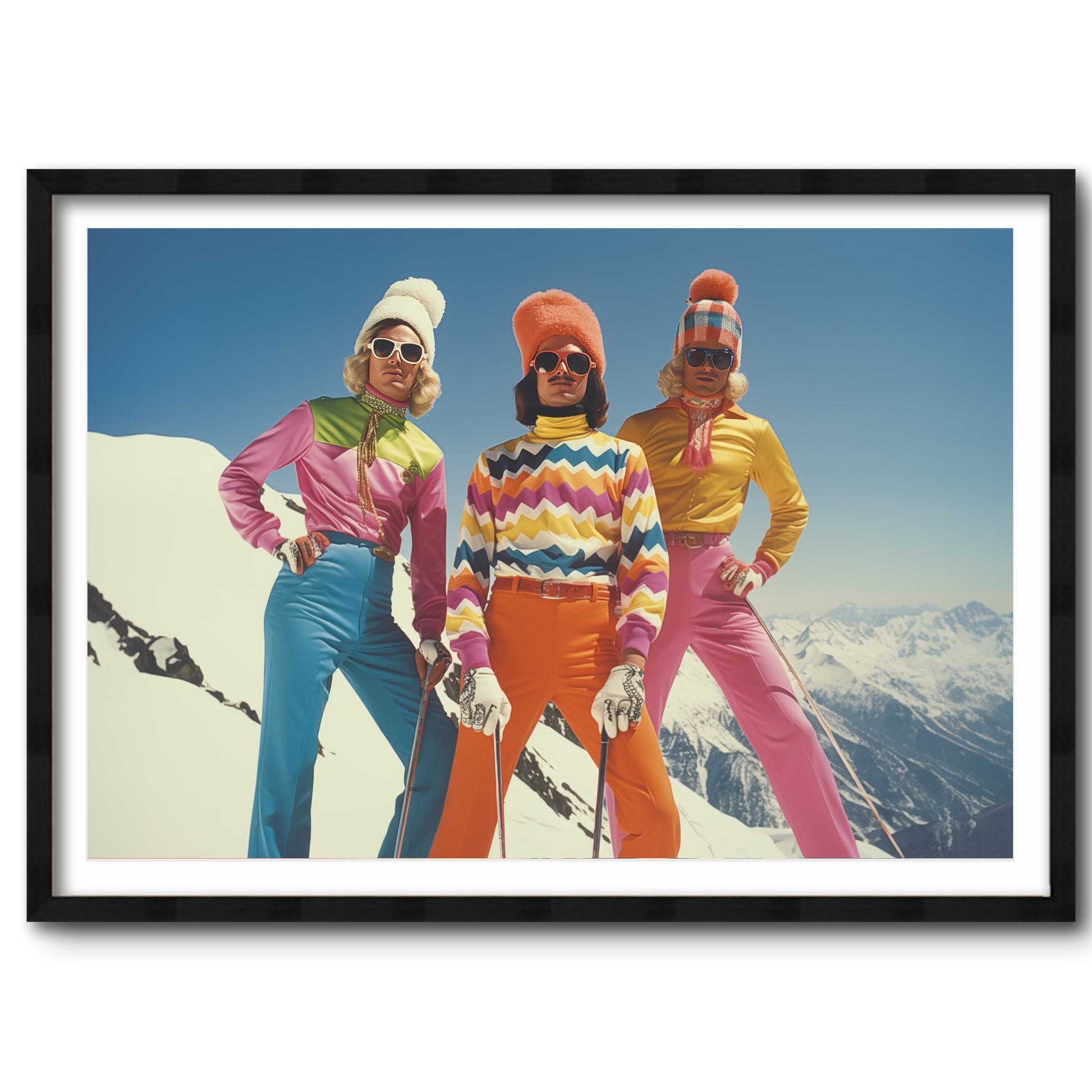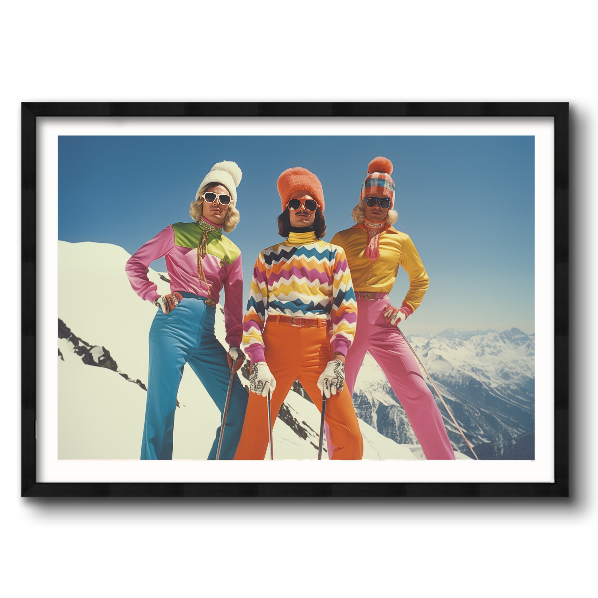 Raise a toast to those glamorous days gone by. In the days of disco and 'Here Comes the Sun' on the radio, three stylish daredevils glide down the slopes, in a rhythmic Bee Gees flow. Skiing in Jackson Hole, in the '70s, pure gold...