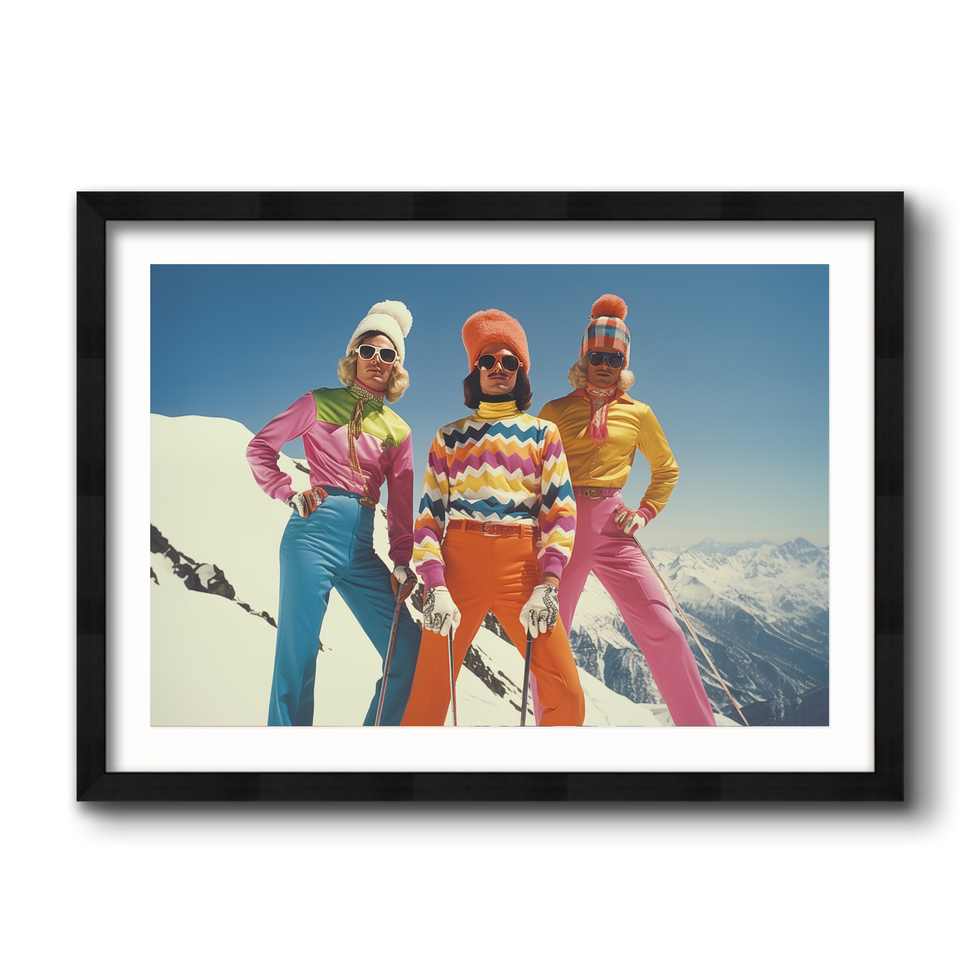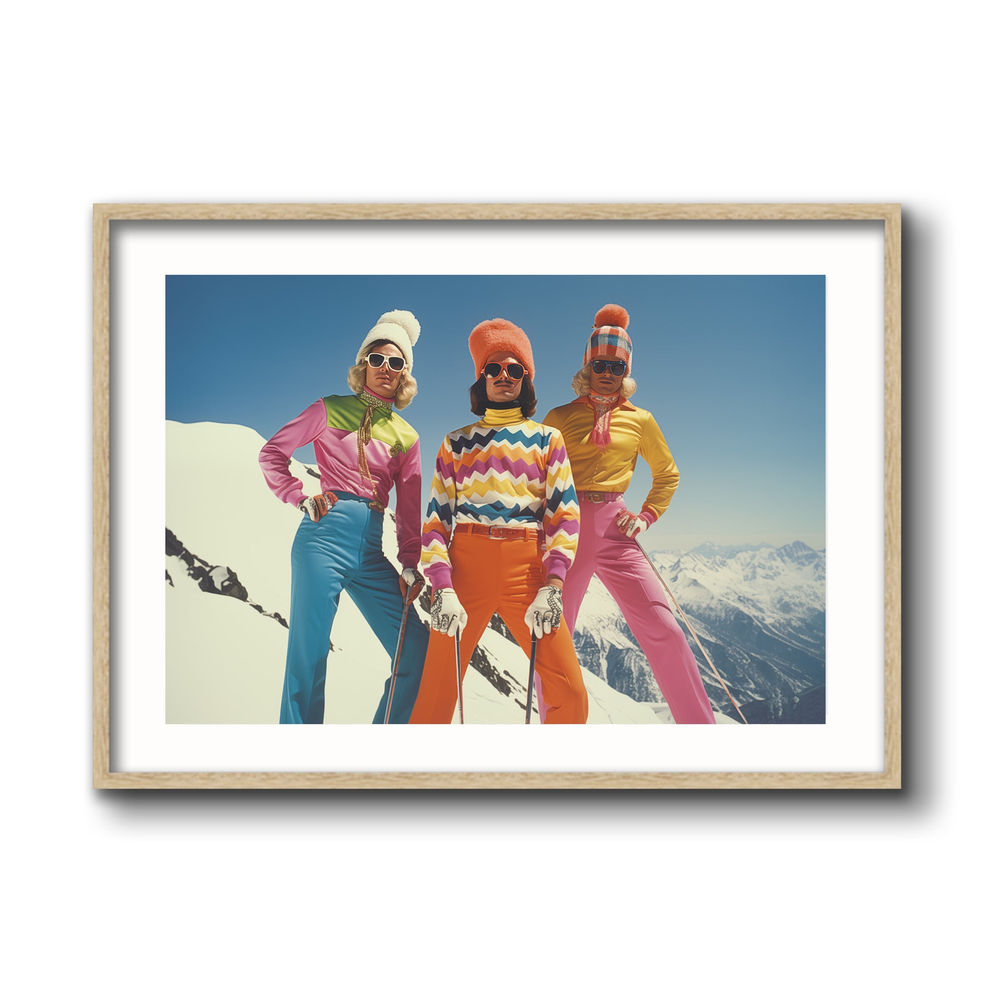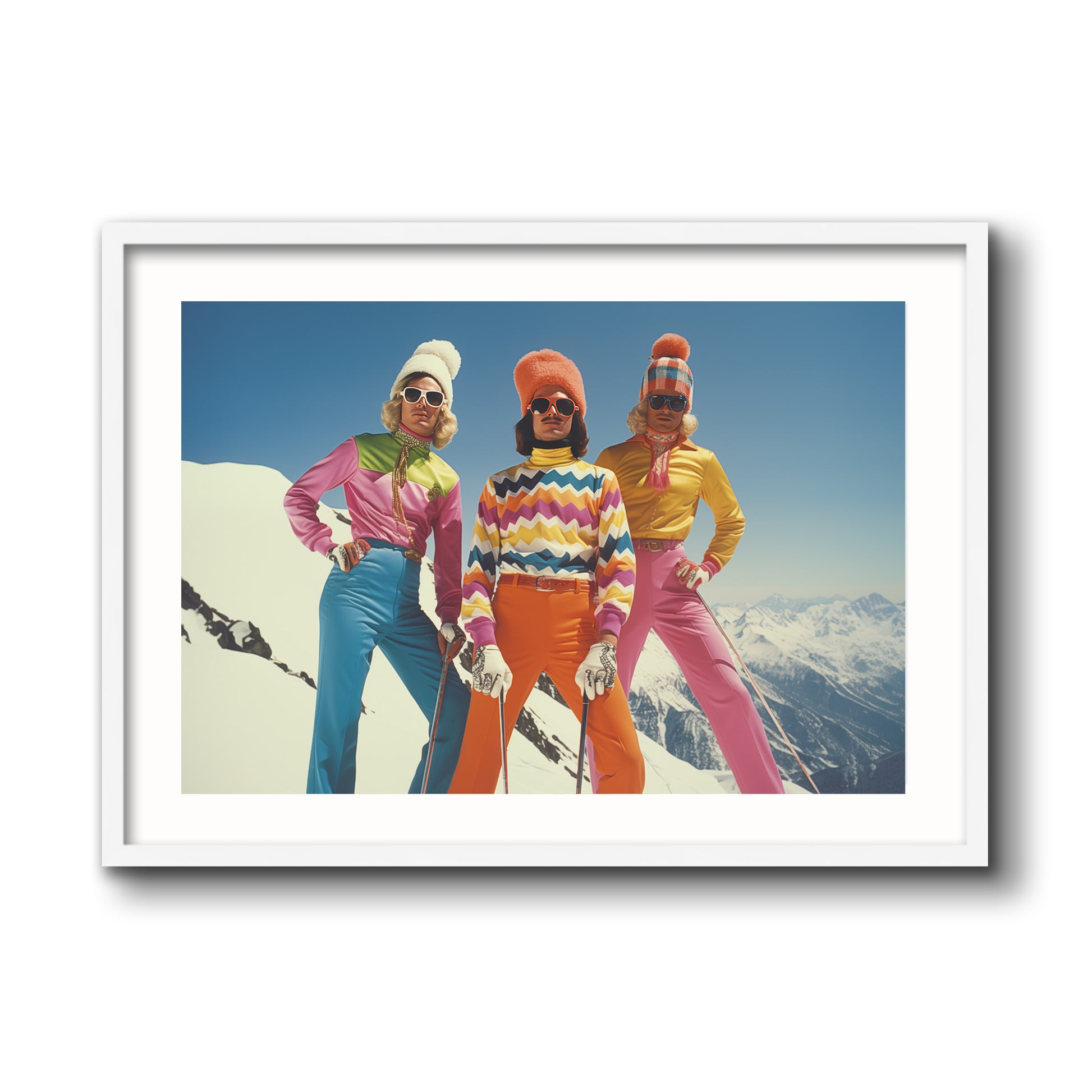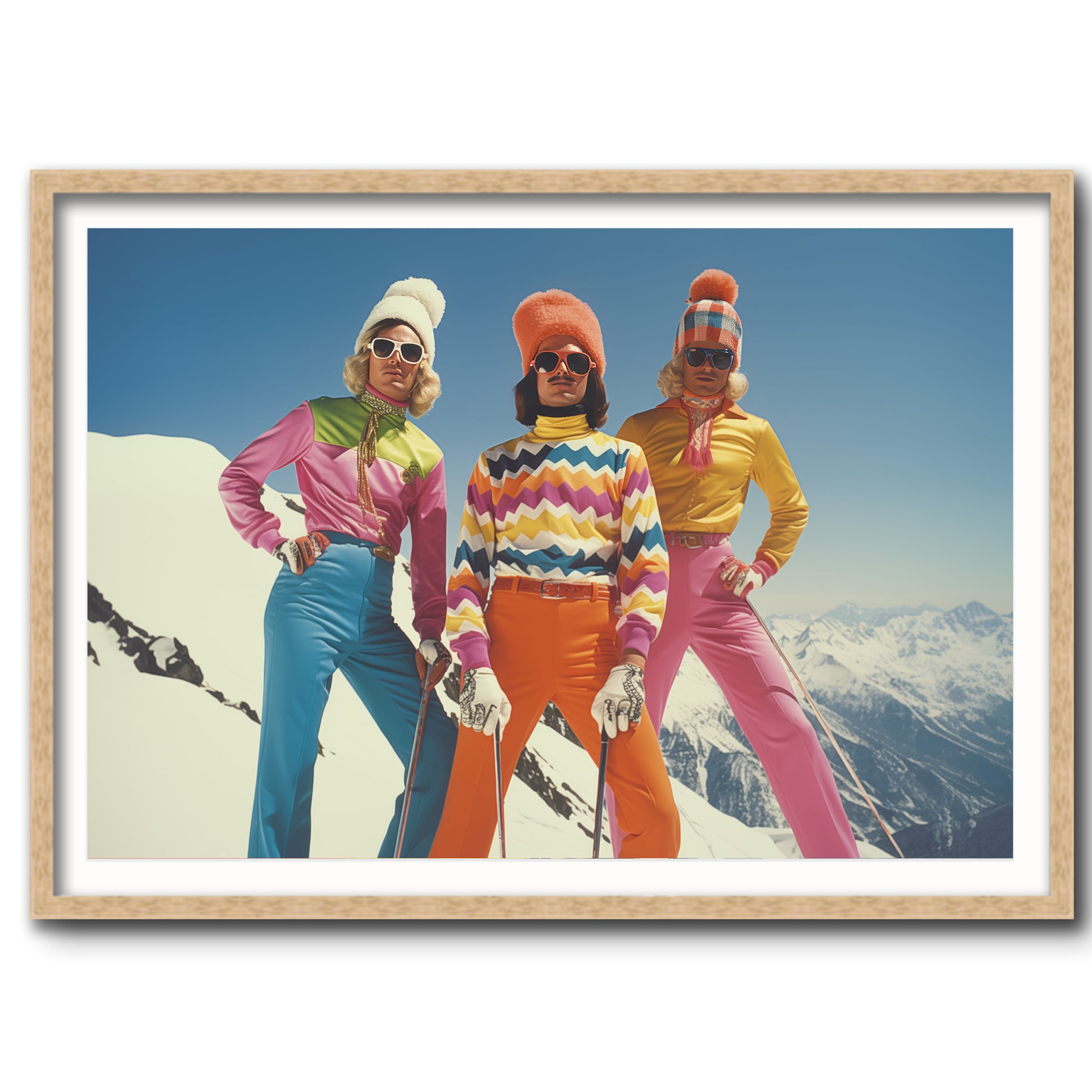 Raise a toast to those glamorous days gone by. In the days of disco and 'Here Comes the Sun' on the radio, three stylish daredevils glide down the slopes, in a rhythmic Bee Gees flow. Skiing in Jackson Hole, in the '70s, pure gold...