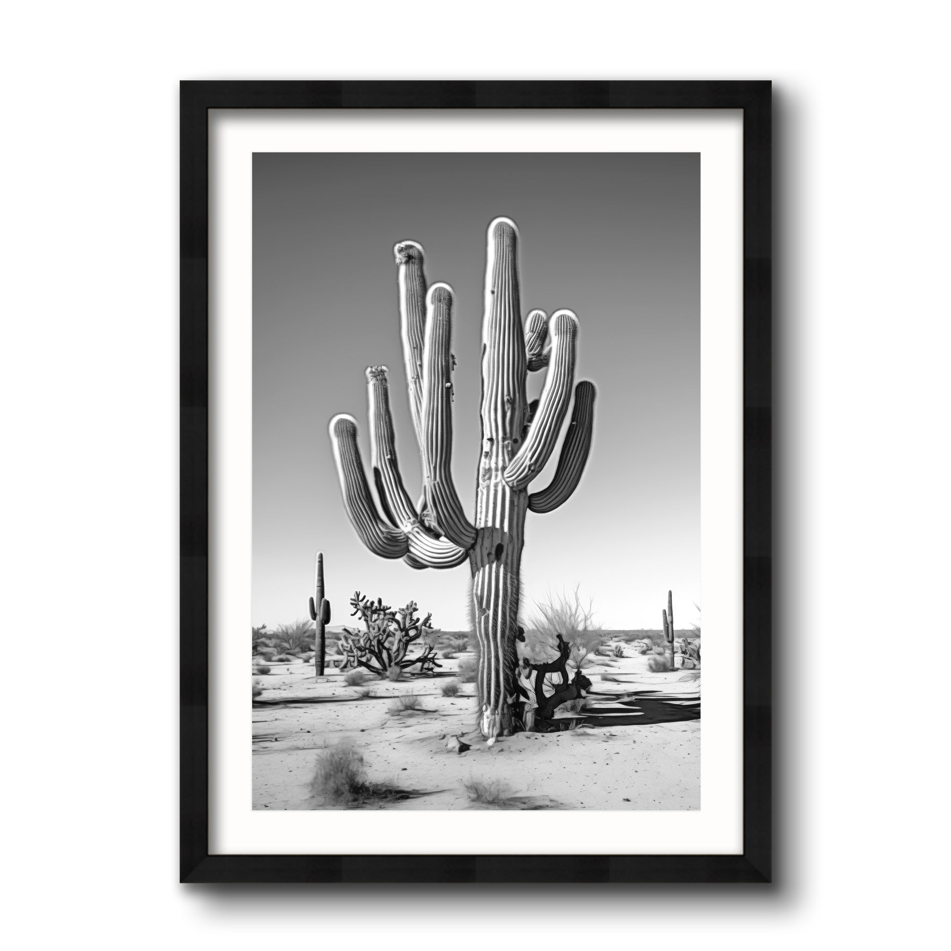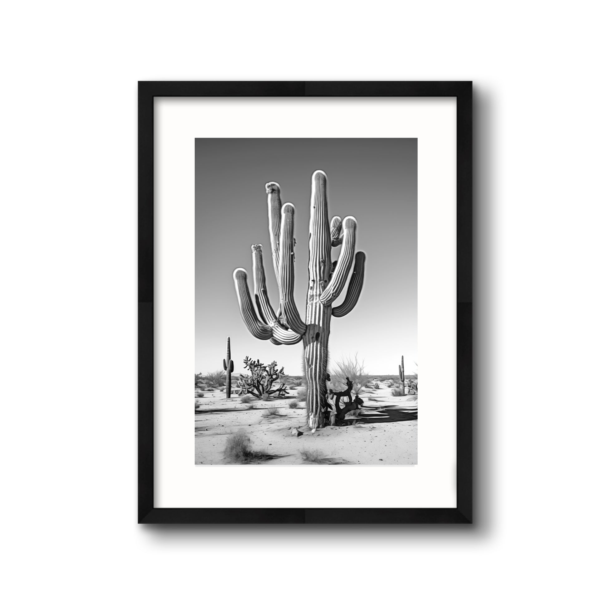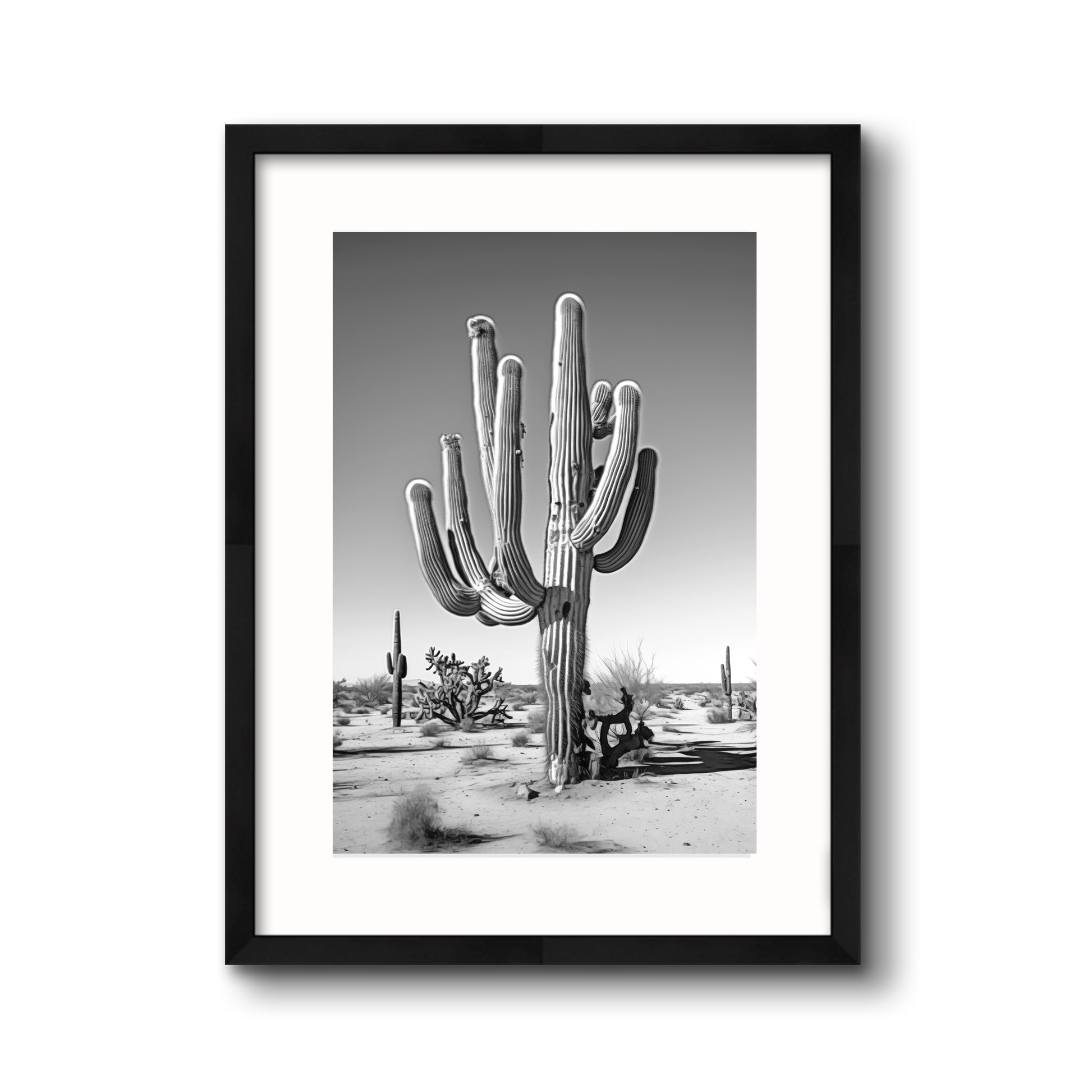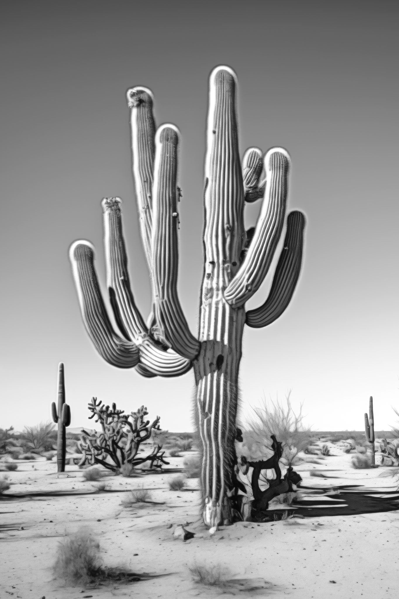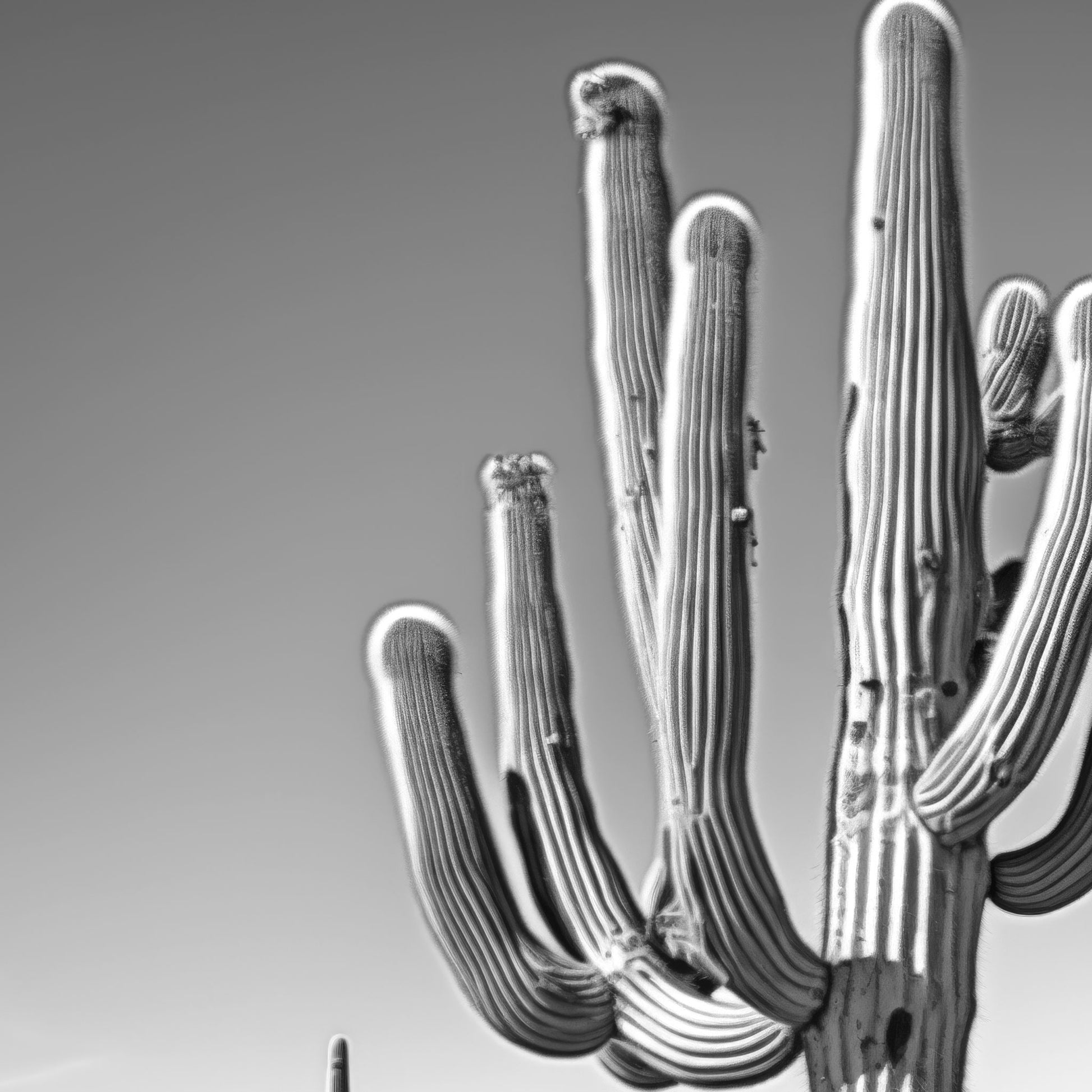 Black & White Photograph of a saguaro cactus in the Arizona desert.