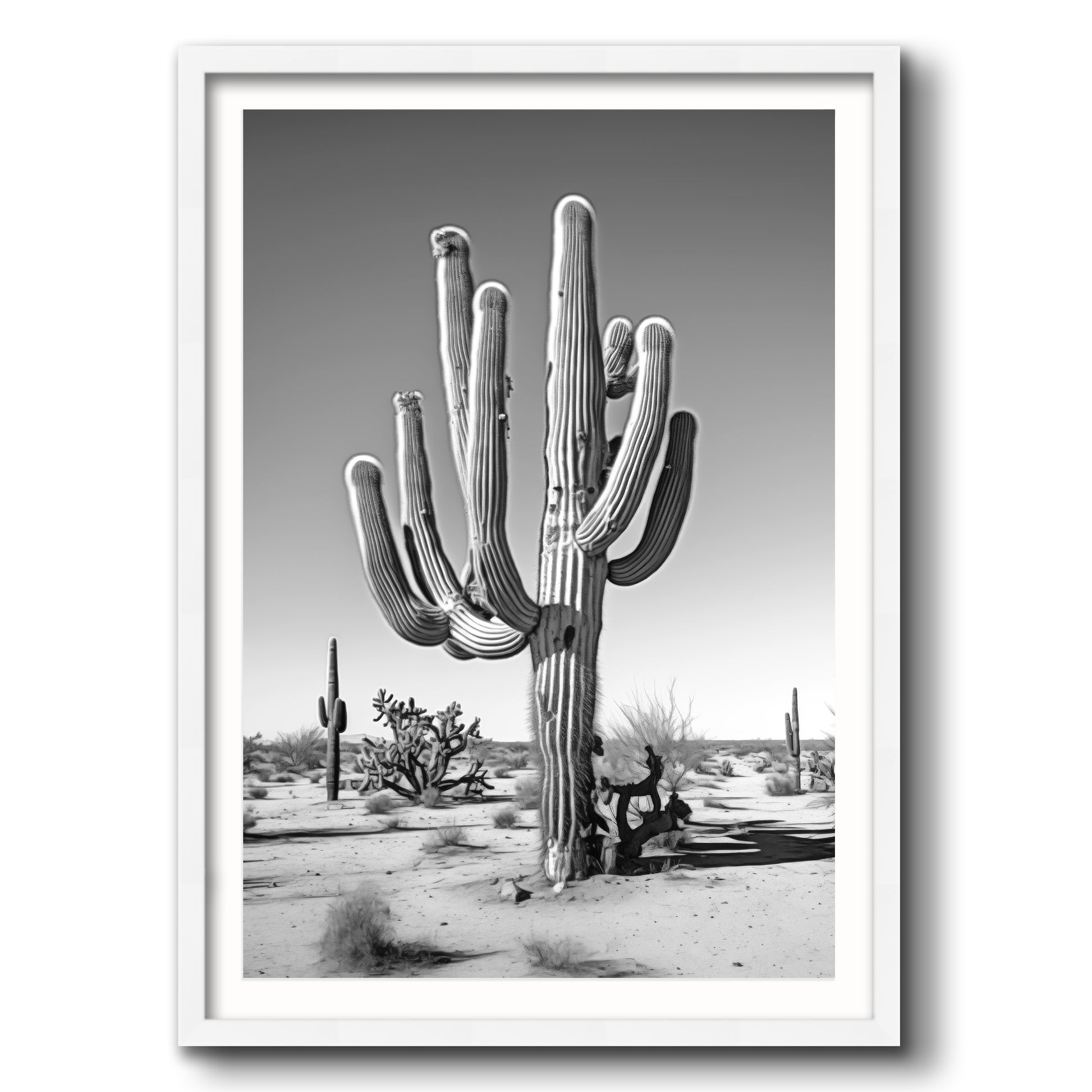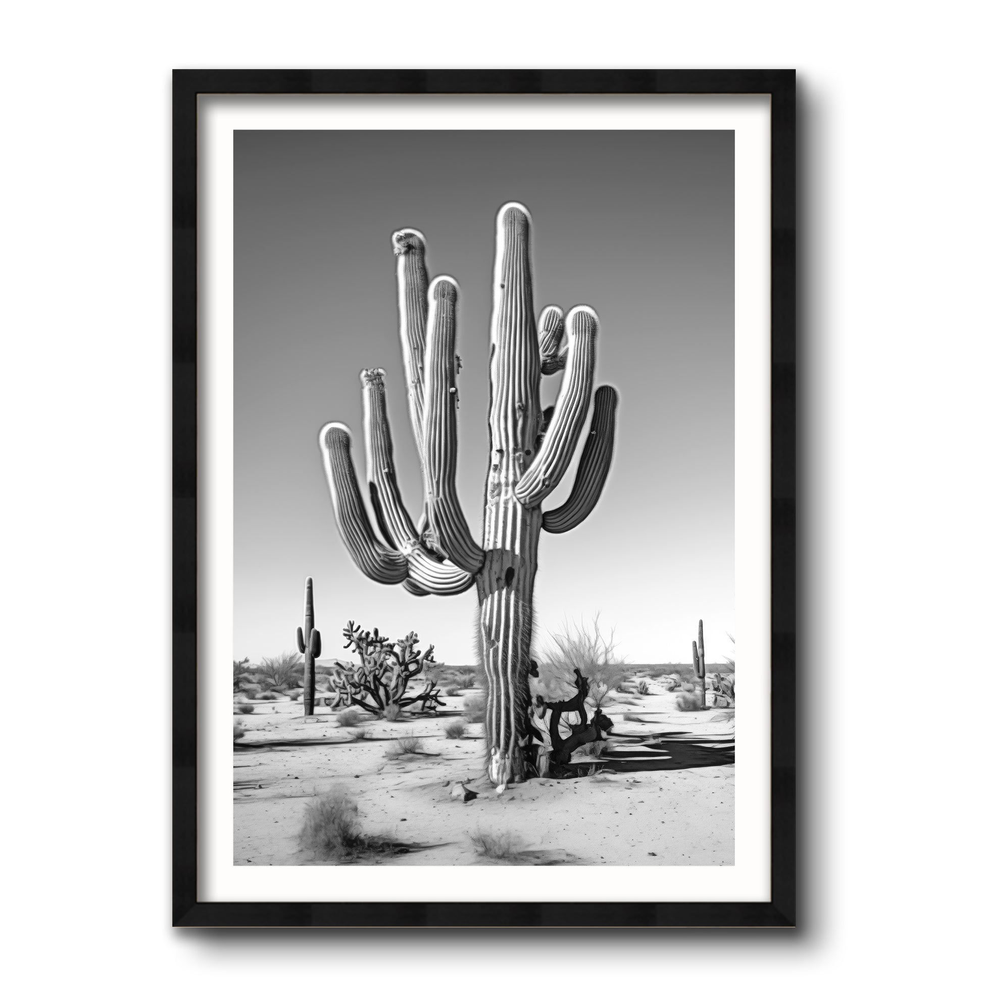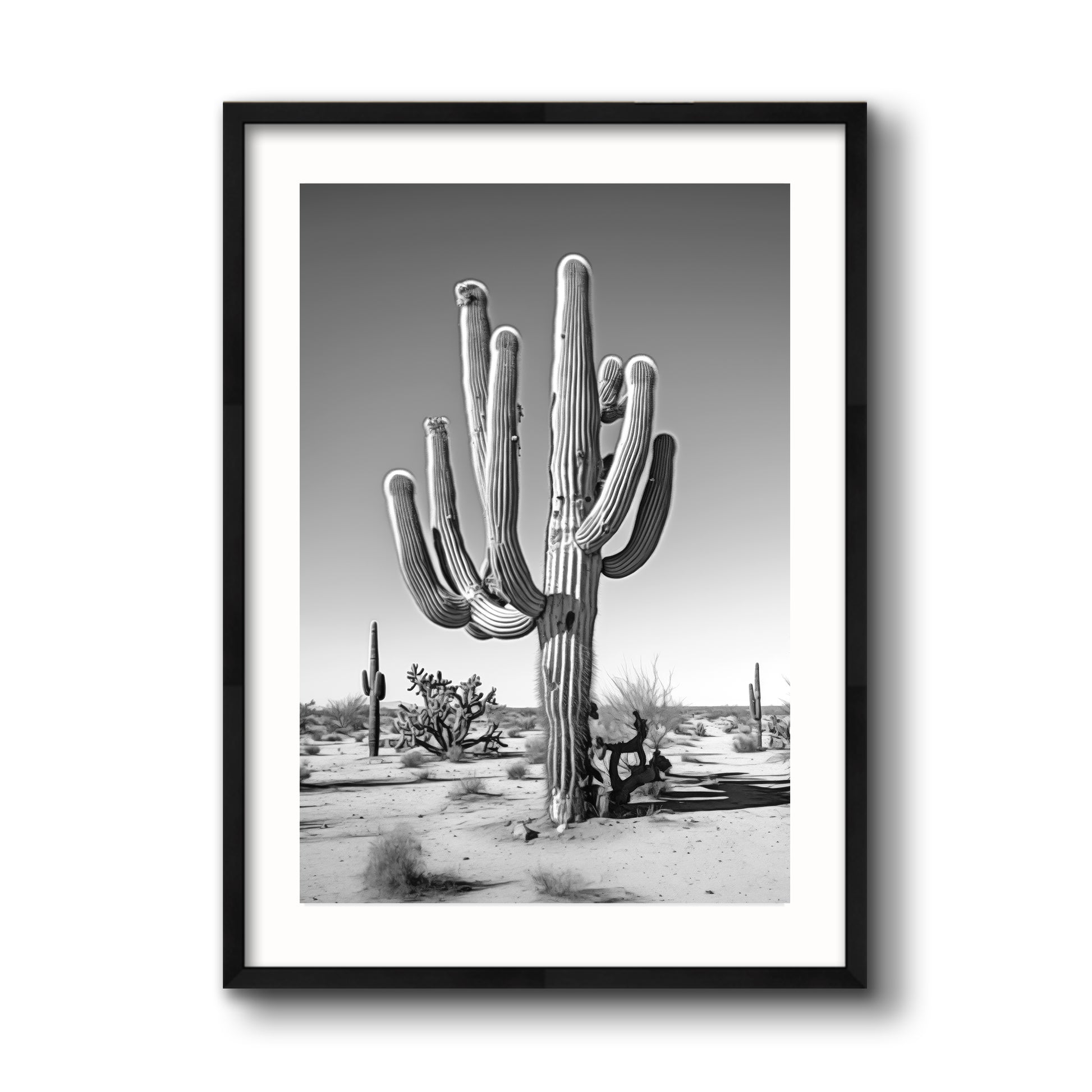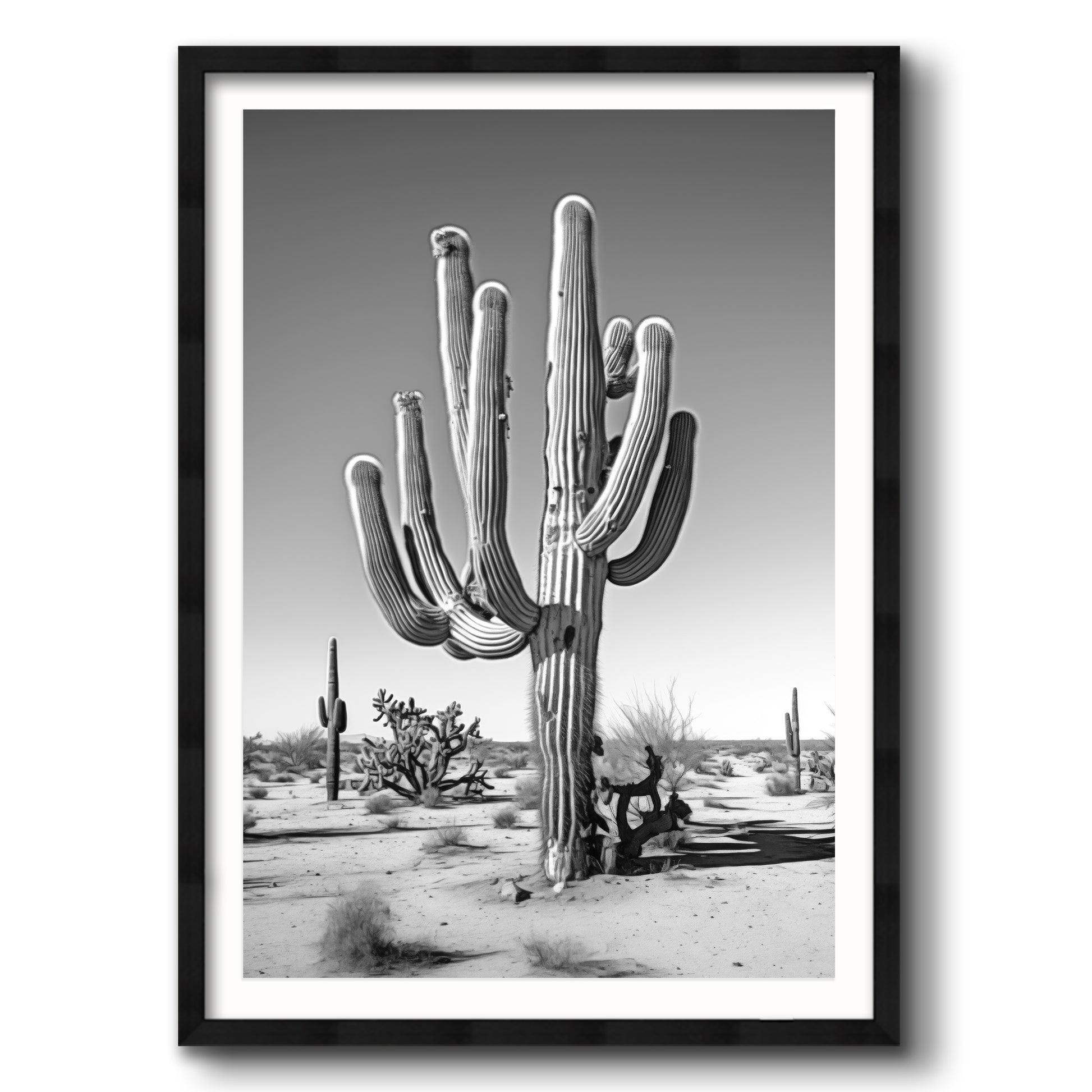 Black & White Photograph of a saguaro cactus in the Arizona desert.