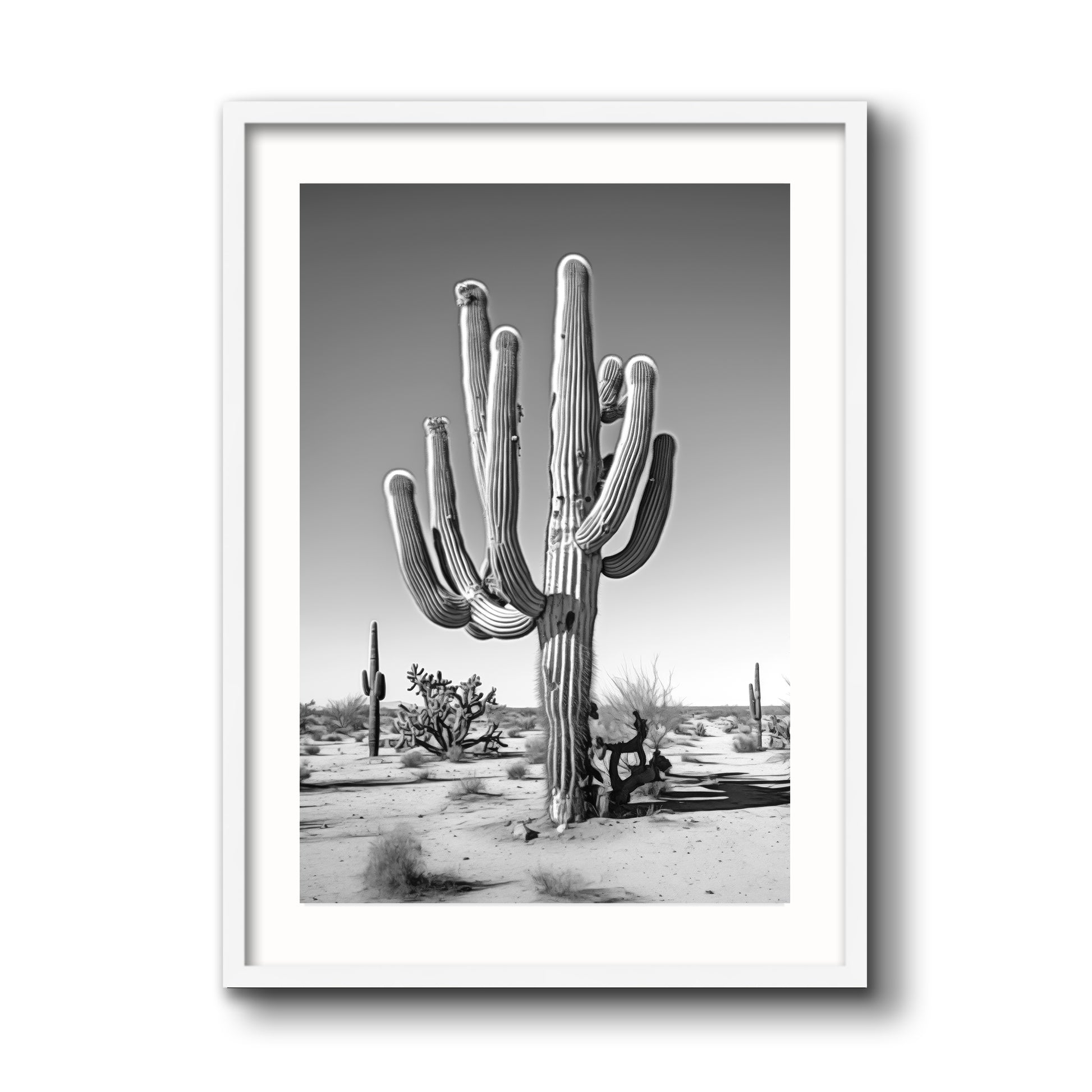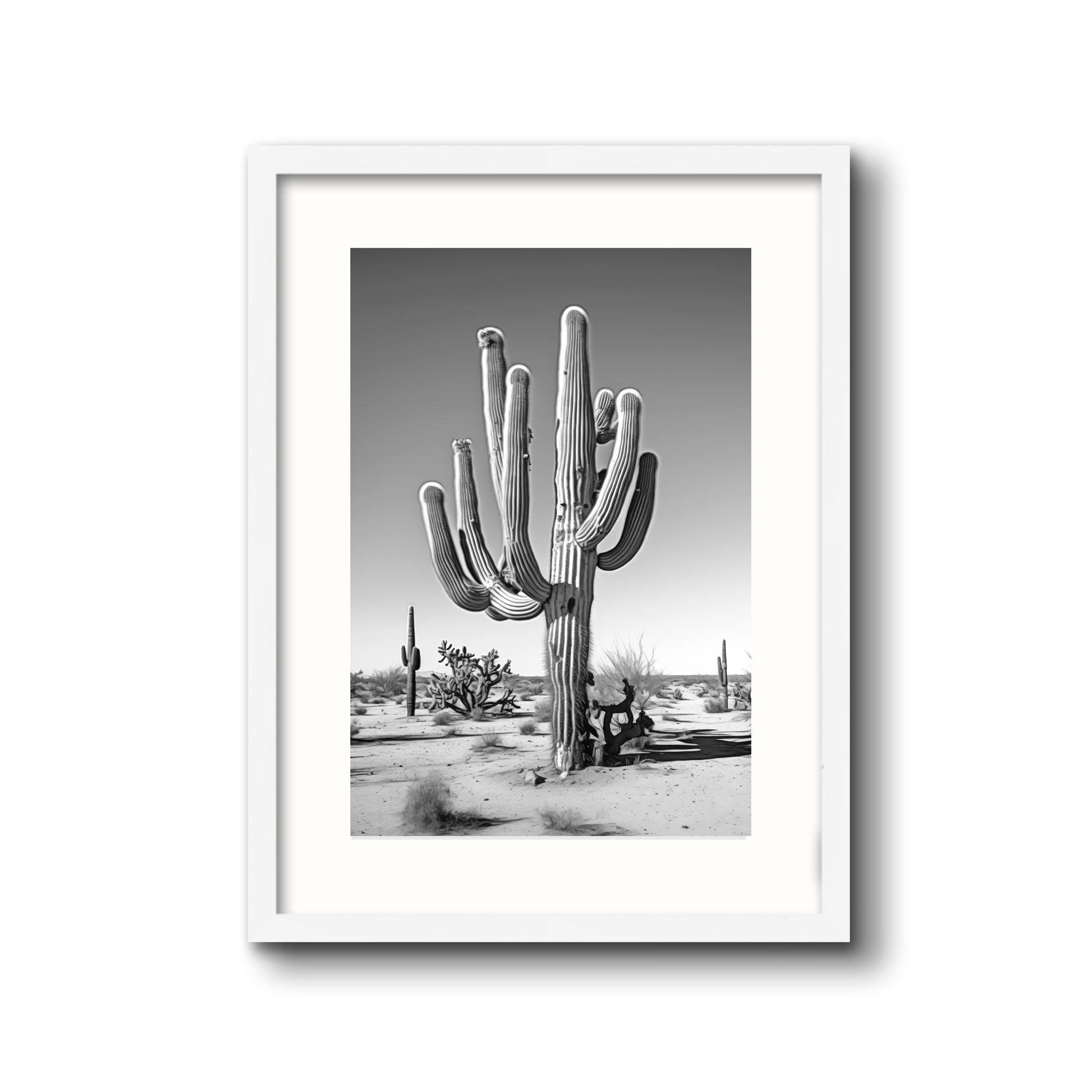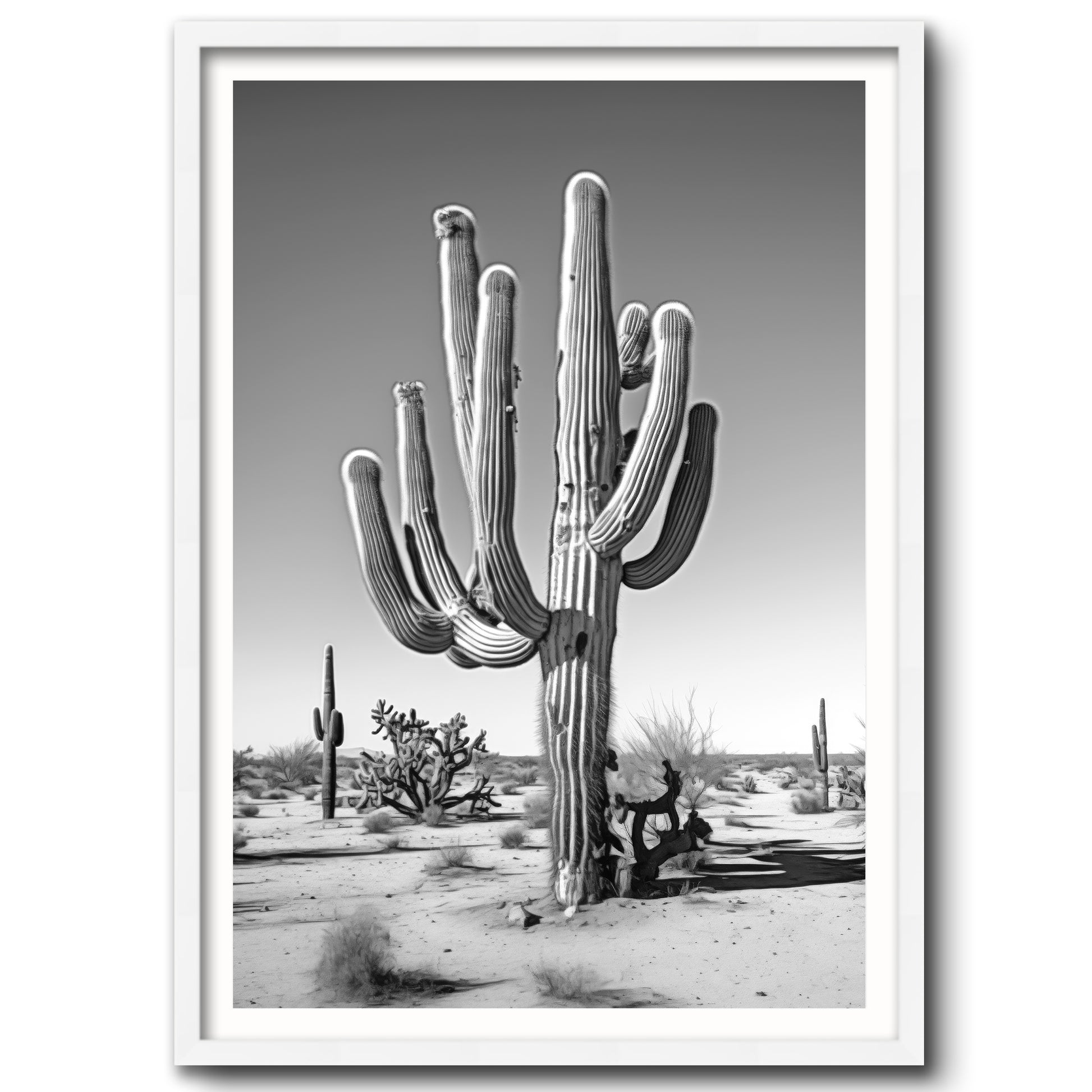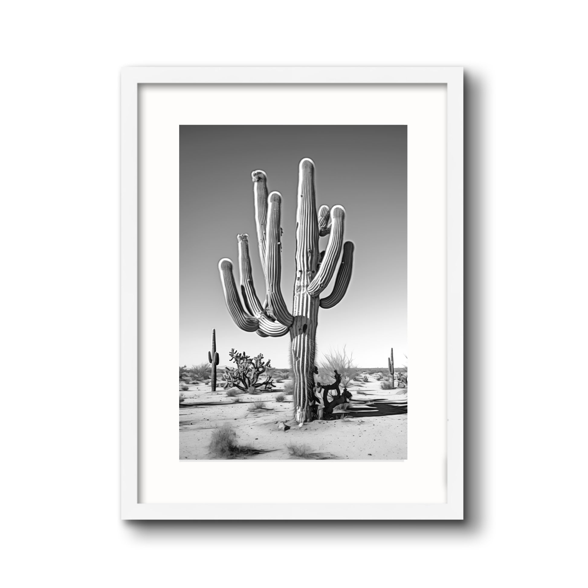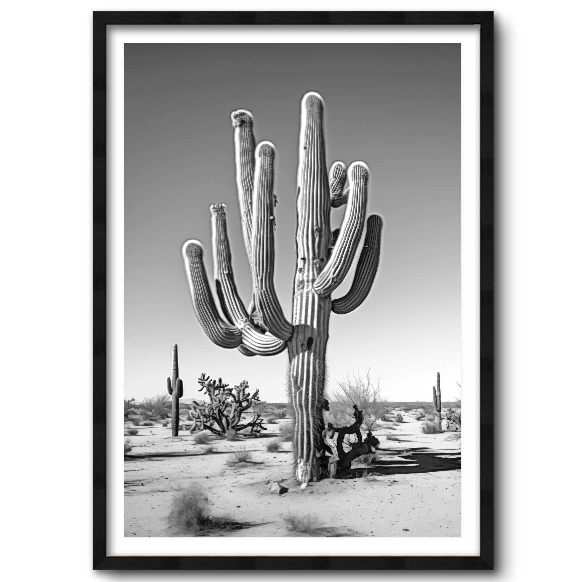 Black & White Photograph of a saguaro cactus in the Arizona desert.