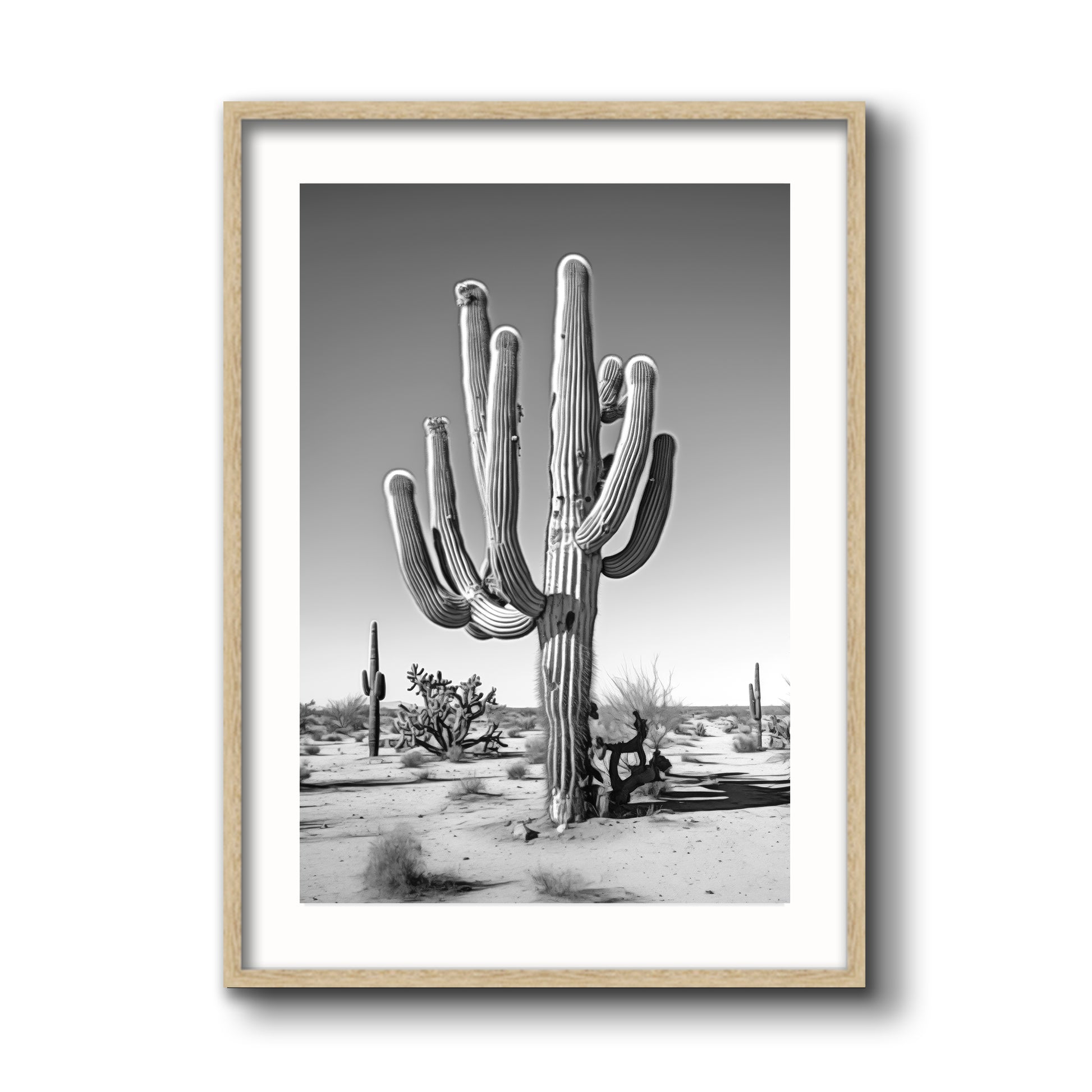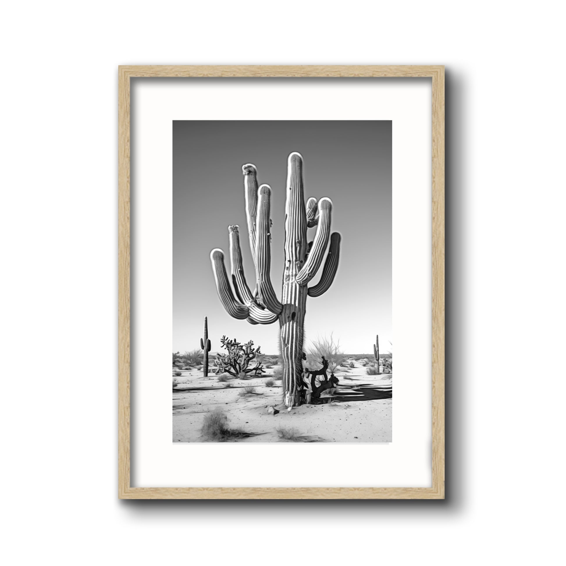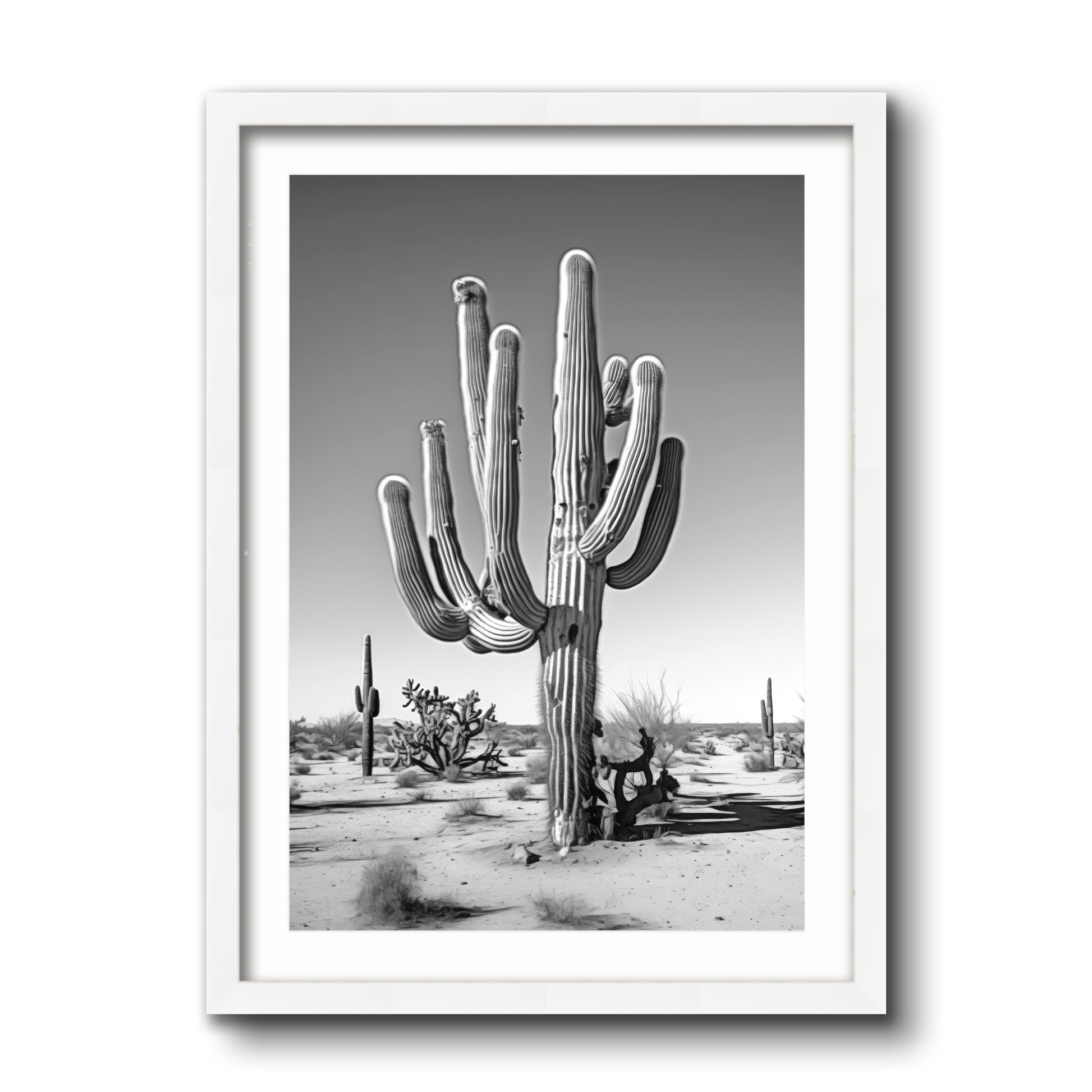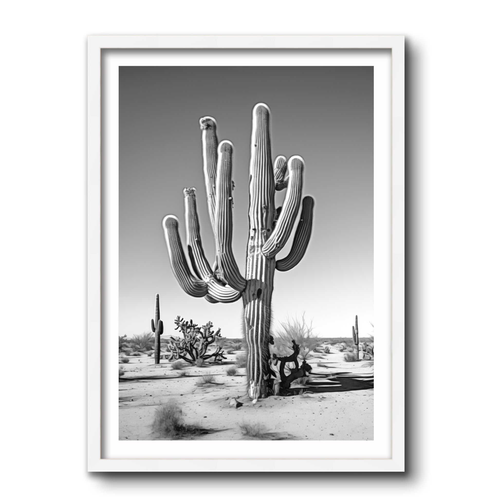 Black & White Photograph of a saguaro cactus in the Arizona desert.