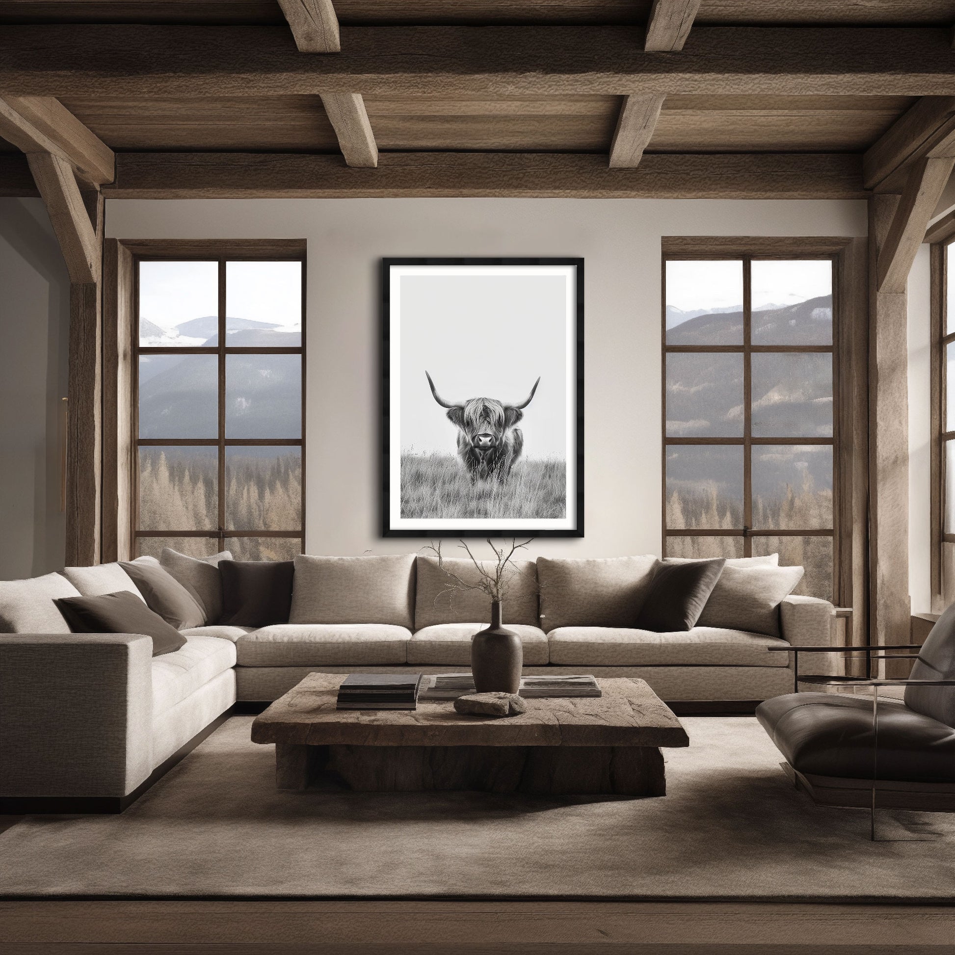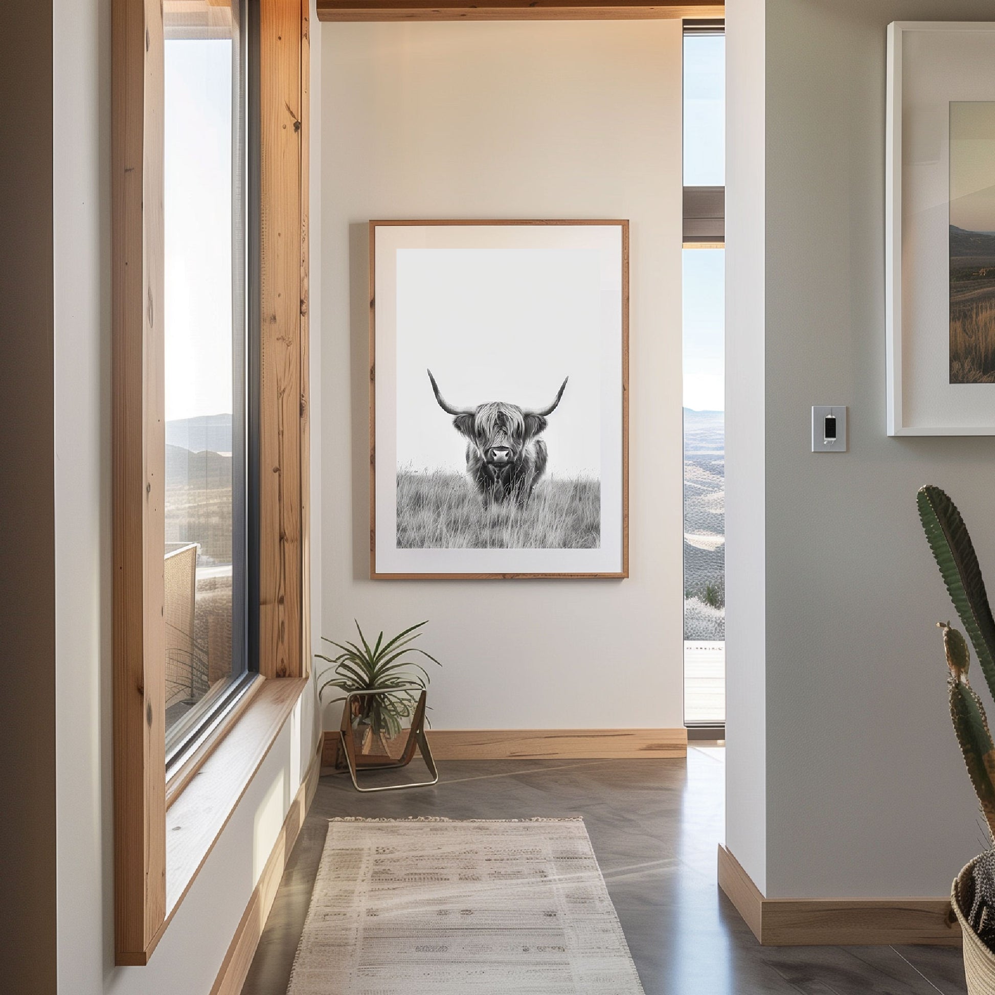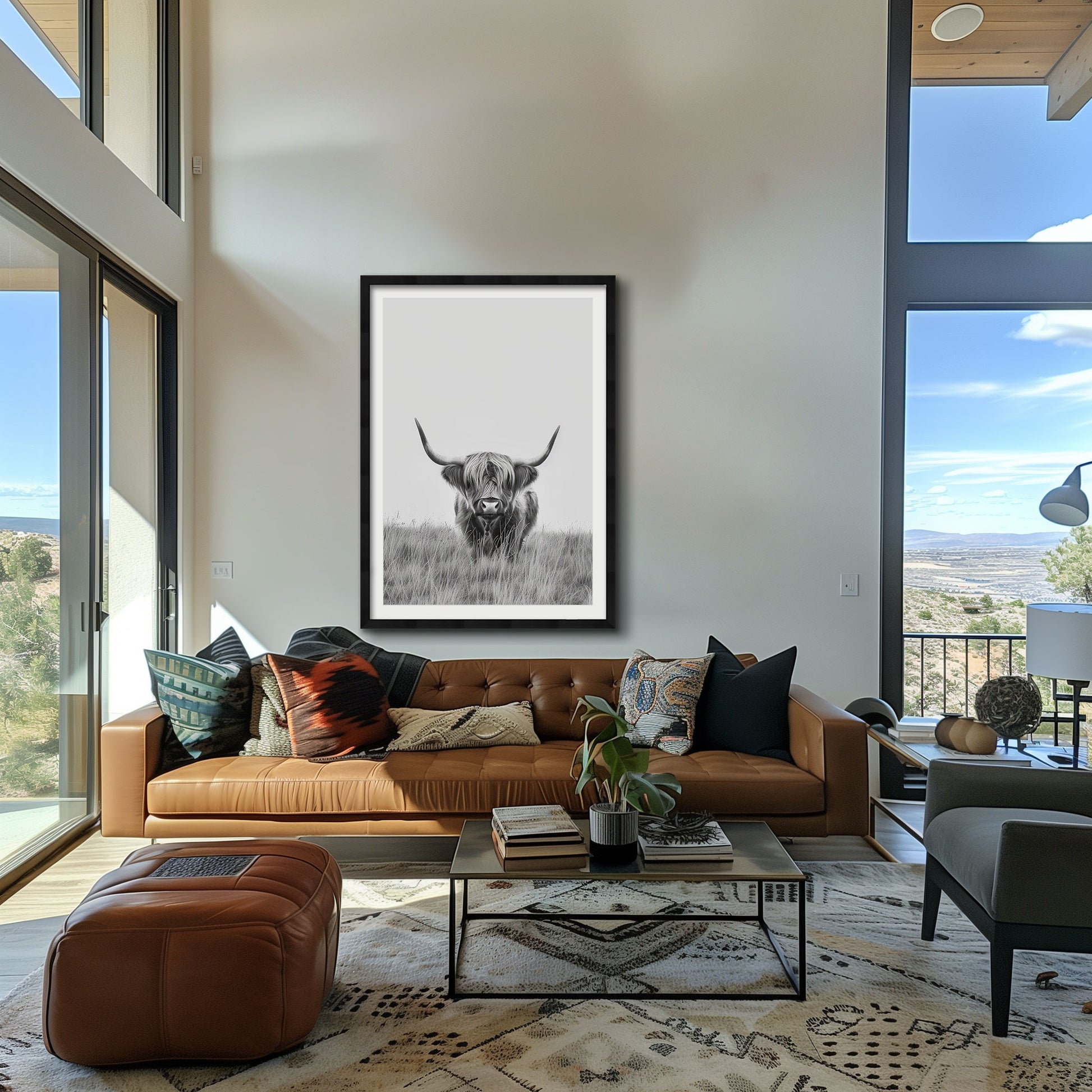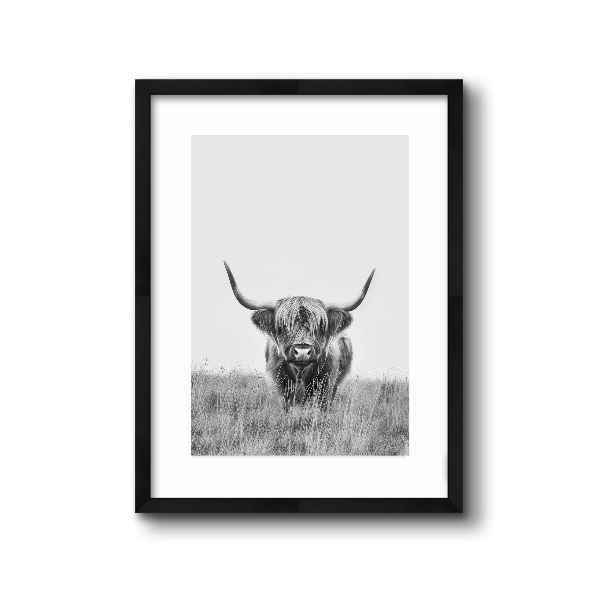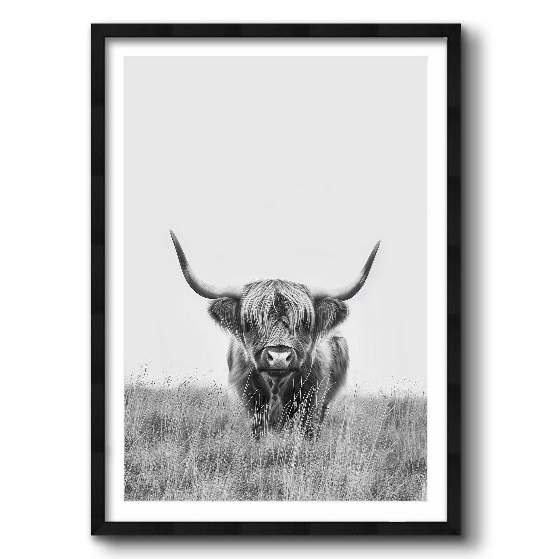 Black & White Framed Wall Art Photography of a Scottish Highland cow, Idaho