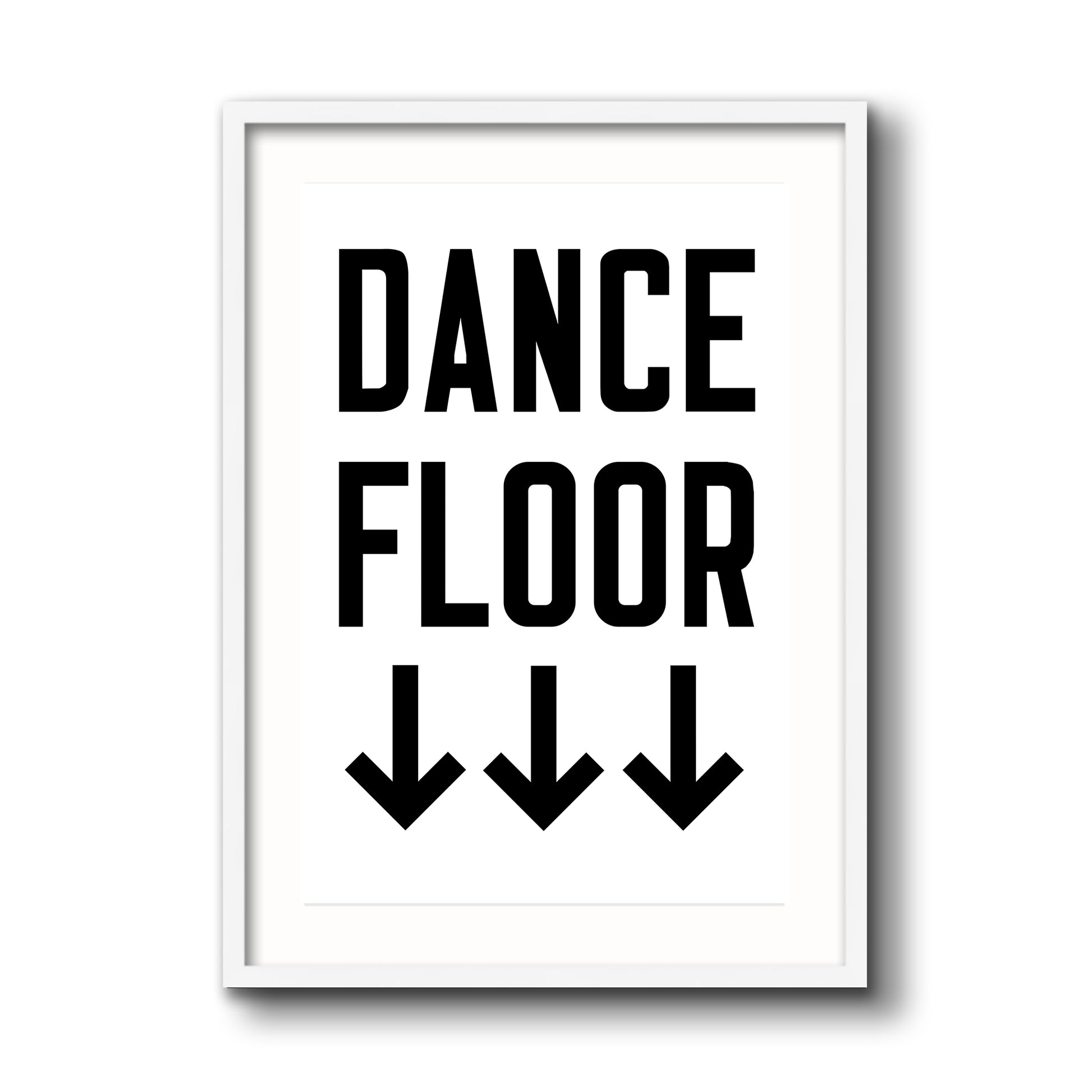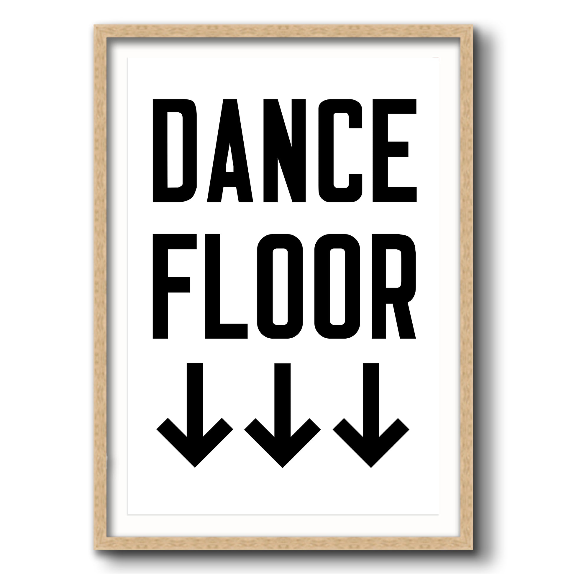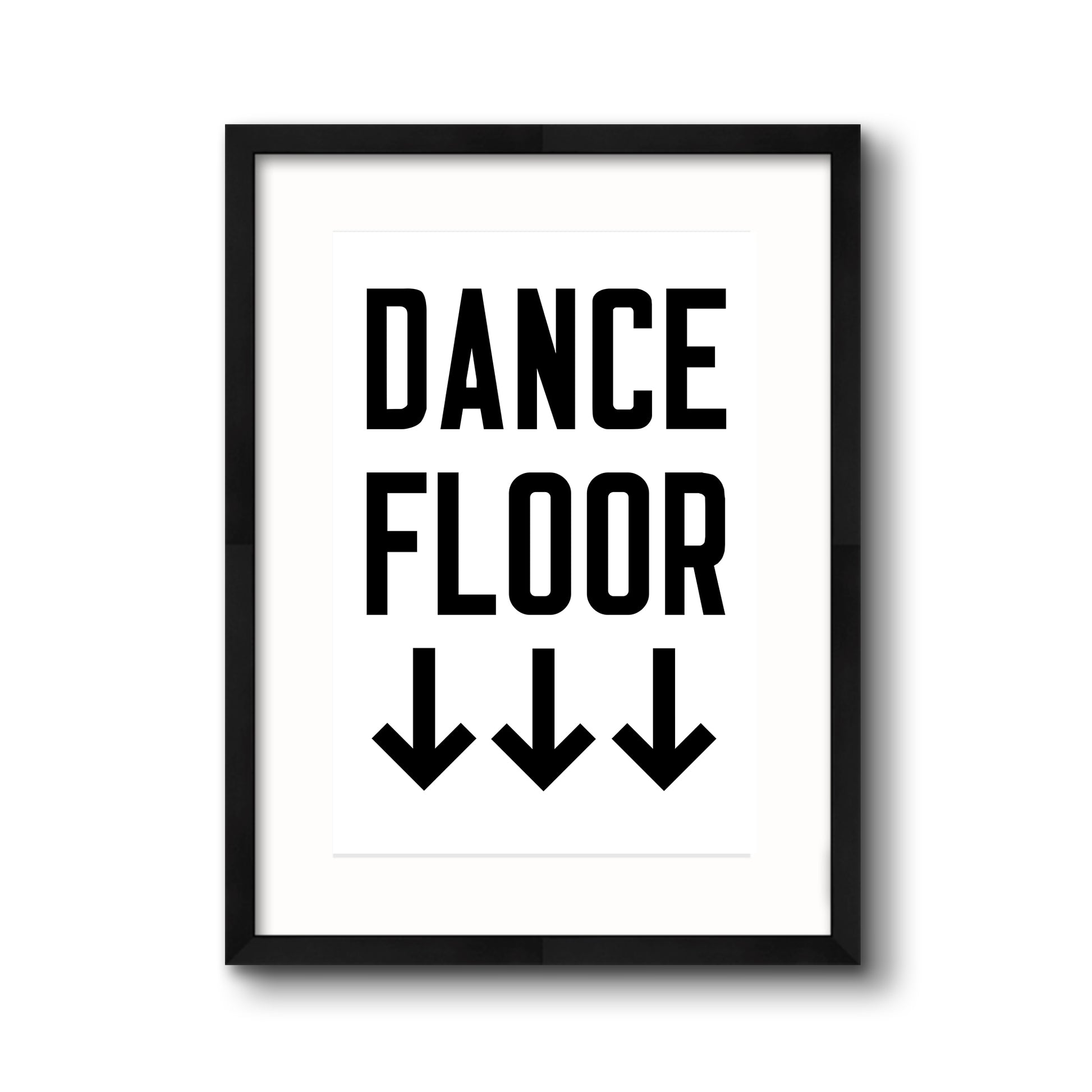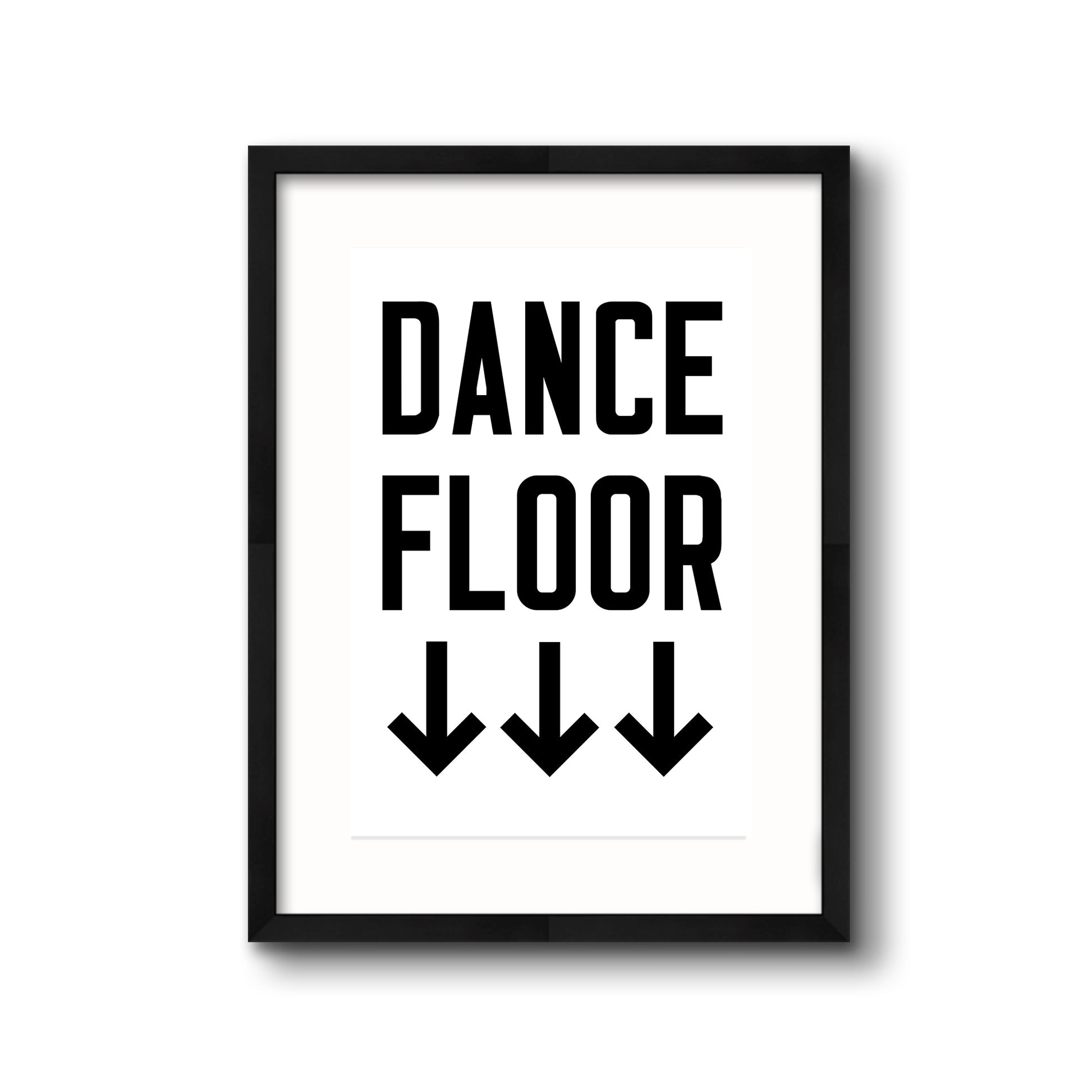 Dance Floor sign print with arrows pointing downward. Liven up your boring walls and encourage good vibes with this fun & playful typography art.