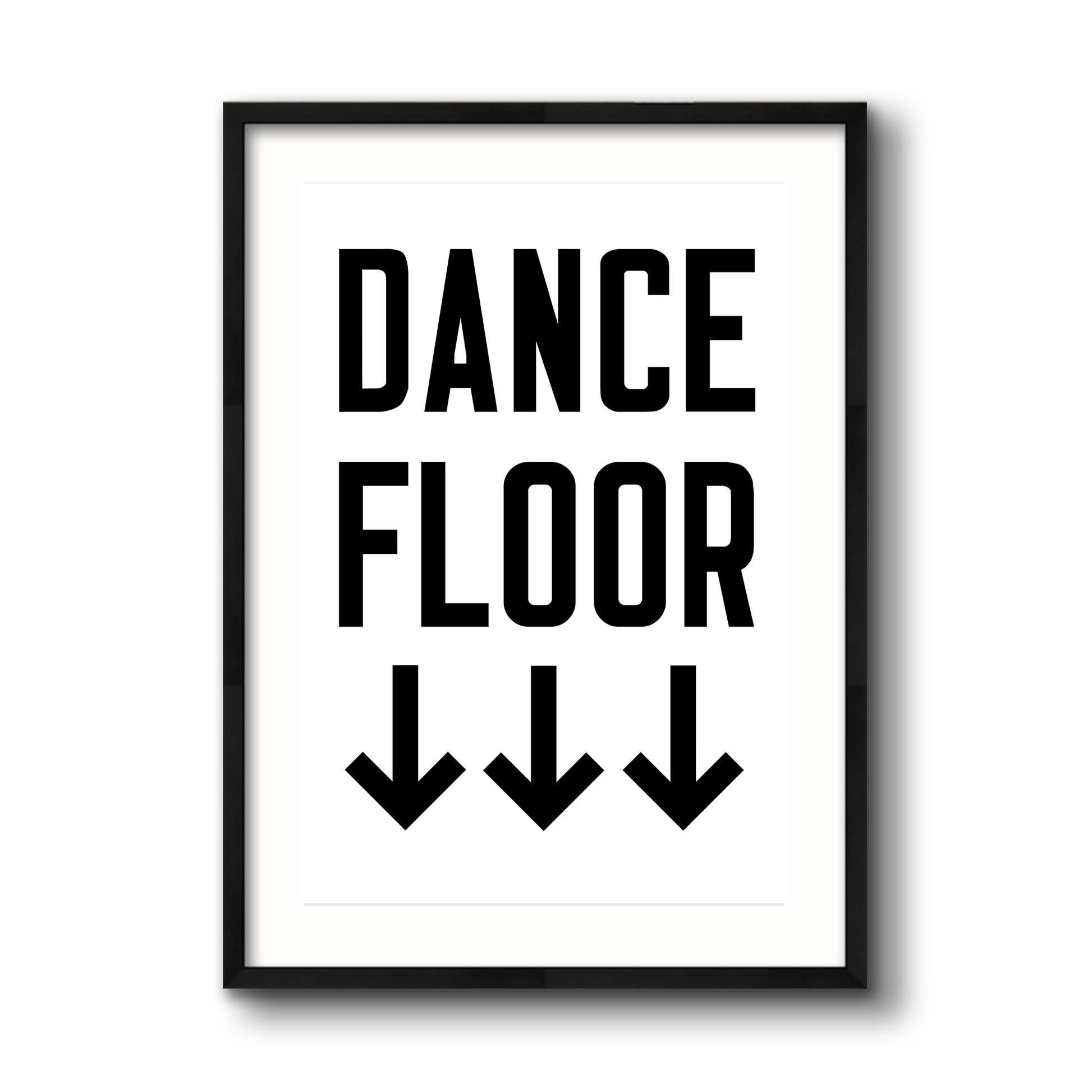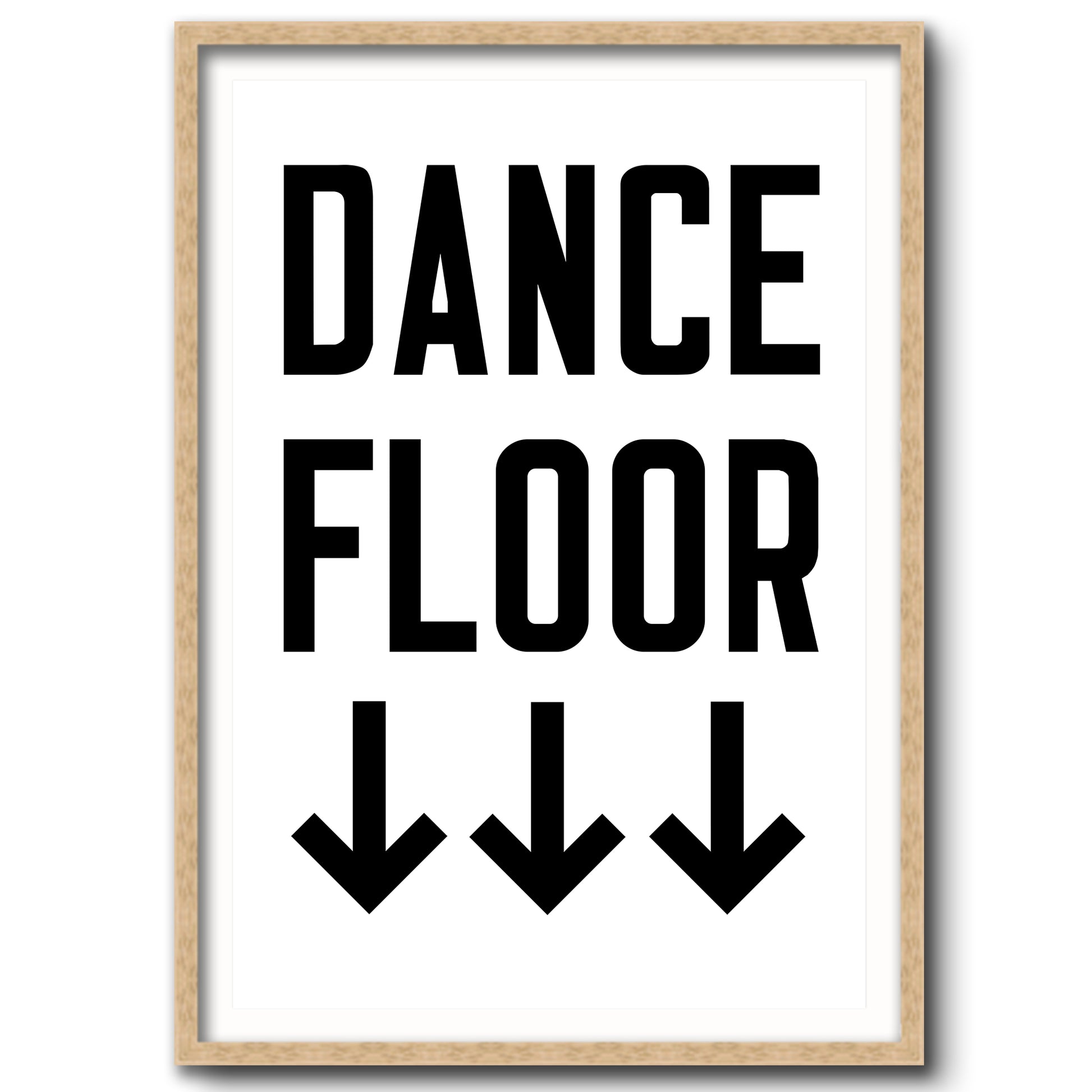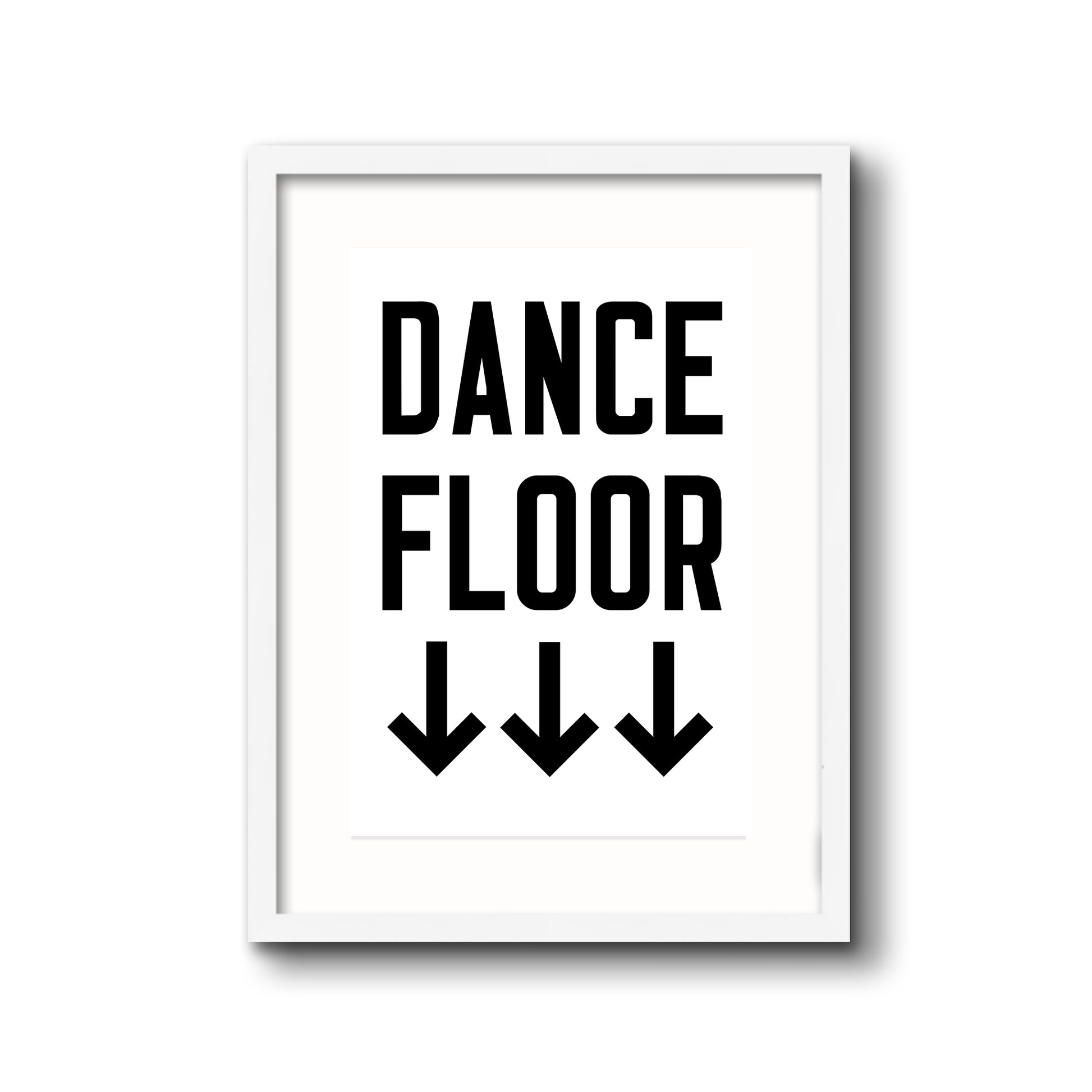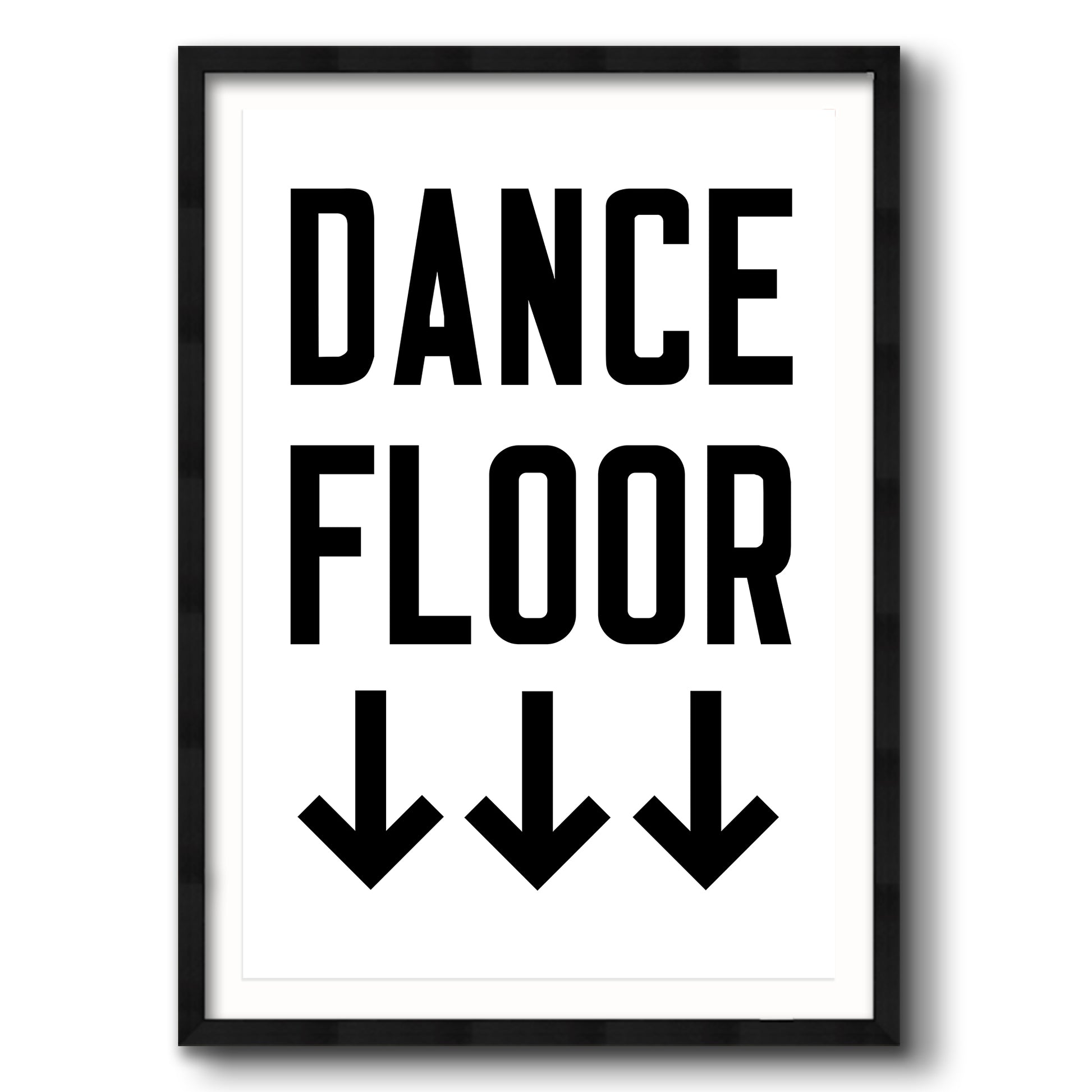 Dance Floor sign print with arrows pointing downward. Liven up your boring walls and encourage good vibes with this fun & playful typography art.